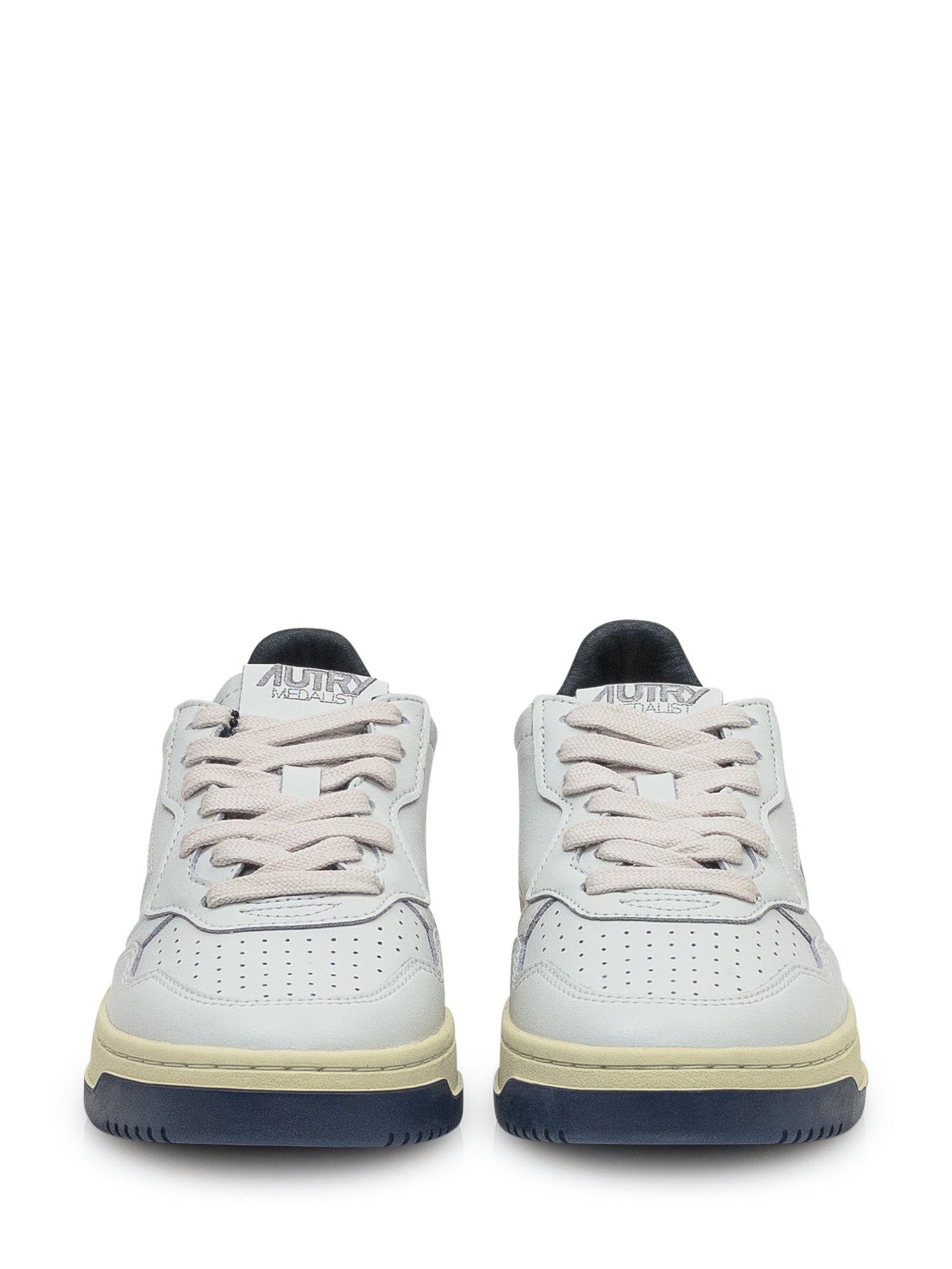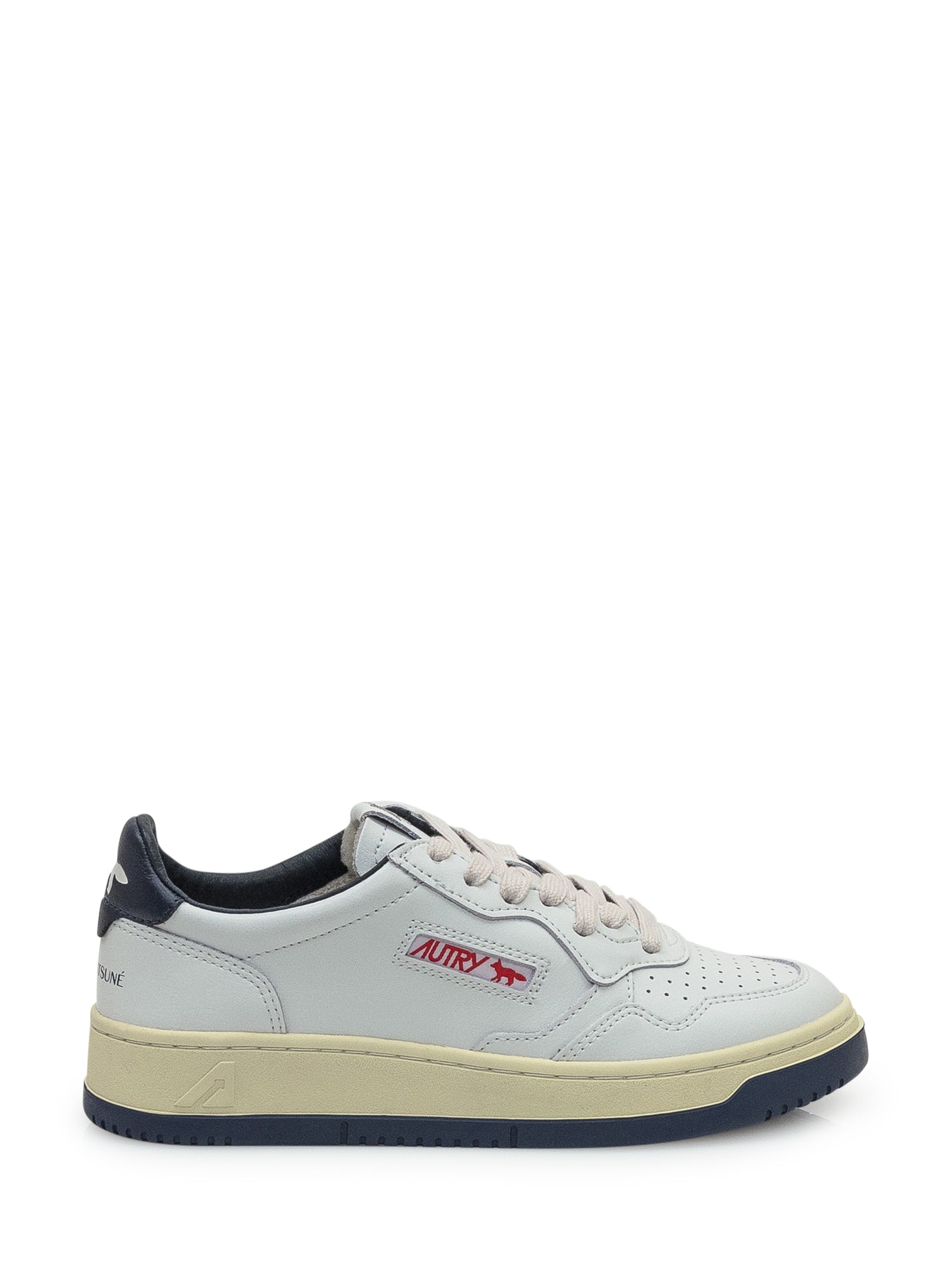 Sneakers bianche in pelle con dettagli blu navy e logo rosso.