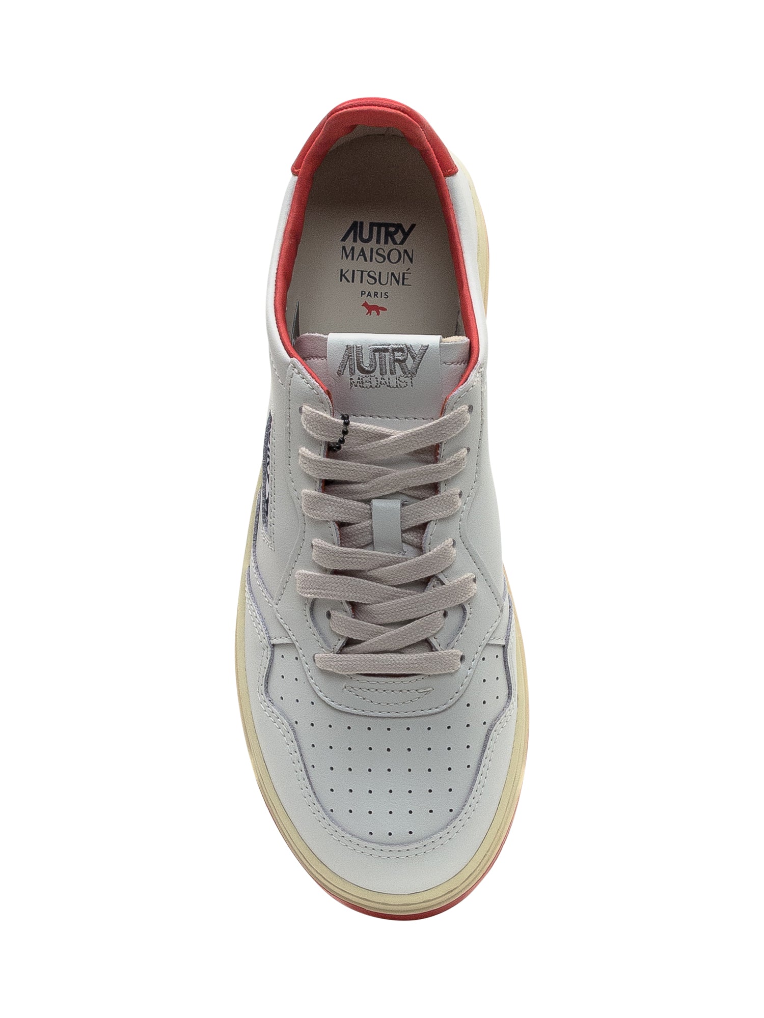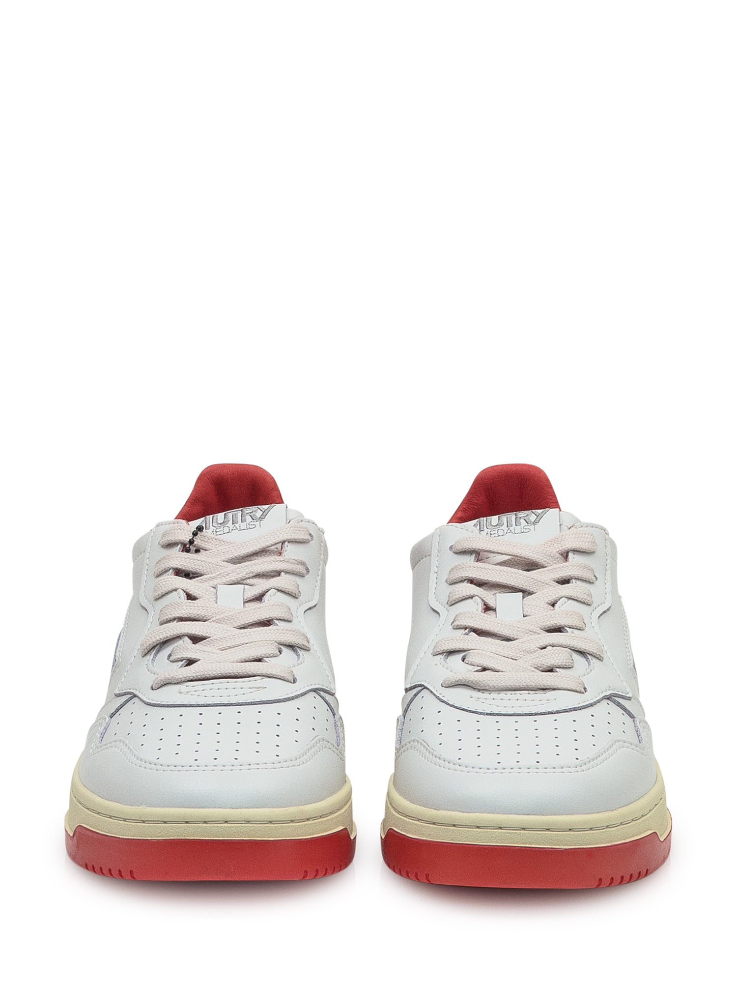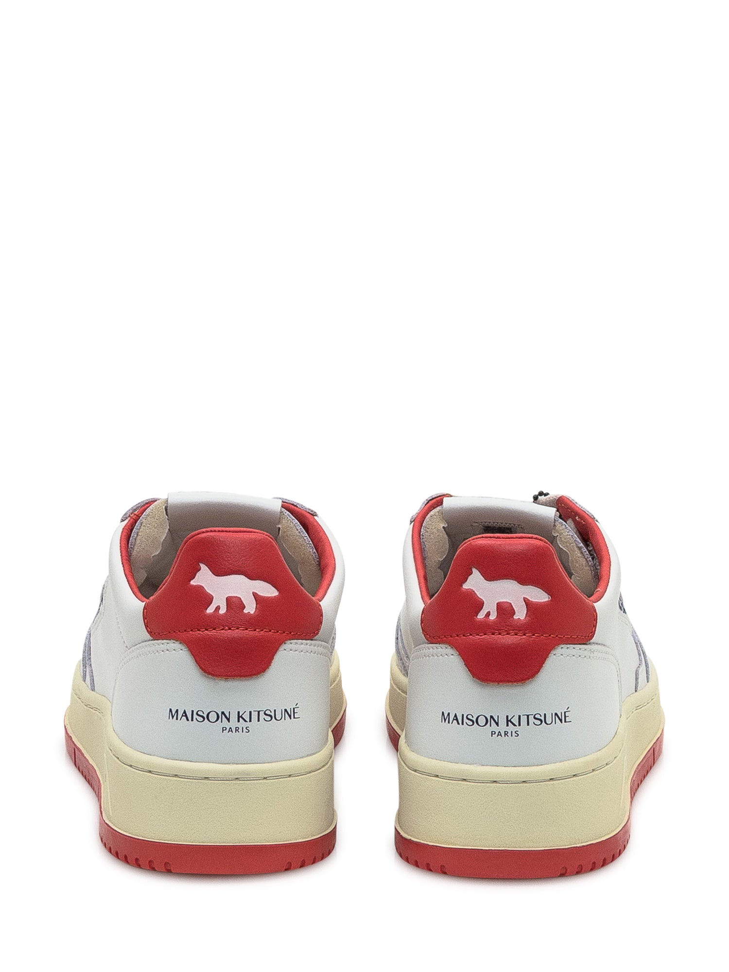 Sneakers bianche in pelle con inserti rossi e logo blu ricamato.