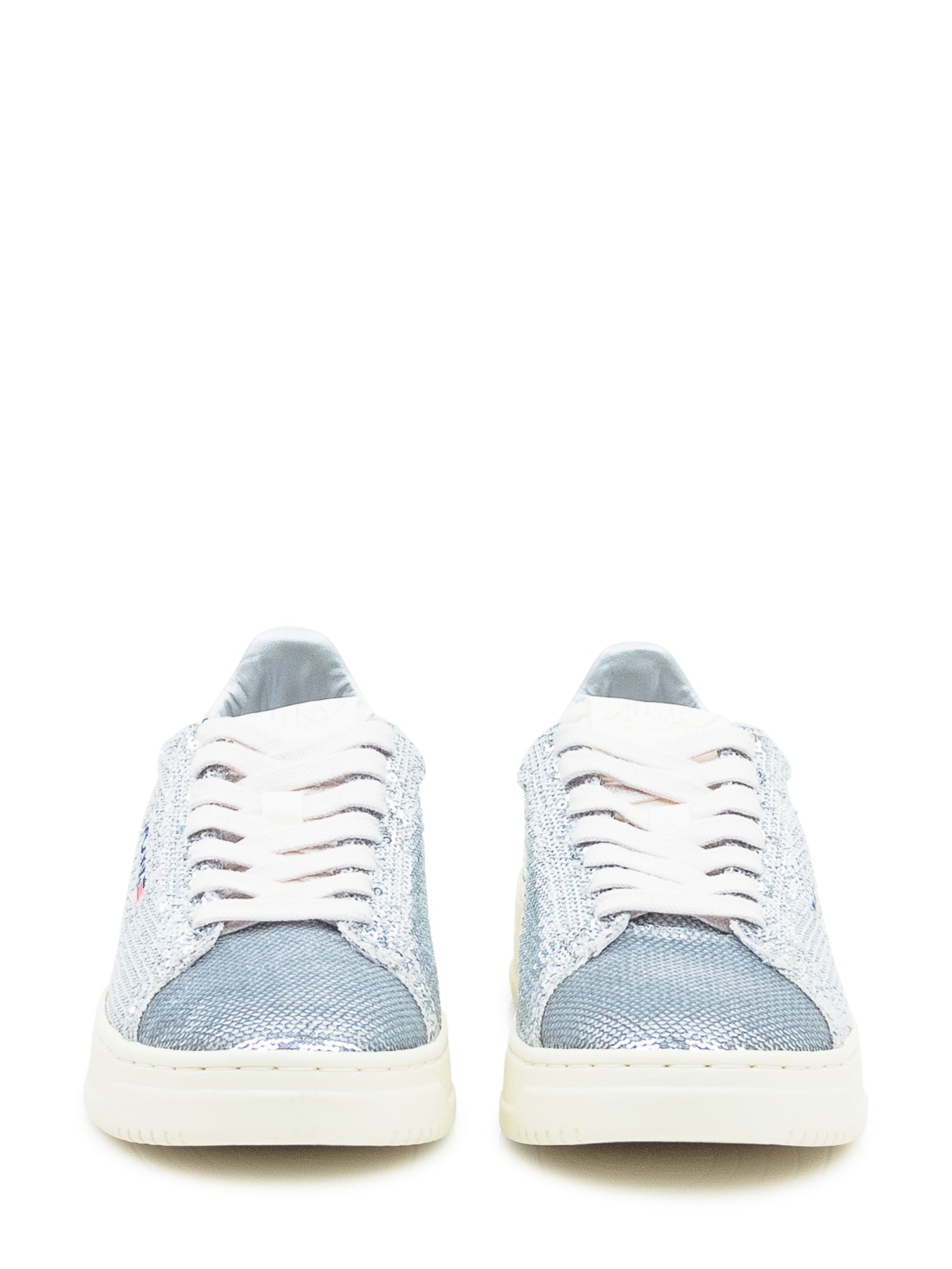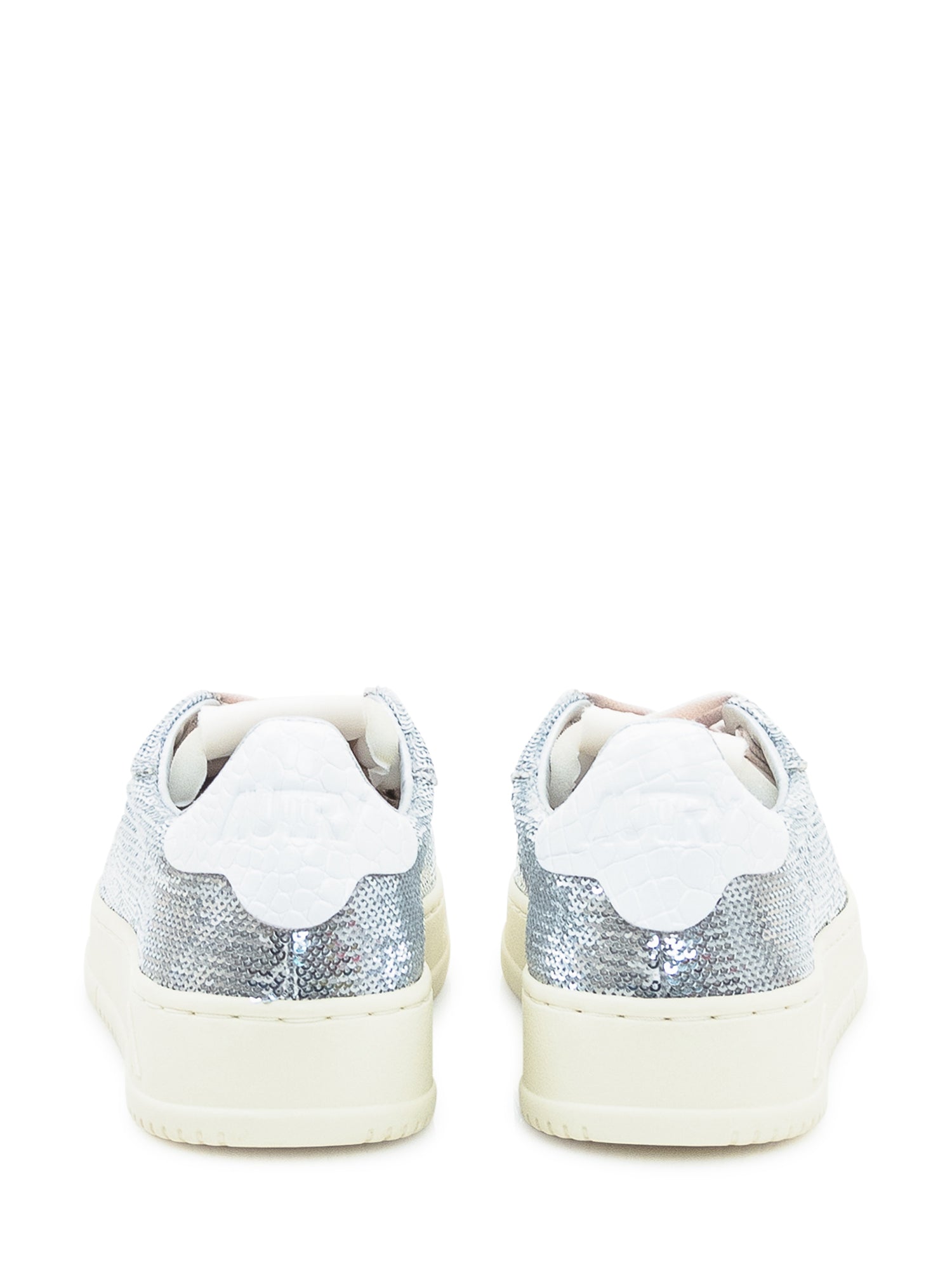 Sneakers Autry Rosé Medialist Low in tessuto ricoperto di paillettes argento, con dettagli bianchi e logo laterale.