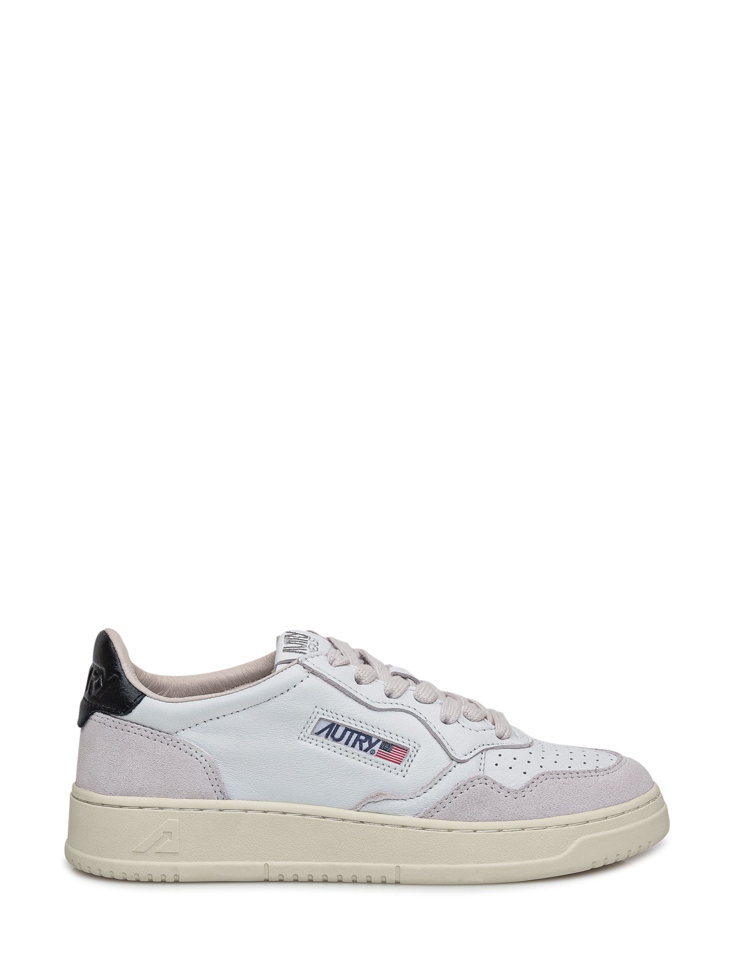 Sneaker bianca in pelle. Punta traforata con inserto in pelle scamosciata. Chiusura con lacci. Tallone a contrasto. Logo sulla linguetta, sul tallone e sul lato.
