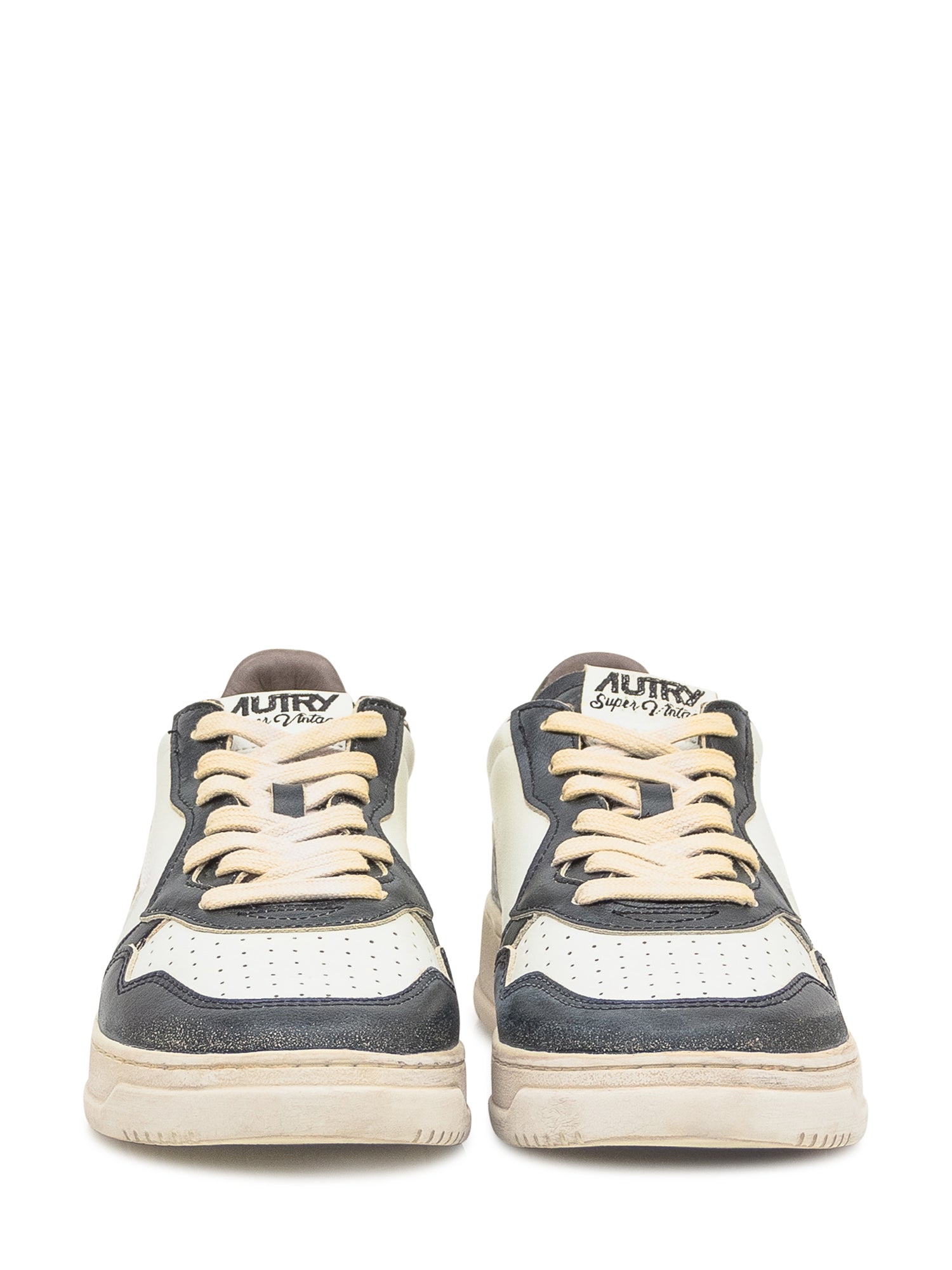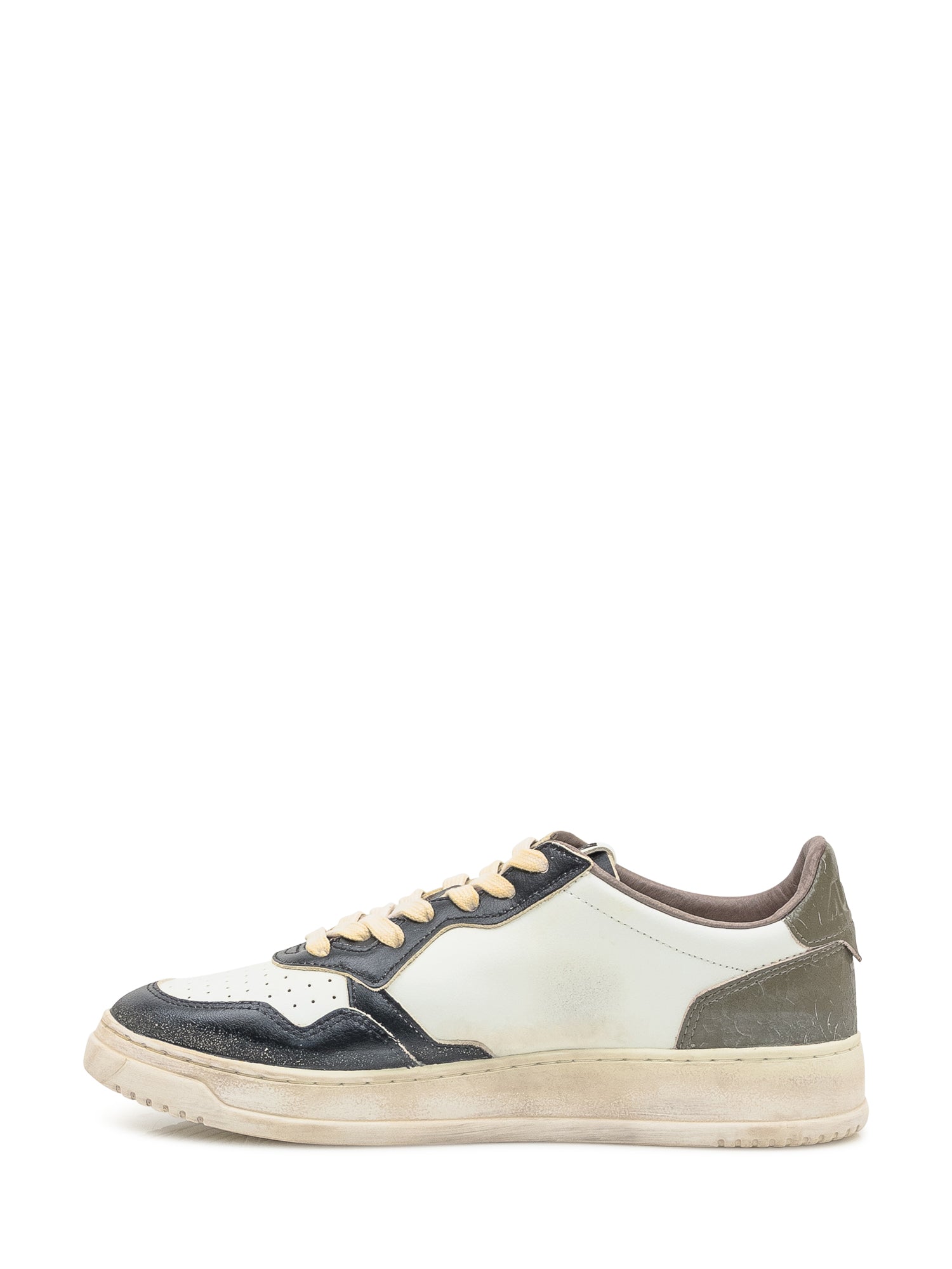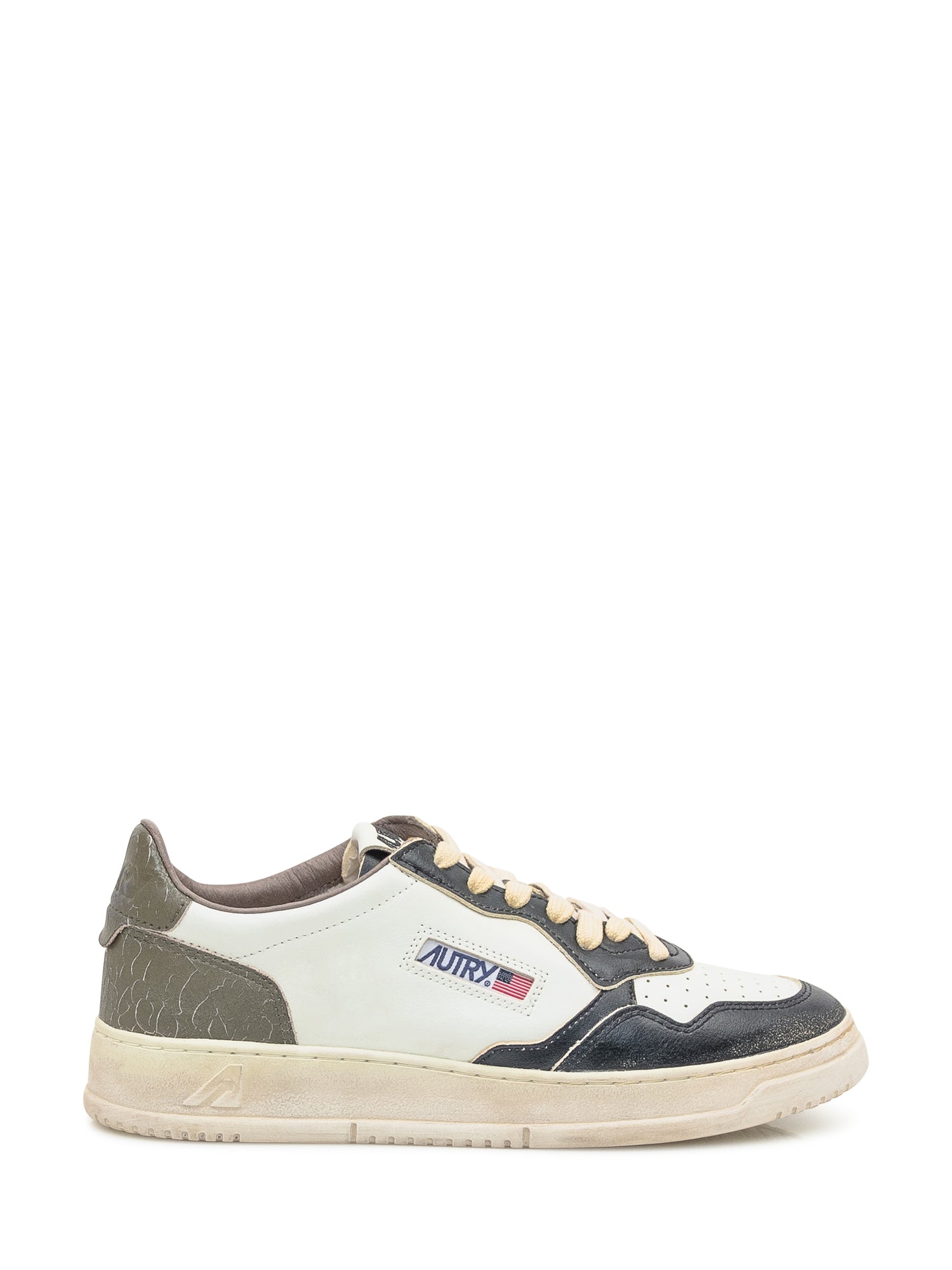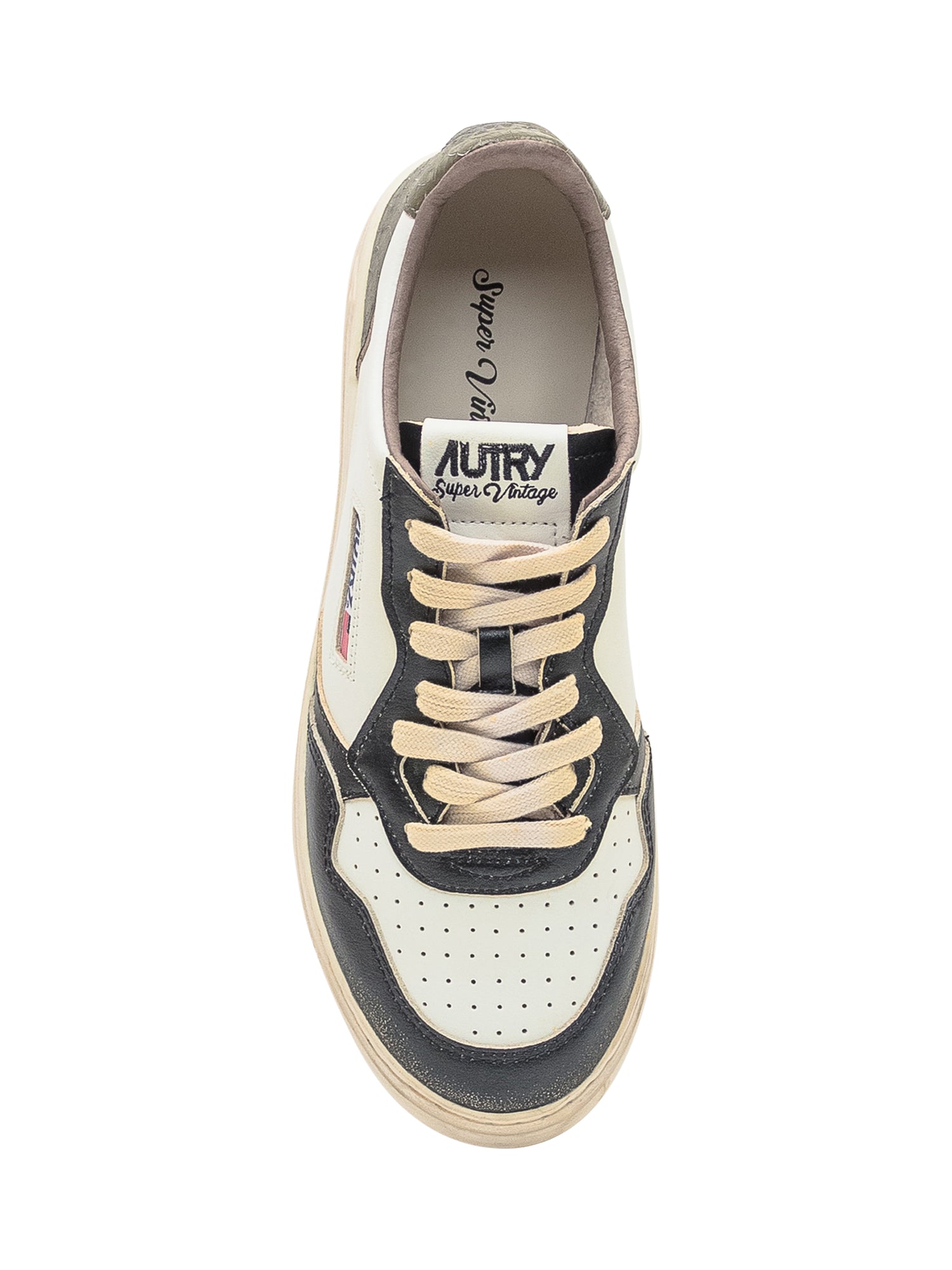Sneakers Autry Medalist in pelle bianca con dettagli neri e grigi effetto vintage. Stile rétro ispirato agli anni '80, suola in gomma e logo bandiera USA laterale.