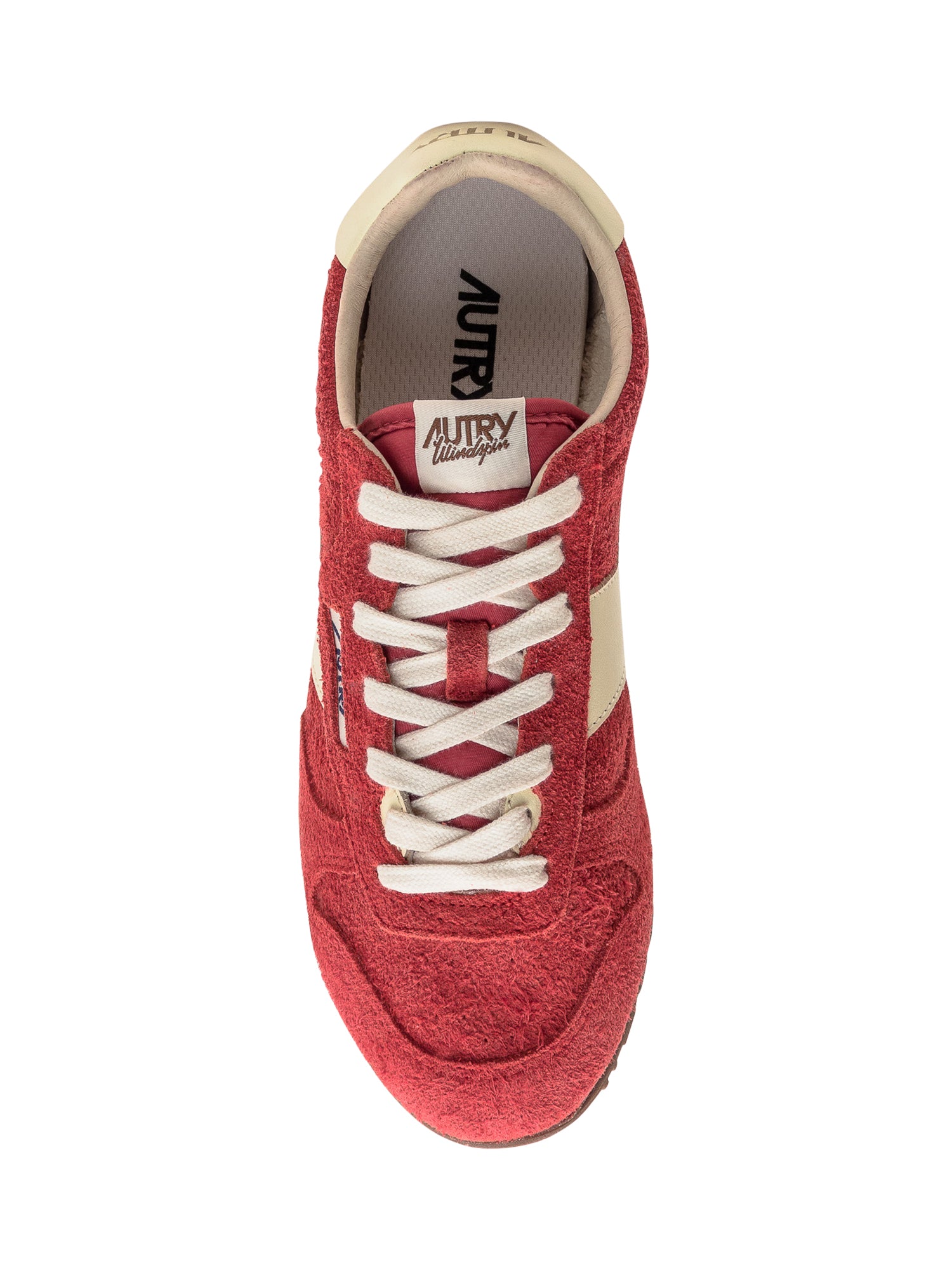 Scarpa rossa in tessuto con effetto scamosciato. Dettagli laterali. Suola in gomma. Chiusura frontale con lacci.
