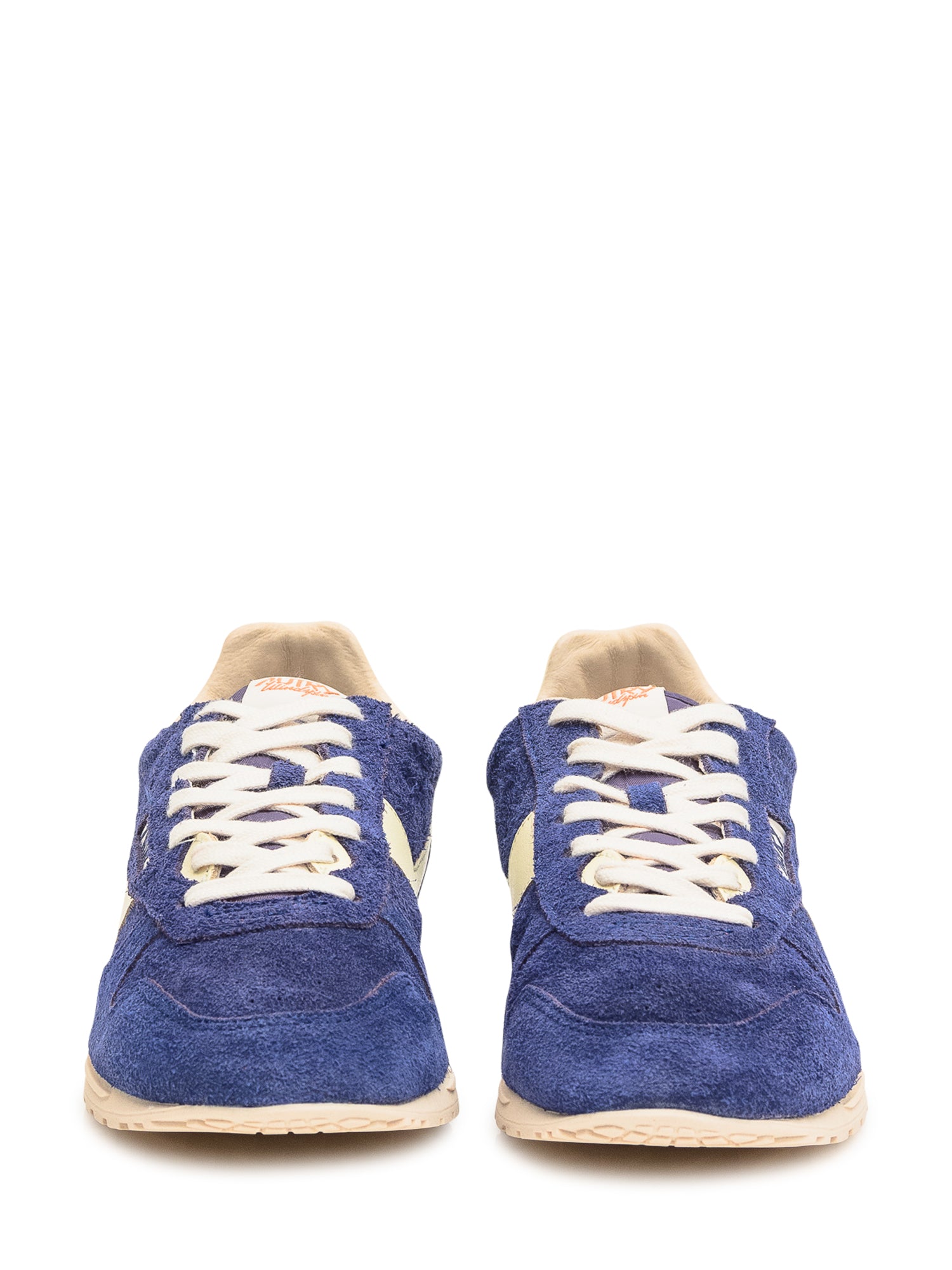 Scarpa blu in tessuto con effetto scamosciato. Dettagli laterali. Suola in gomma. Chiusura frontale con lacci.