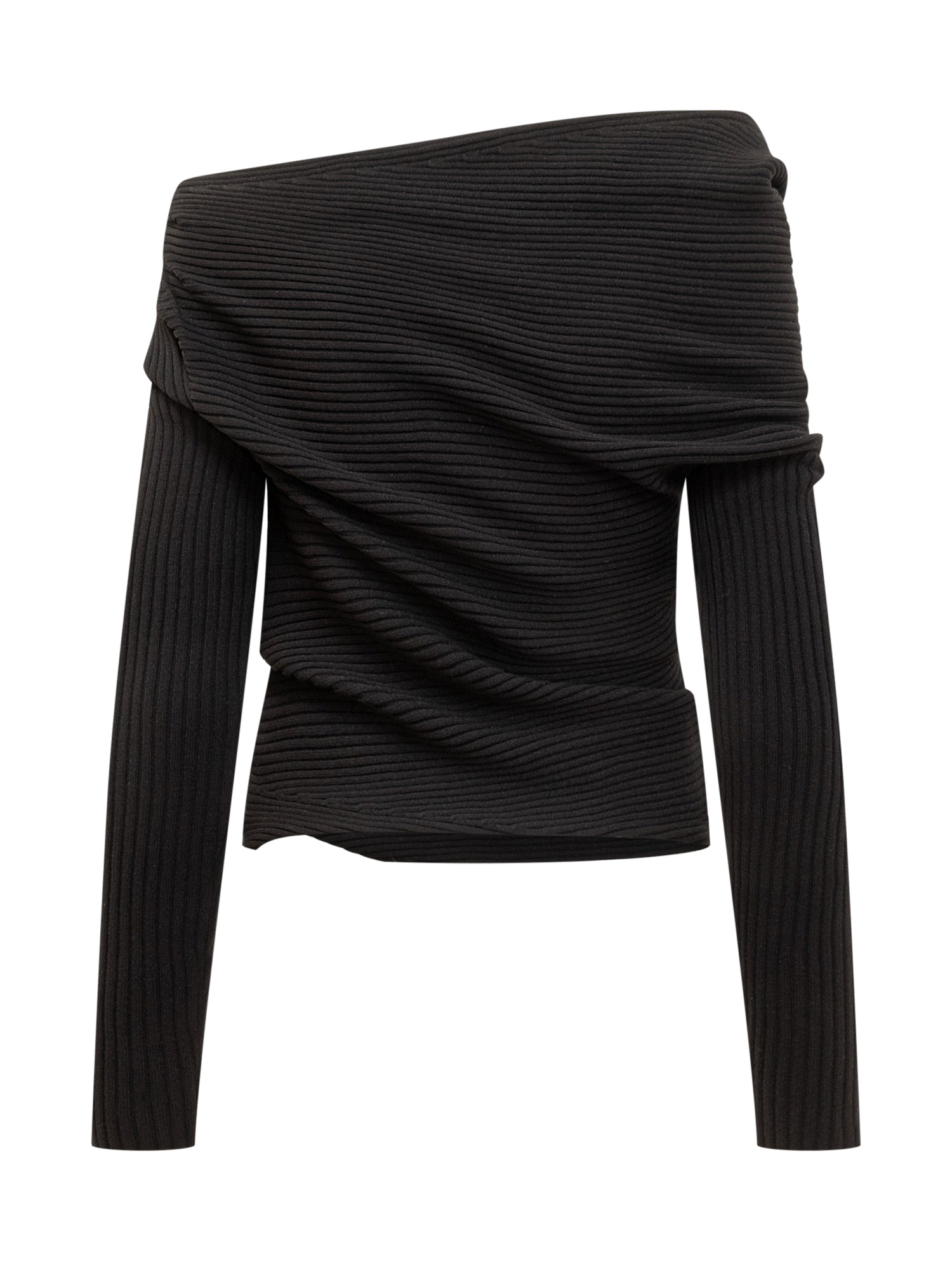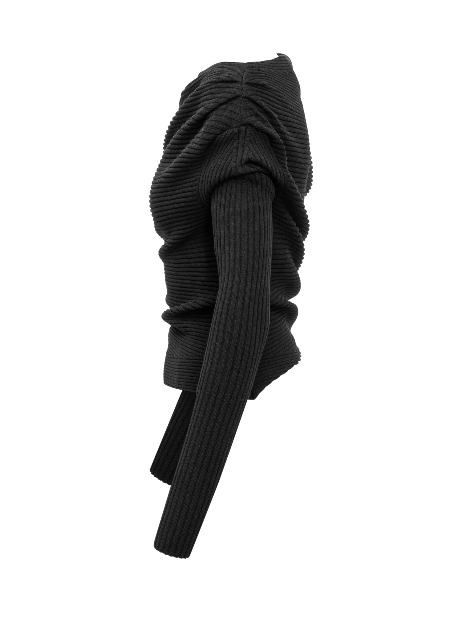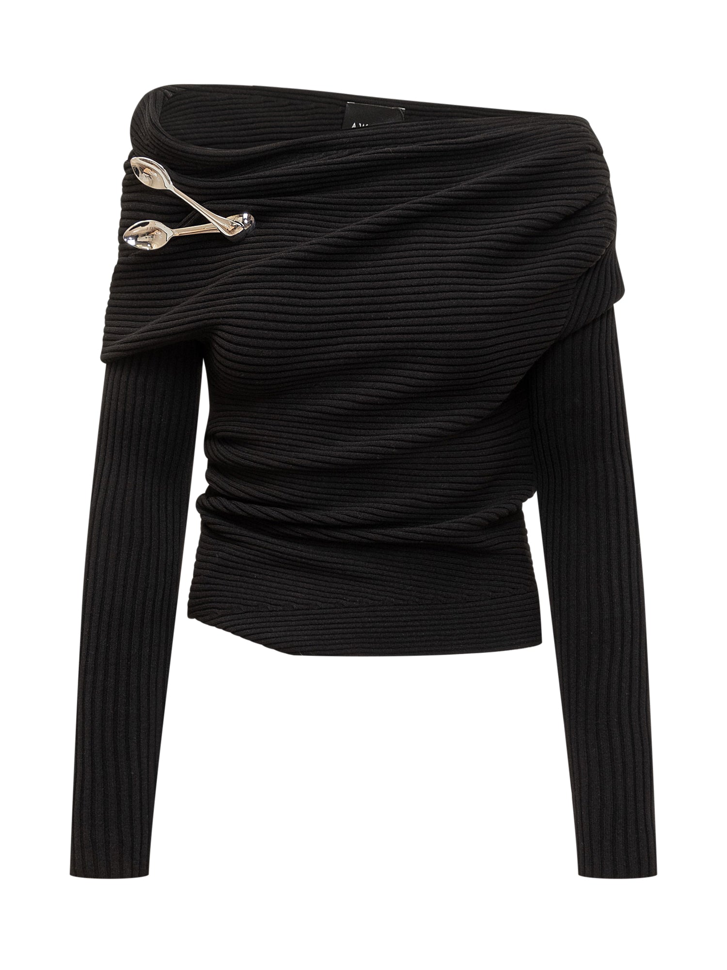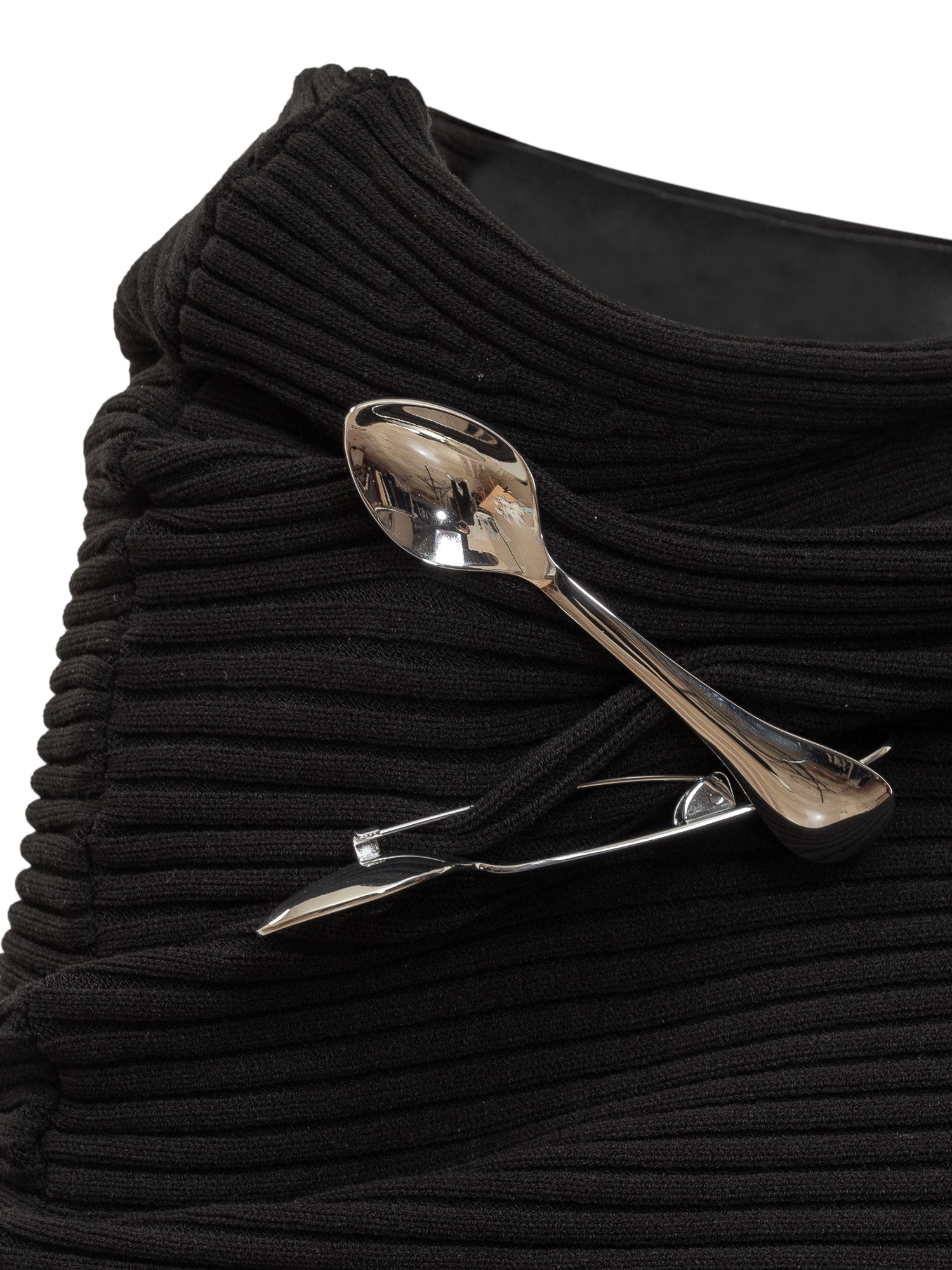 Maglia monospalla. Lavorazione a costine. Dettaglio Posate in metallo sul davanti.