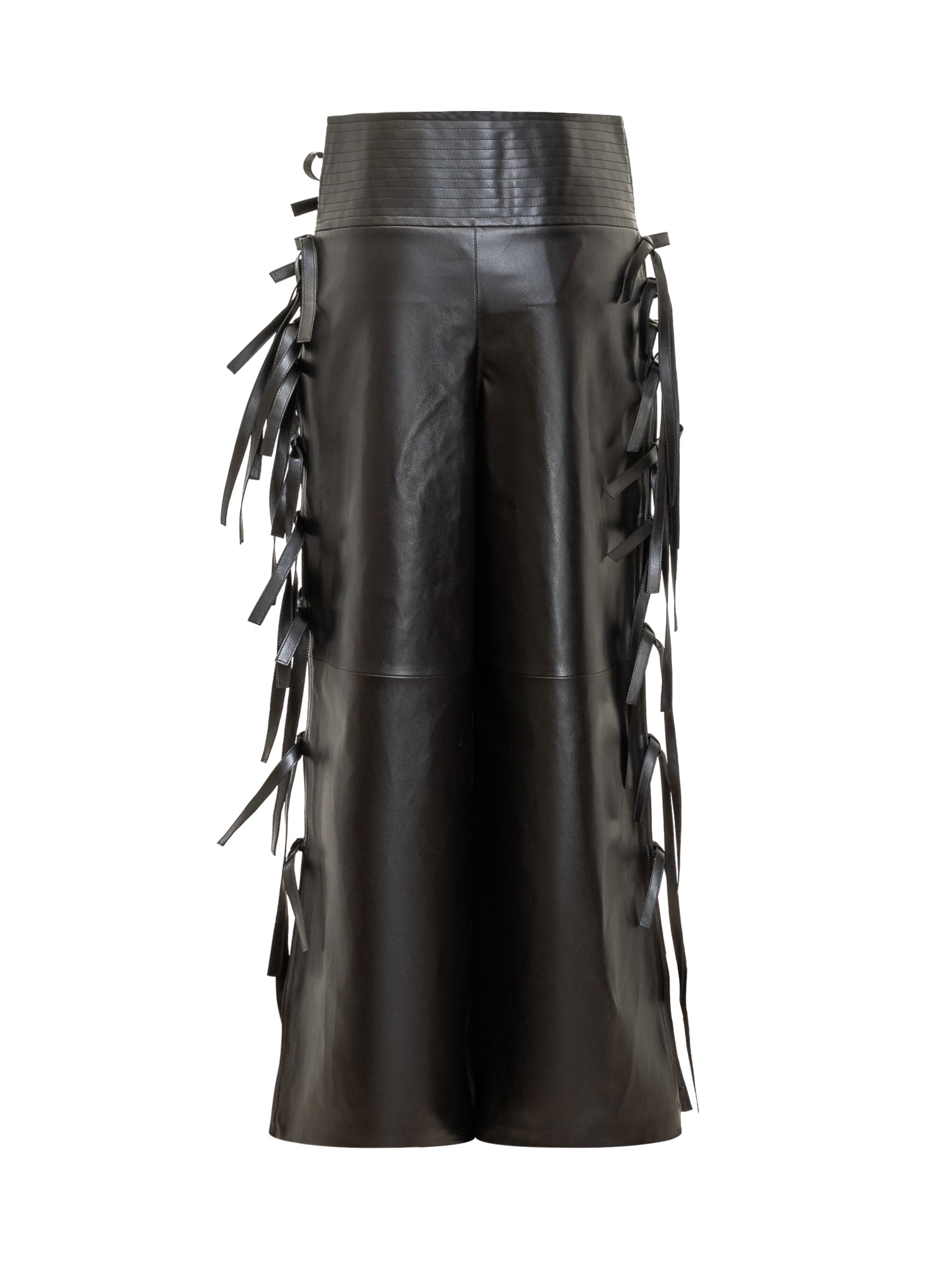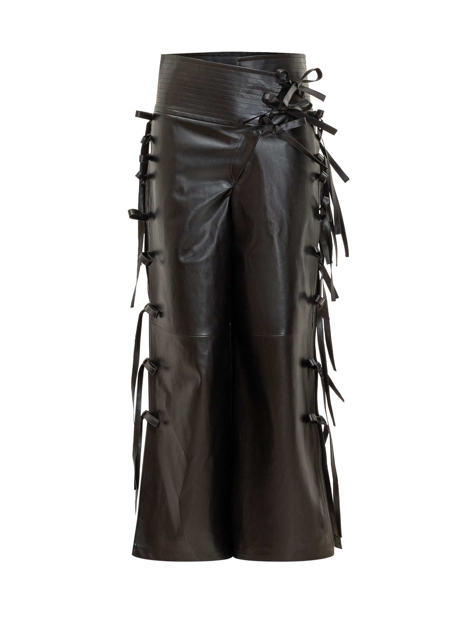 Pantalone wide leg. Chiusura con zip e laccetti. Aperture laterali. Dettaglio Fiocchi sui lati.