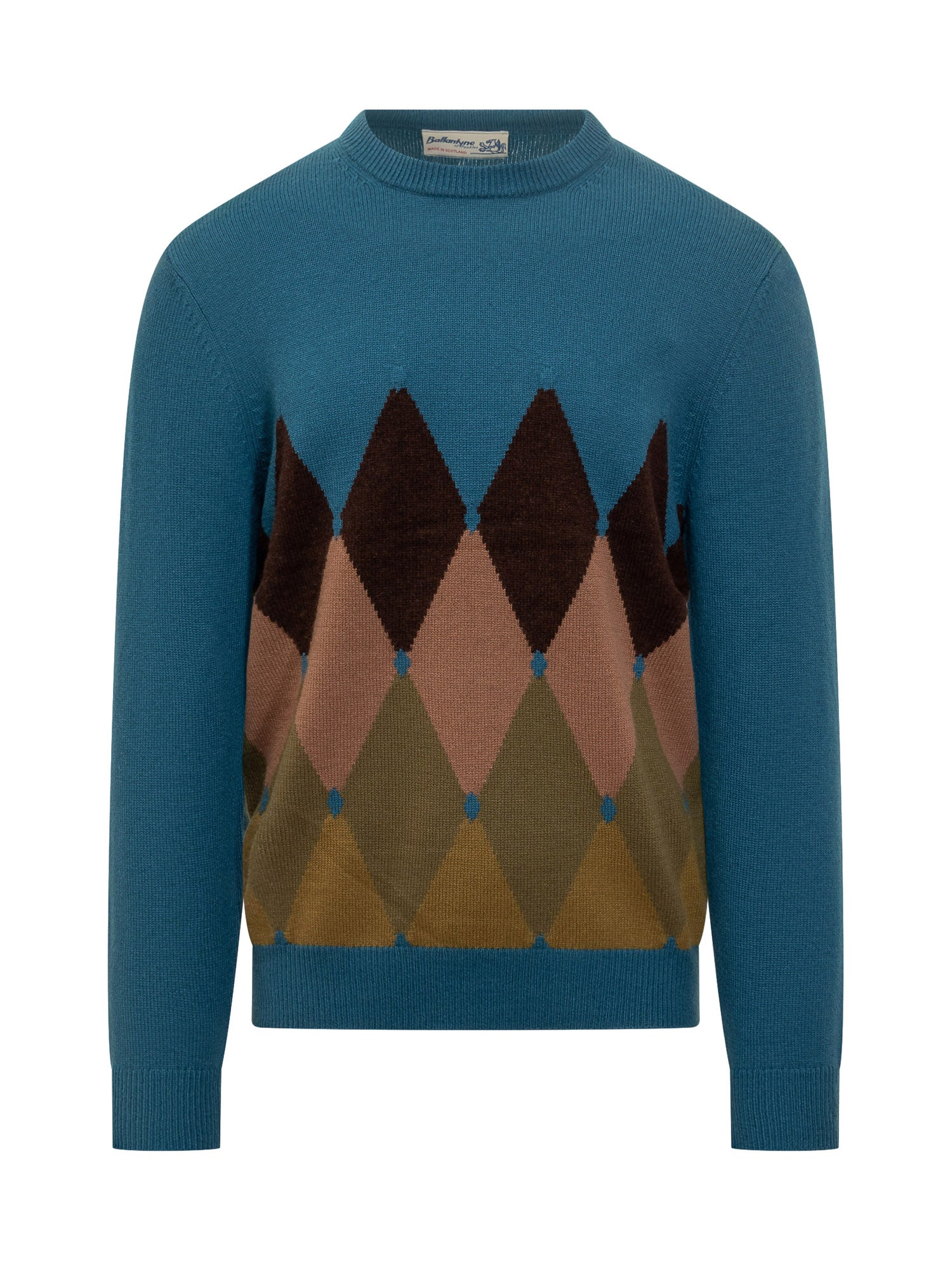 Maglione Ballantyne in lana con motivo a rombi nei toni del blu e marrone. Girocollo e maniche lunghe.