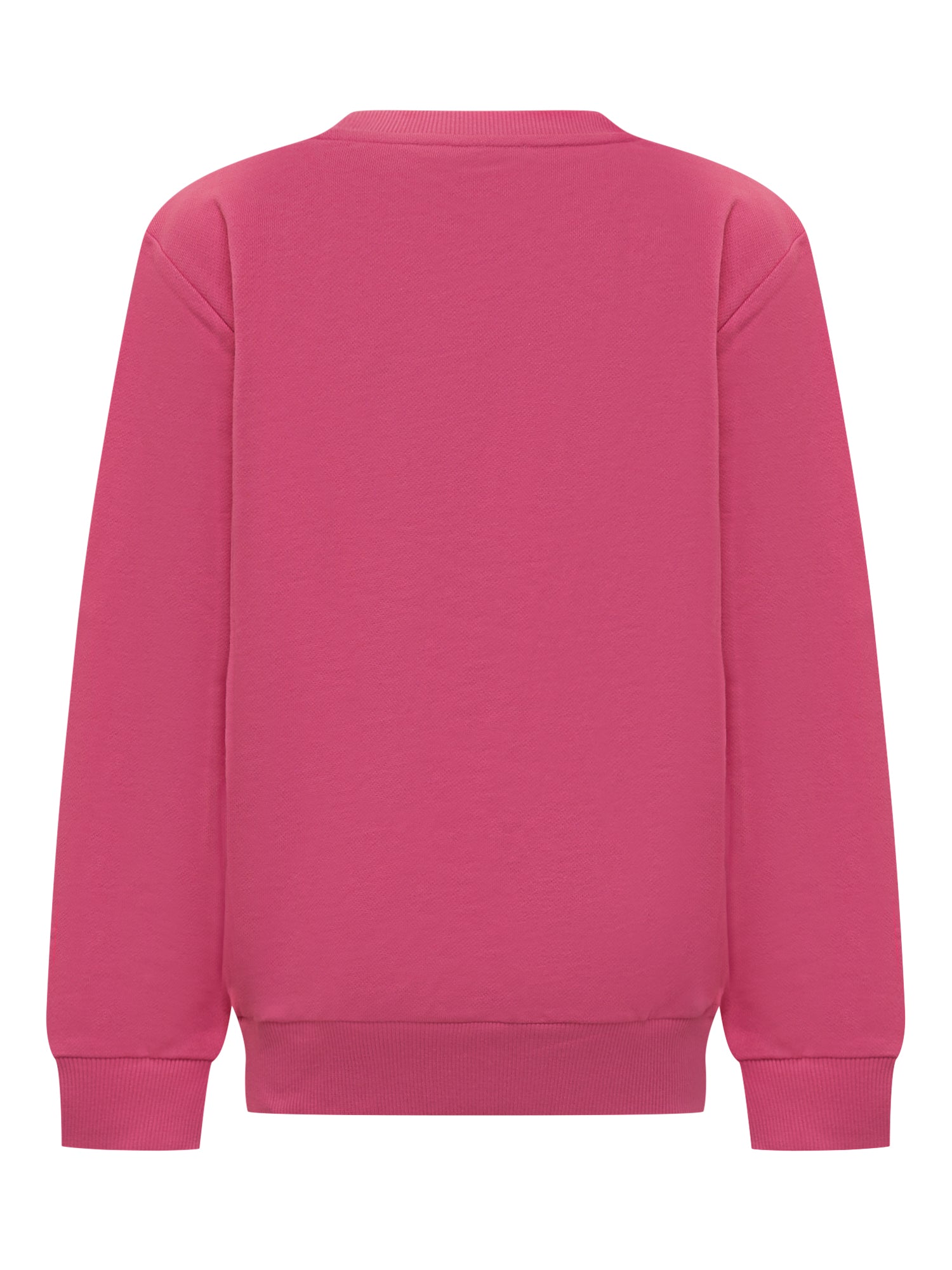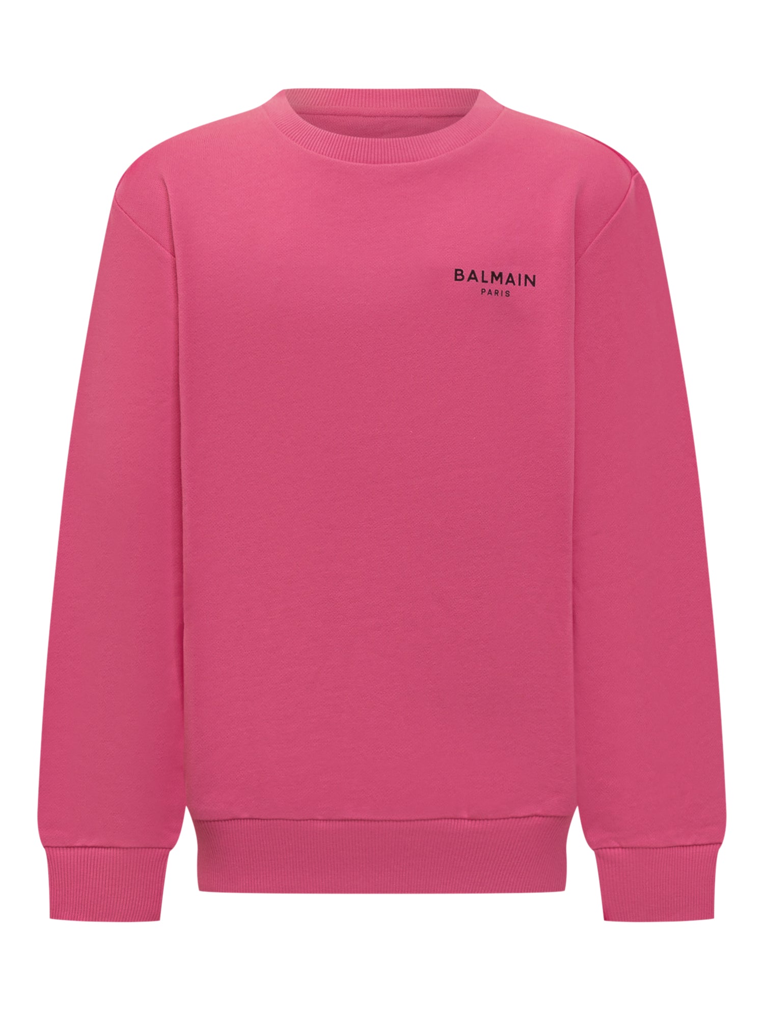 Felpa rosa da bambino firmata Balmain, con logo stampato in nero sul petto.