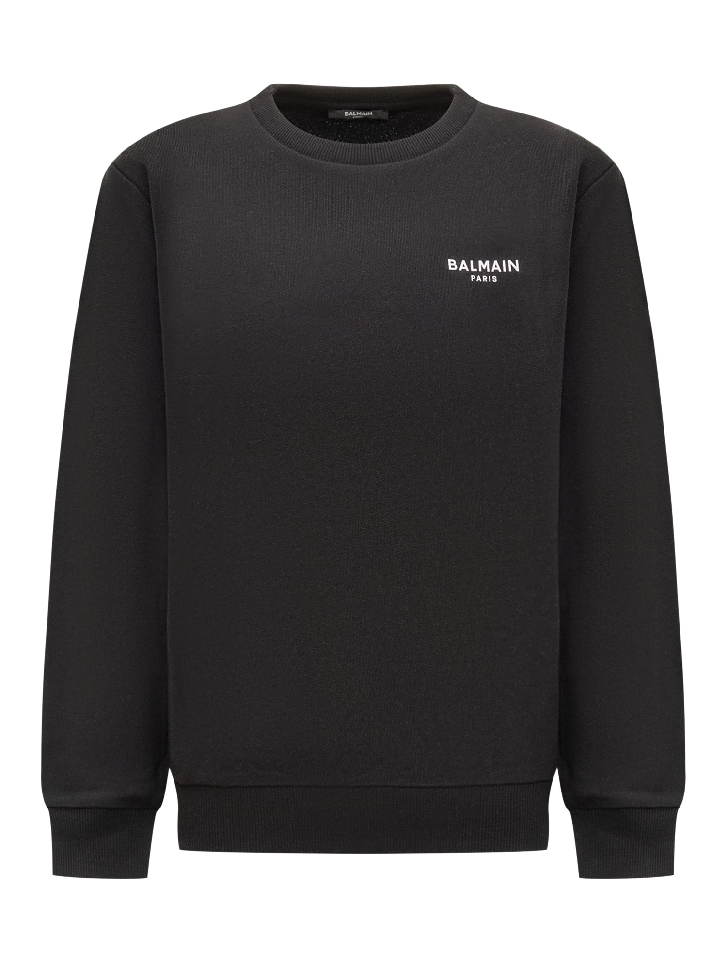 Felpa nera da bambino firmata Balmain. Caratterizzata da una vestibilità regular, è realizzata in cotone con finitura morbida al tatto. Il logo è stampato in bianco sul petto.