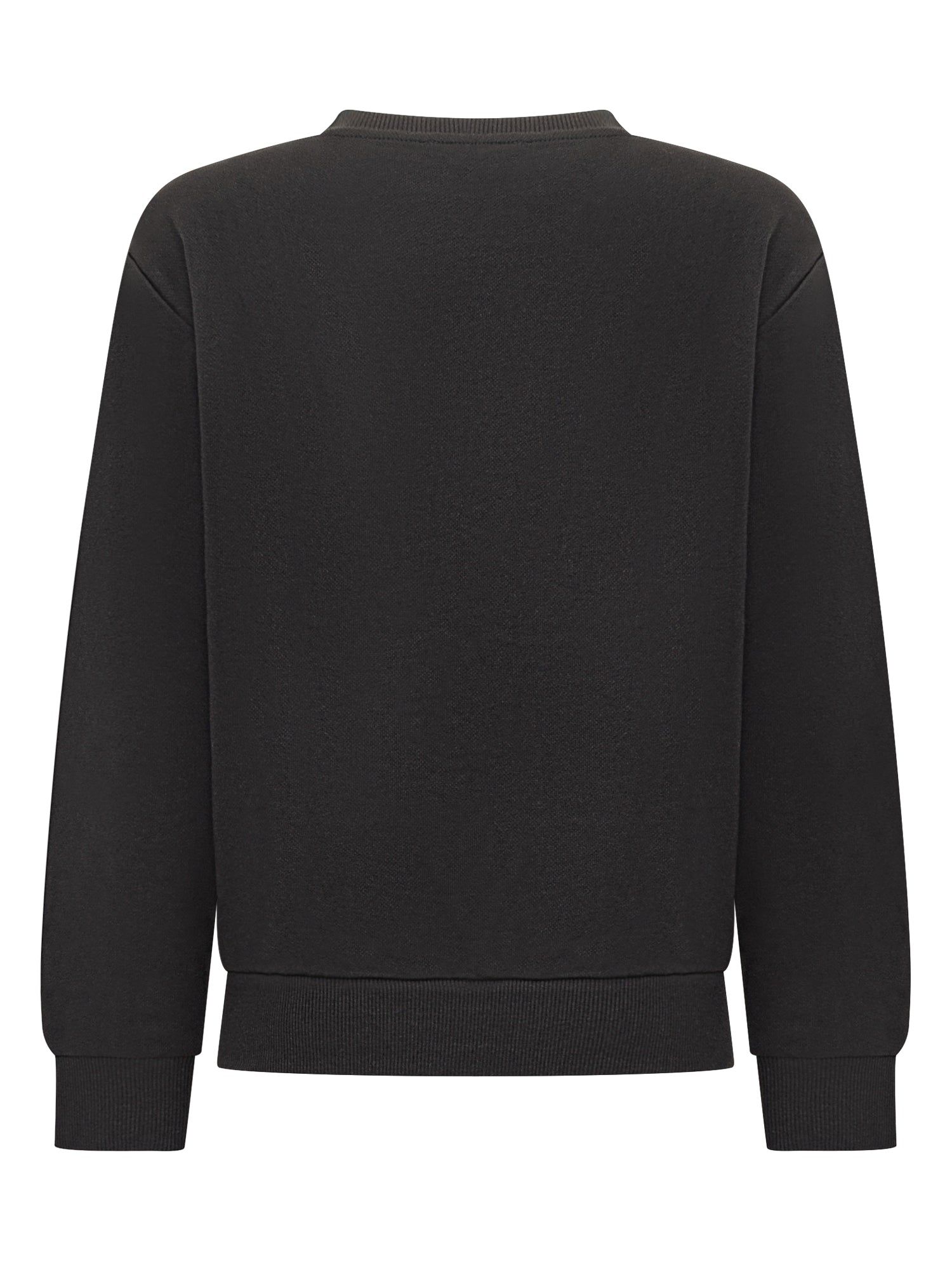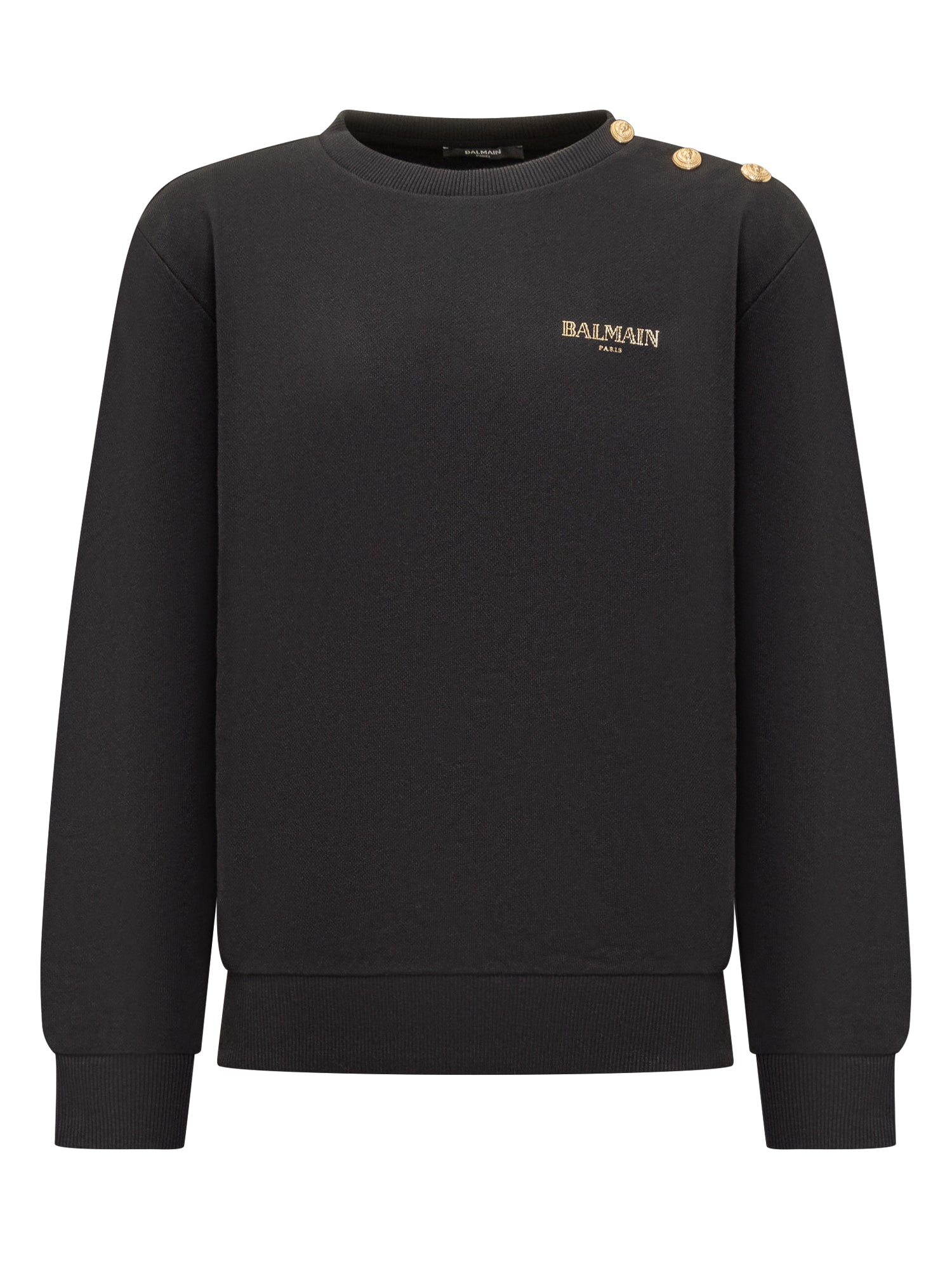 elpa nera da bambino firmata Balmain, con logo "BALMAIN PARIS" ricamato in oro sul petto. Caratterizzata da eleganti bottoni dorati sulla spalla.