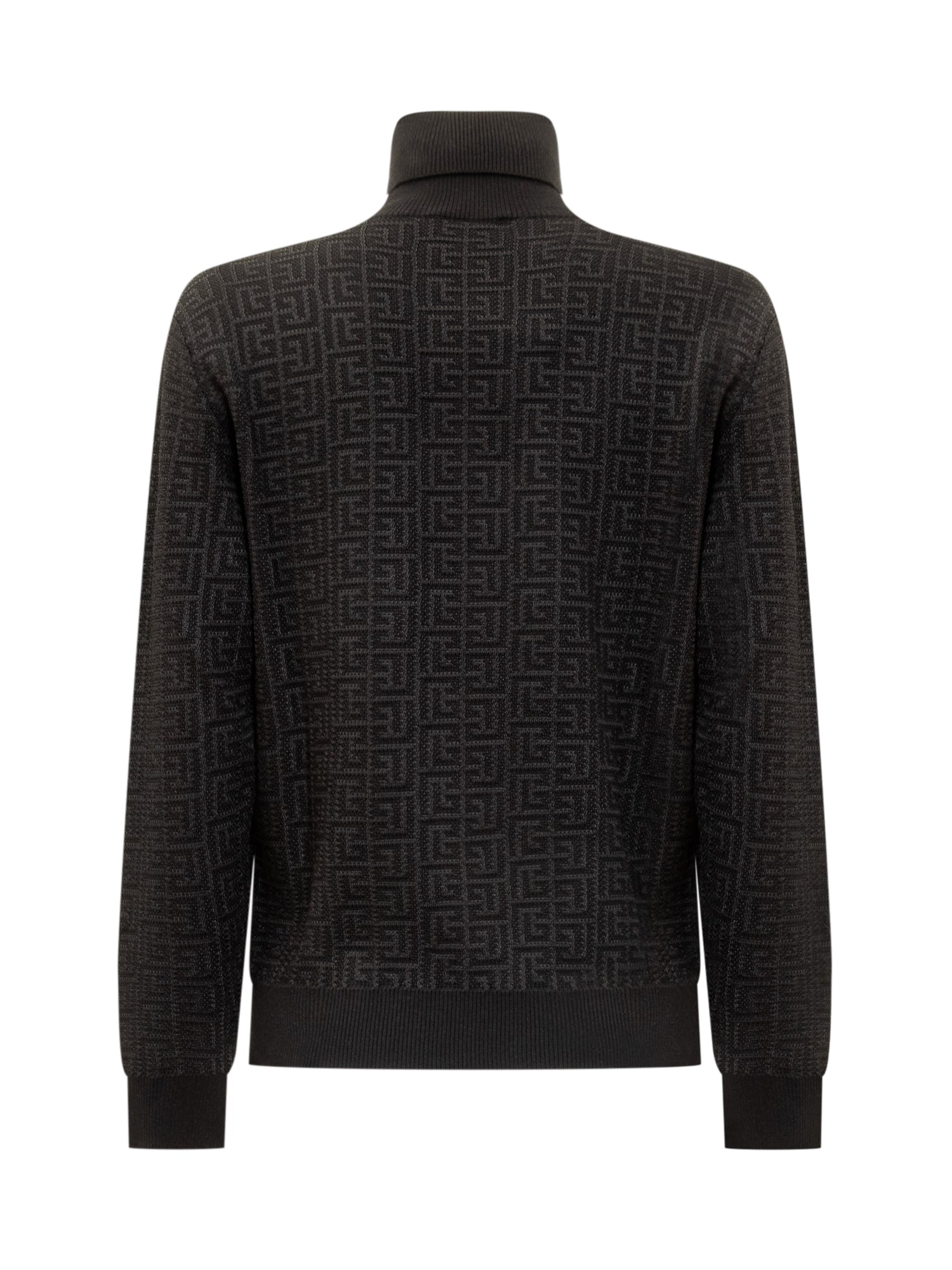 Maglione dolcevita nero da bambino firmato Balmain. Realizzato in maglia jacquard, presenta l'iconico monogramma integrale su tutta la superficie.