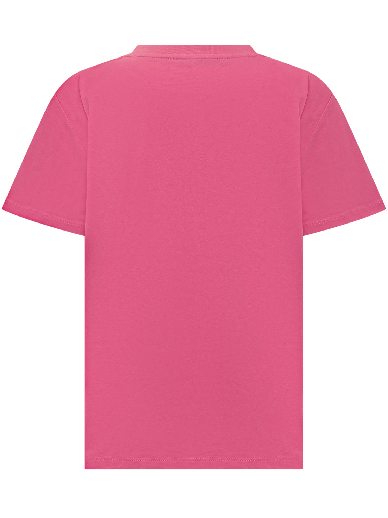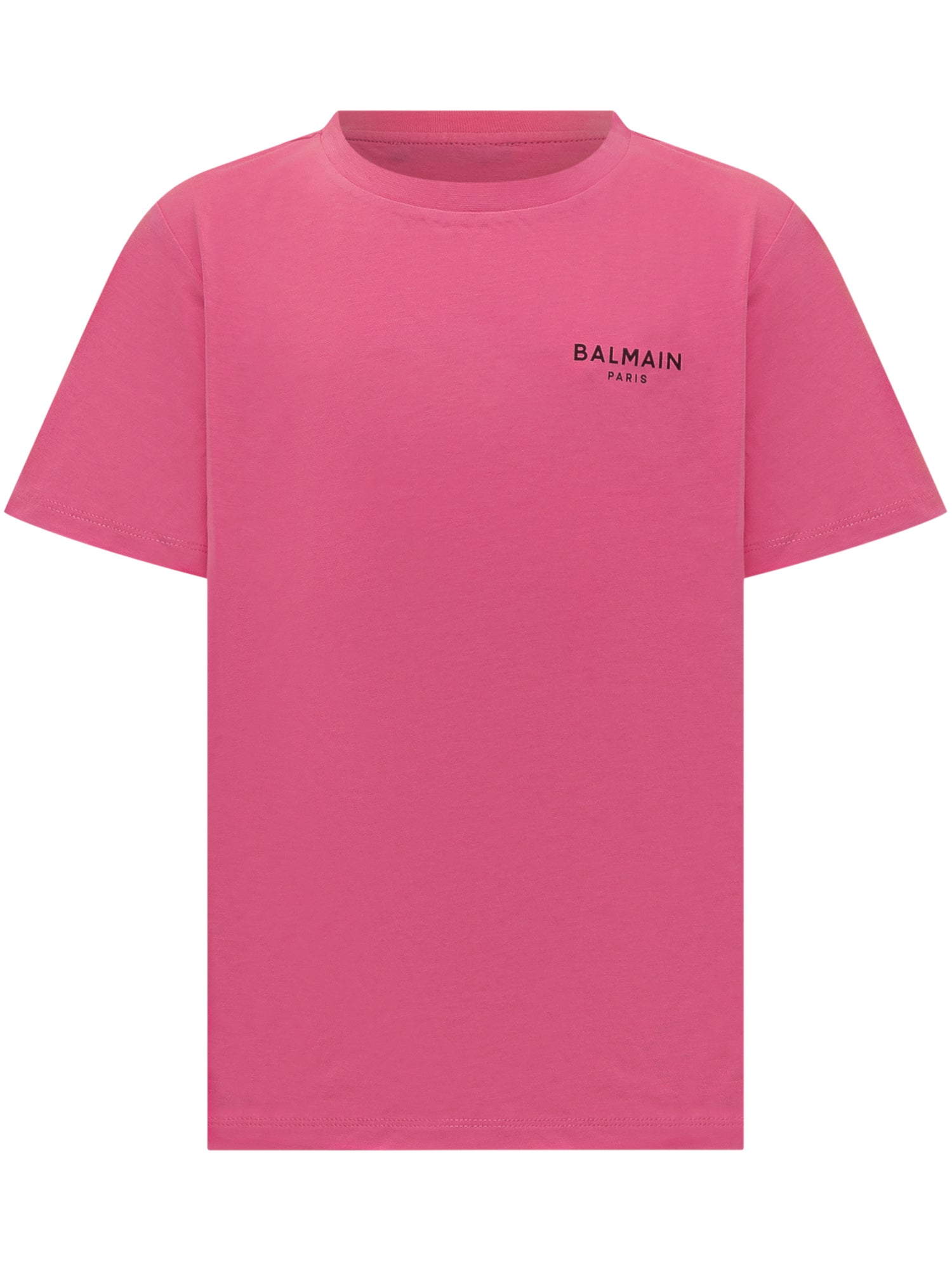 T-shirt da bambino firmata Balmain in vivace tonalità rosa. Realizzata in morbido cotone, presenta una linea essenziale con girocollo e il logo stampato in nero sul petto.