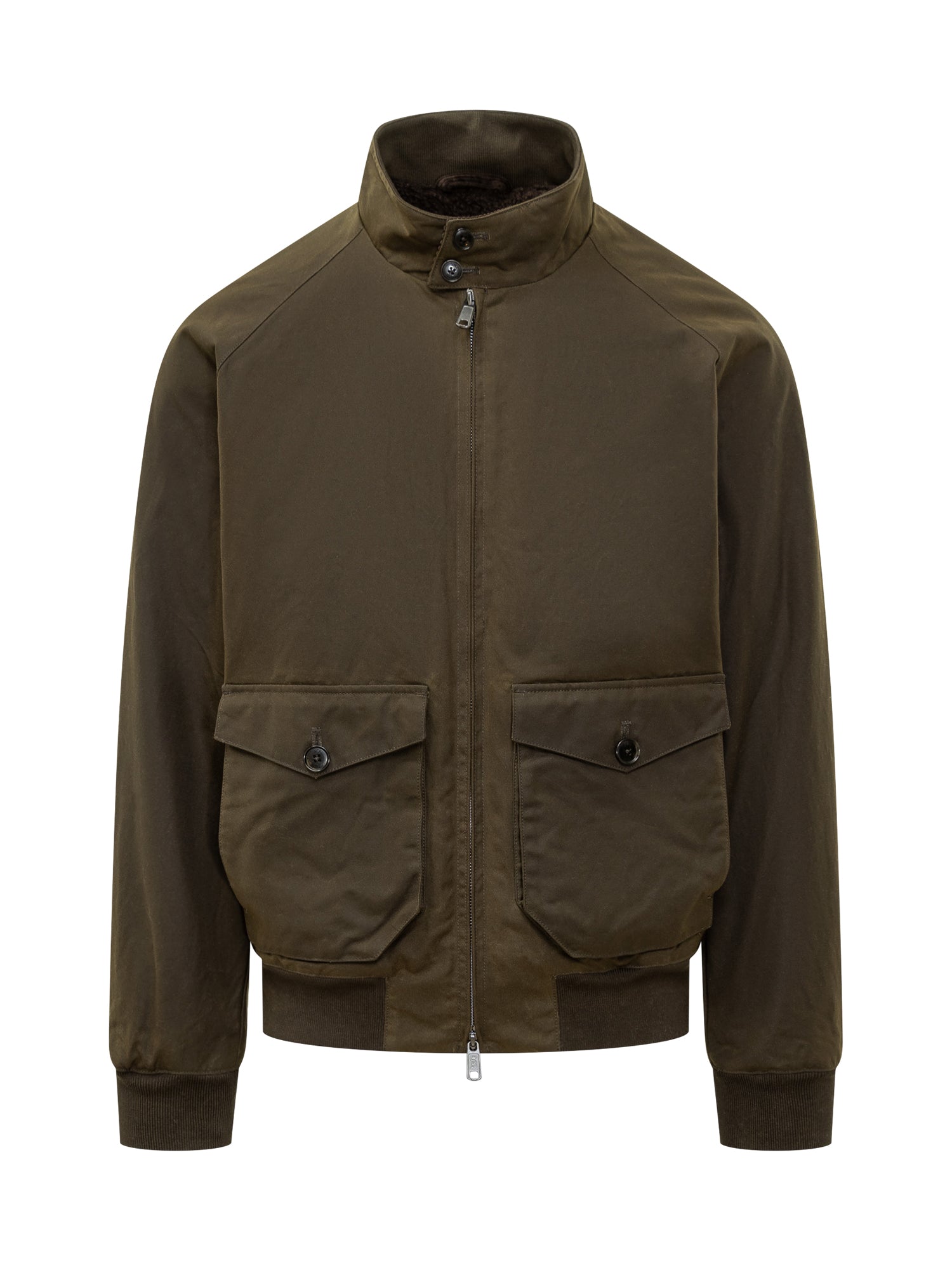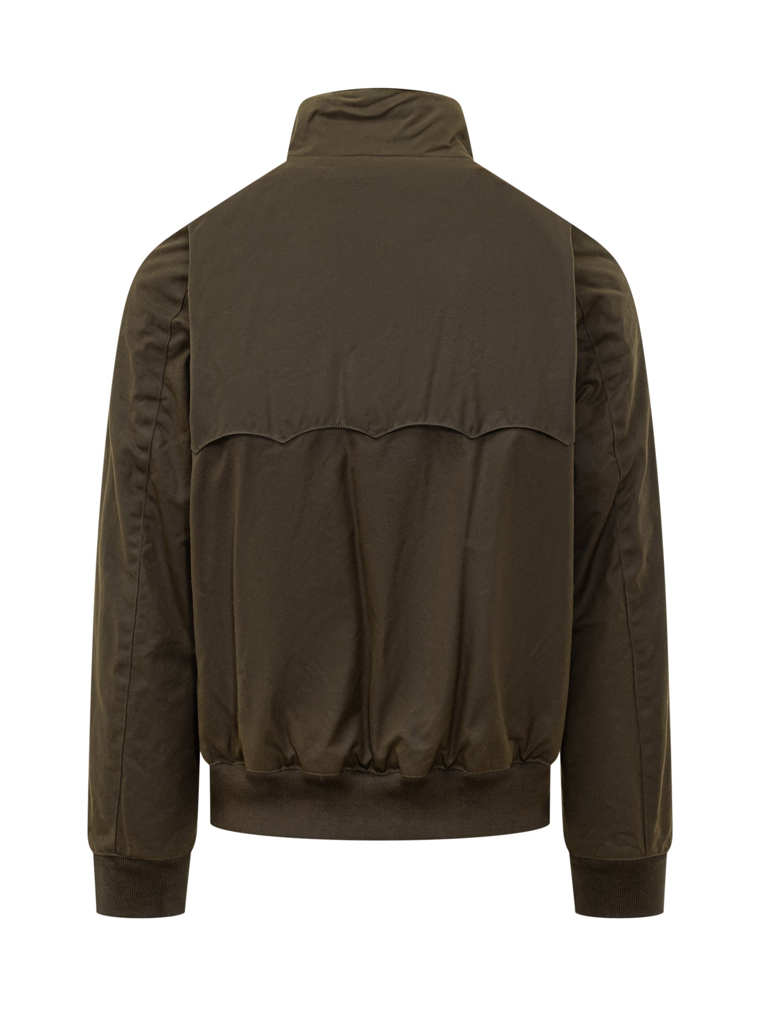 Giubbotto Baracuta G9 Harrington in cotone cerato verde con chiusura a zip, tasche con patta e polsini a costine. Un icona British dal fascino intramontabile.