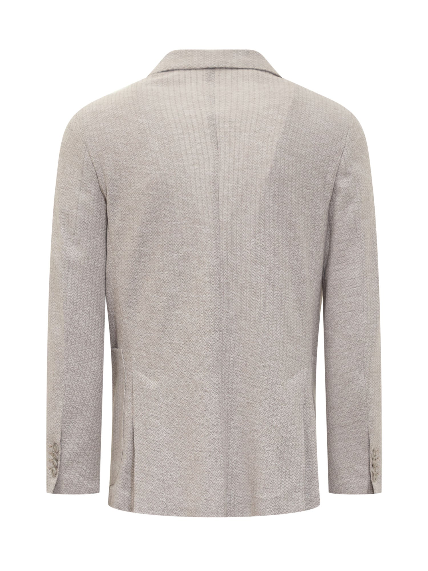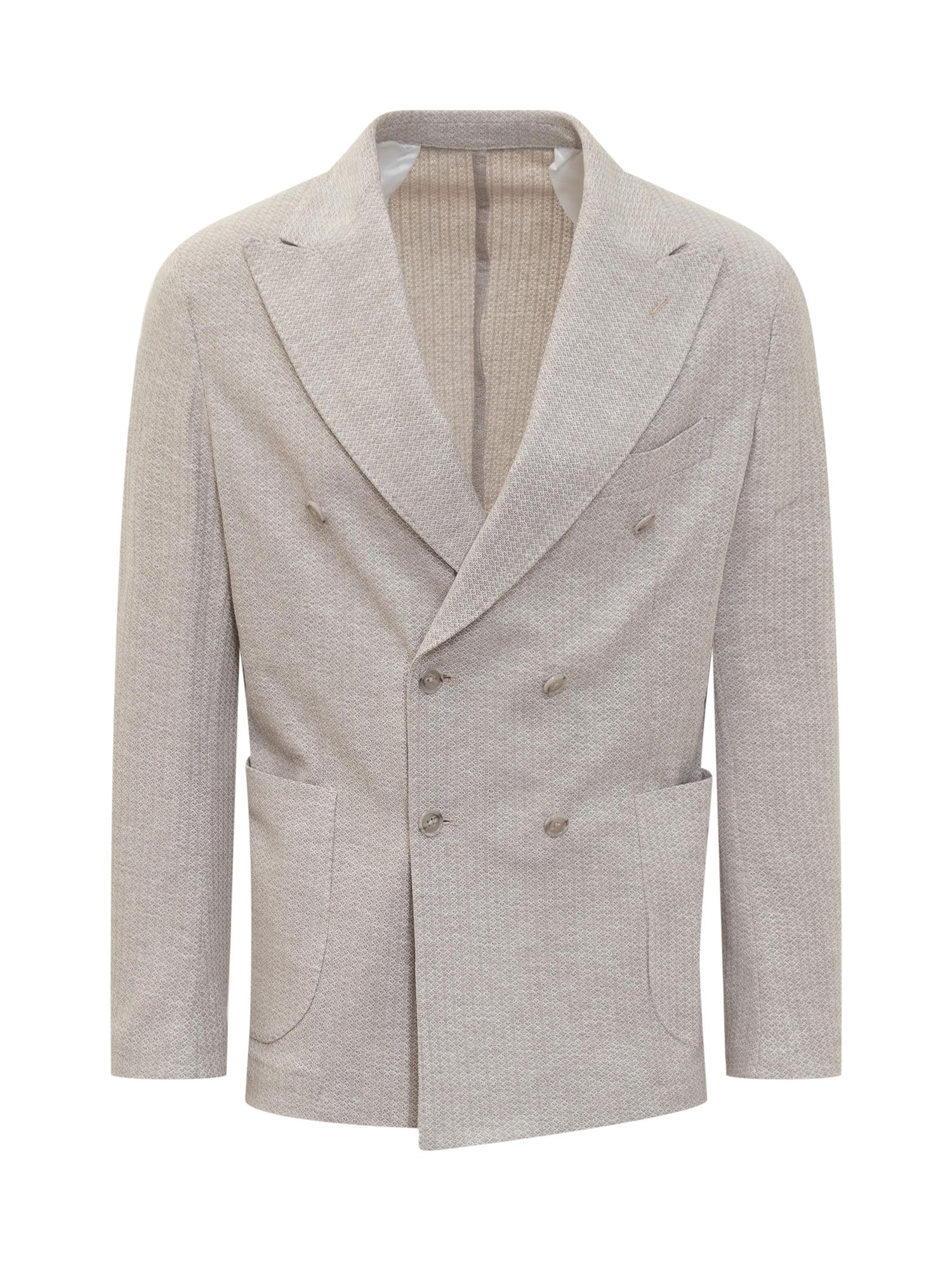 Blazer doppiopetto a maniche lunghe. Scollo a V. Chiusura con bottoni. Polsi con bottoni. Tre tasche.