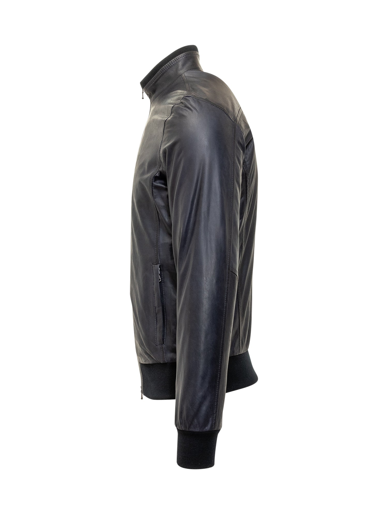 Giacca blu in pelle. Tasche con zip sul lato. Chiusura con zip.
