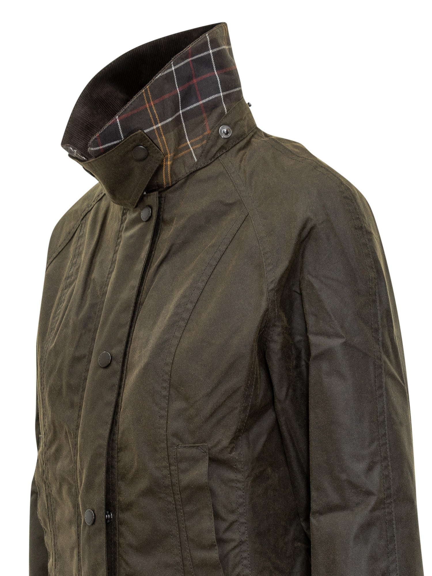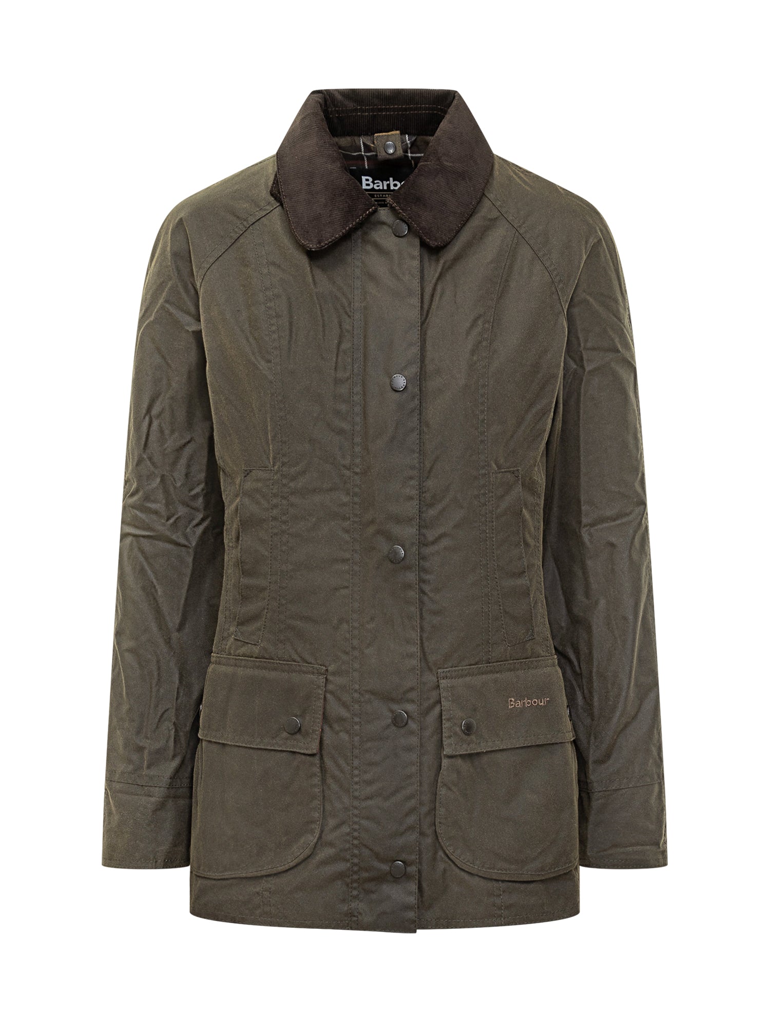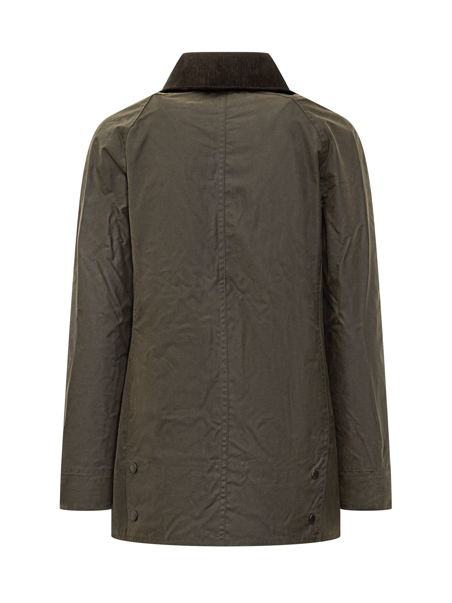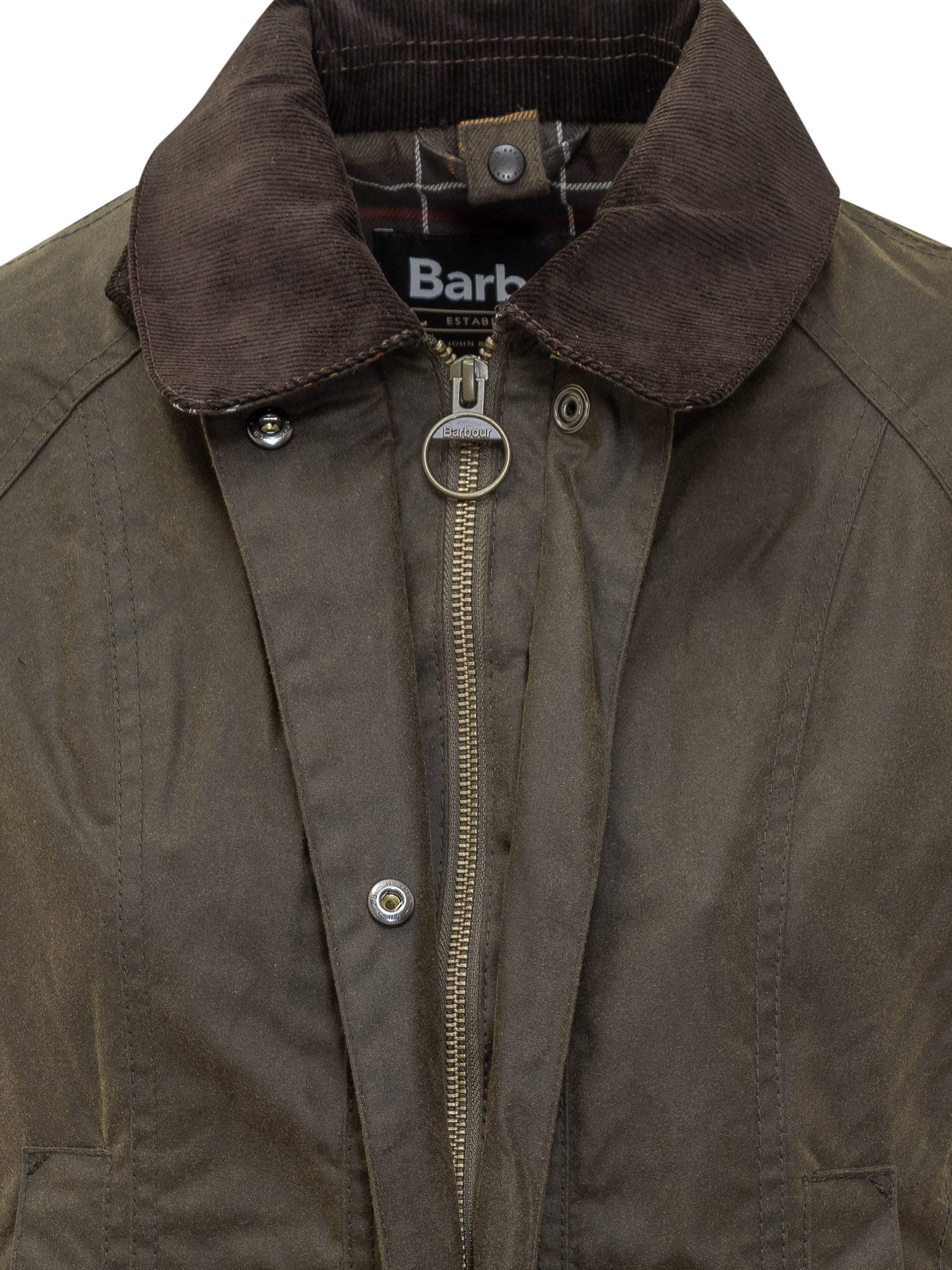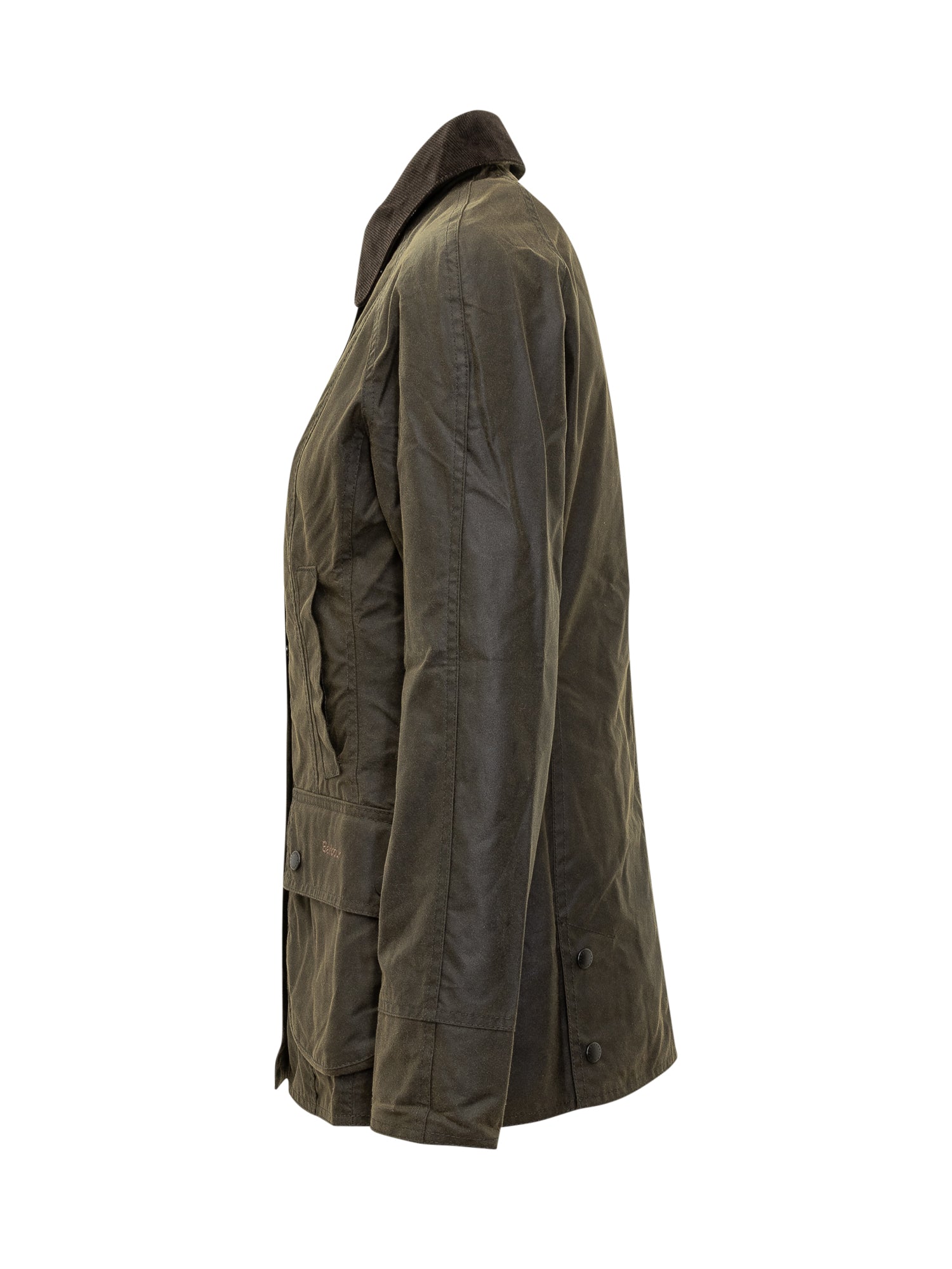 Giacca cerata verde dal taglio classico, colletto in velluto marrone, tasche applicate e chiusura con bottoni a pressione.