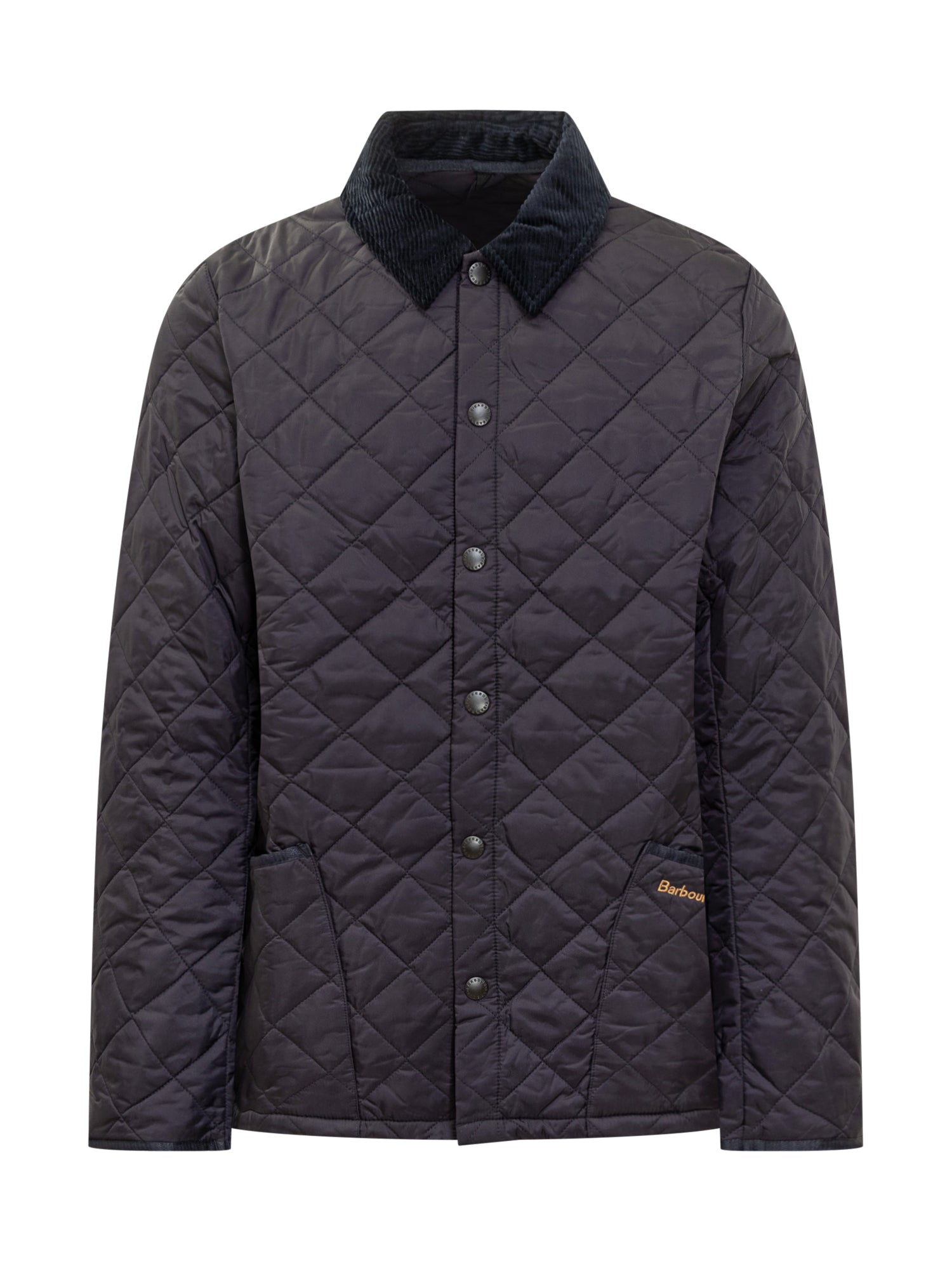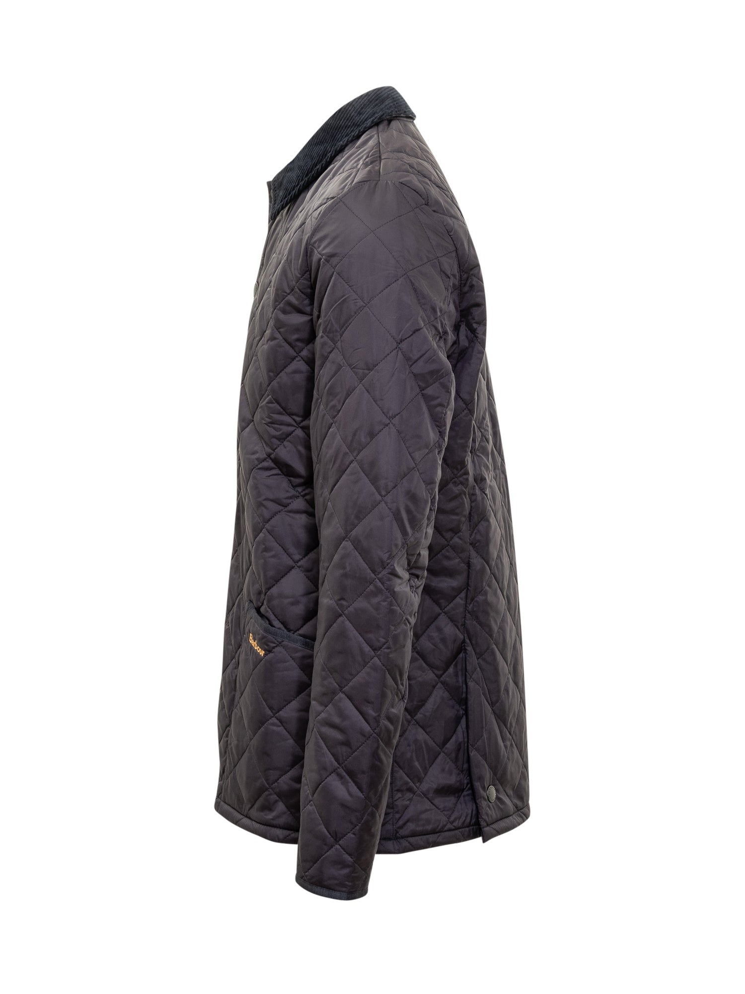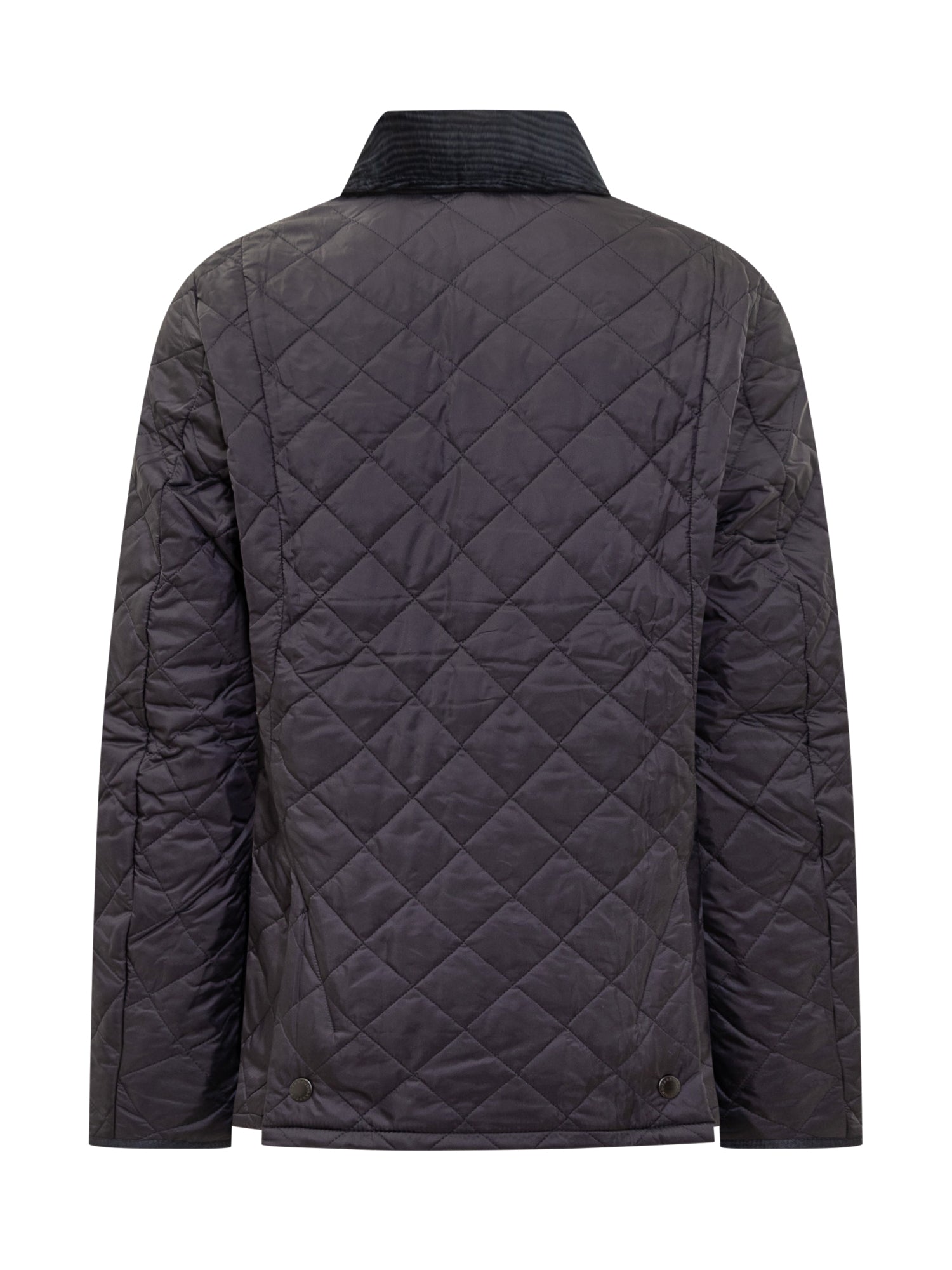 Giacca nera trapuntata con bottoni a pressione e colletto in velluto.
