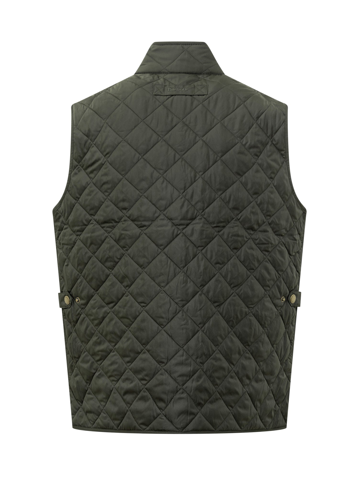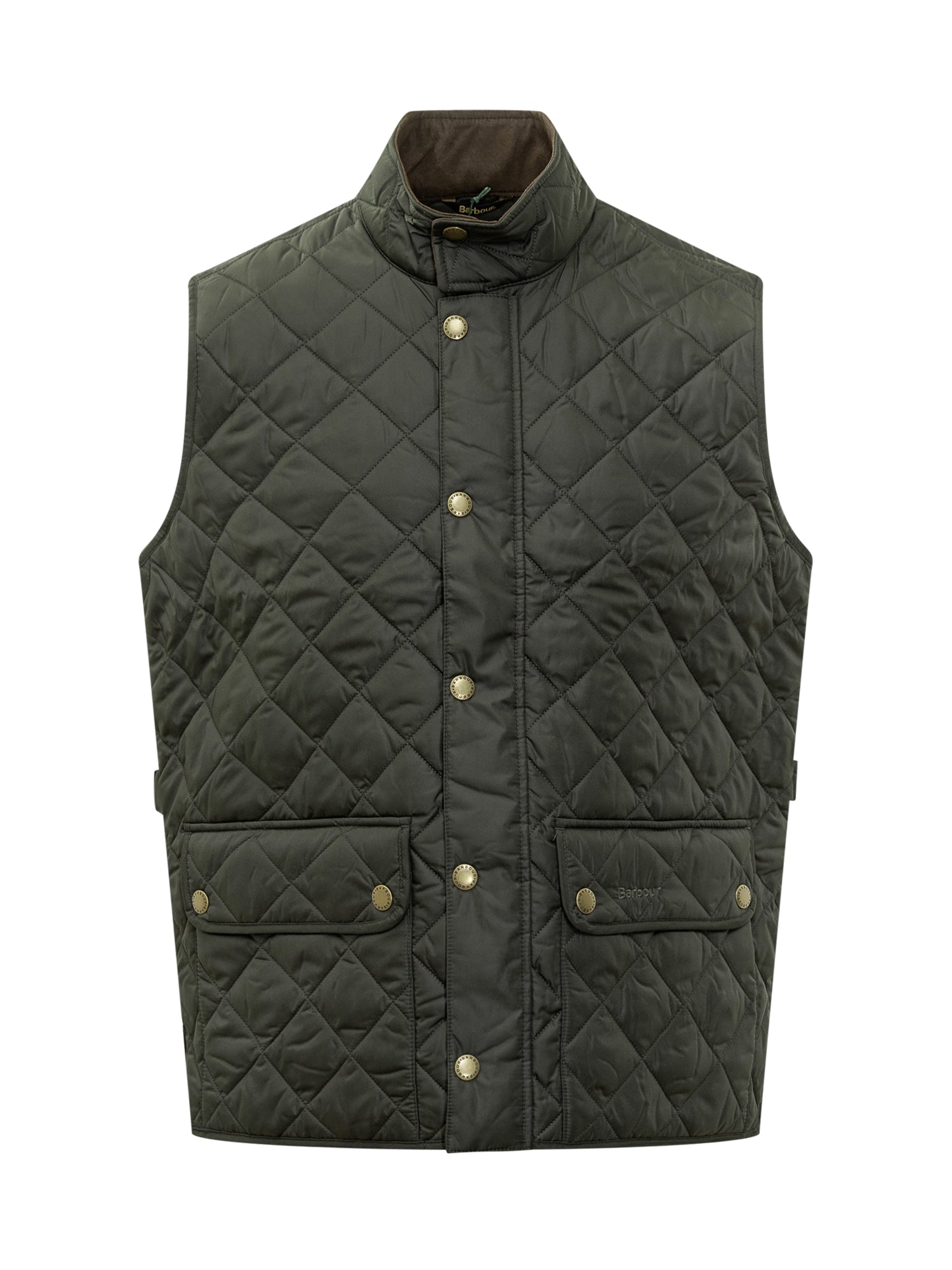 Gilet trapuntato verde con collo alto, chiusura a bottoni e tasche con patta.