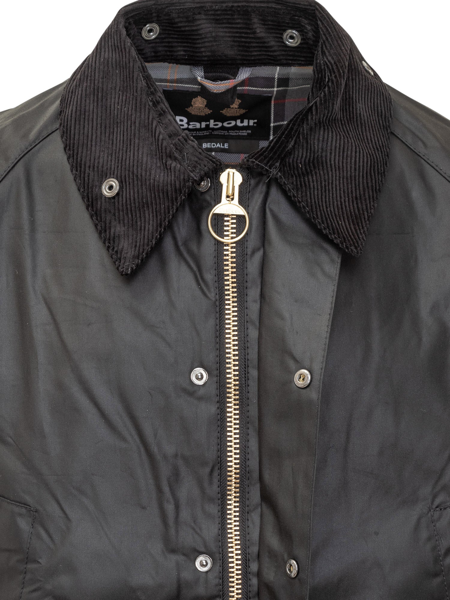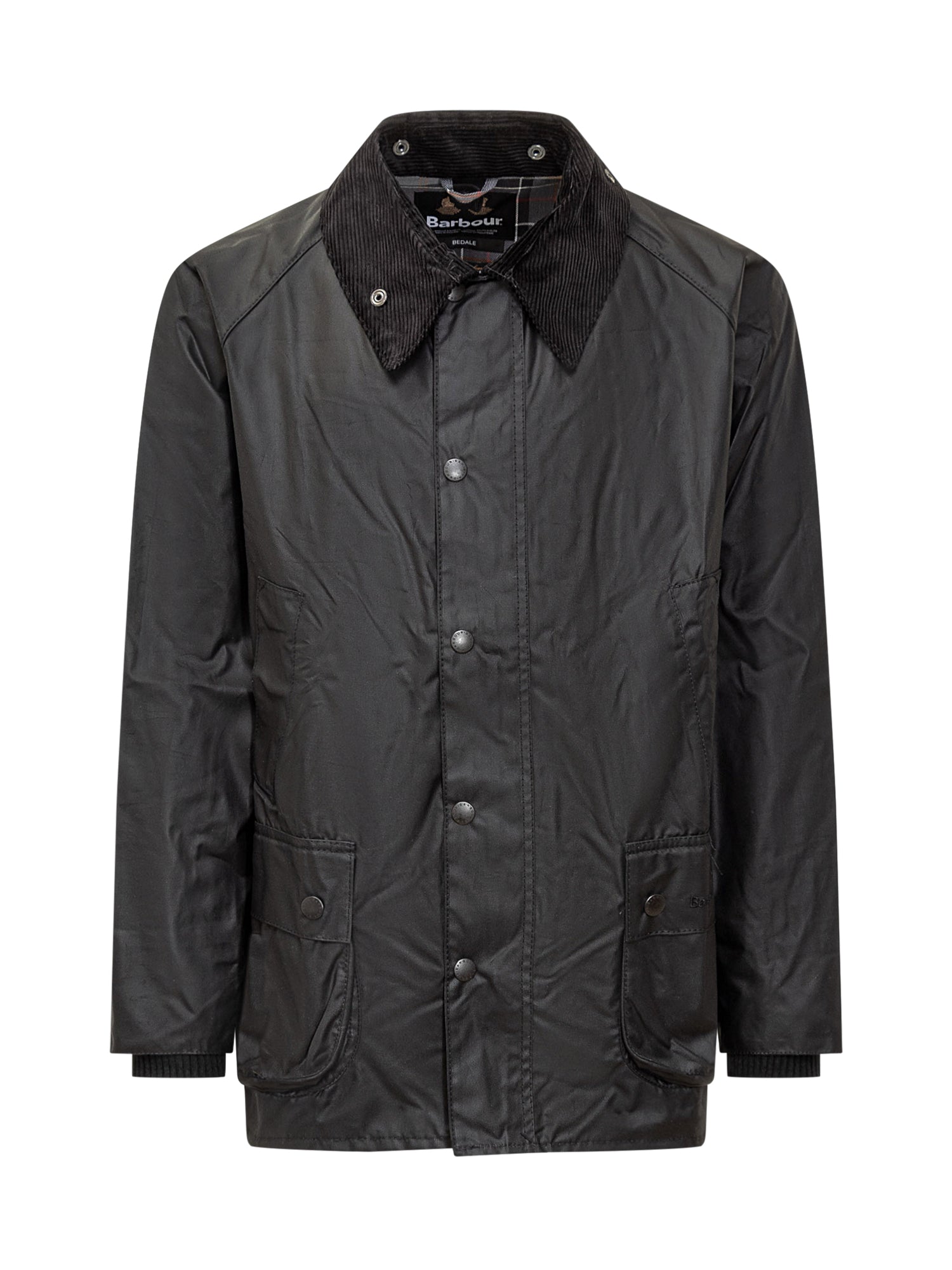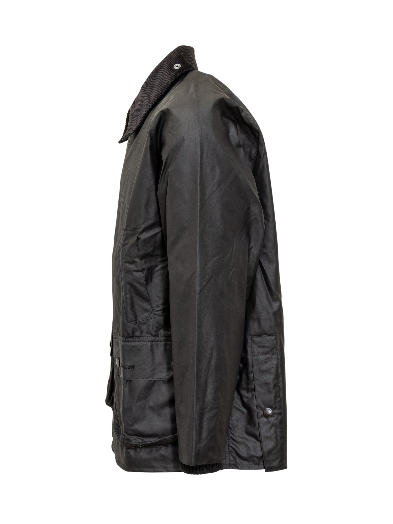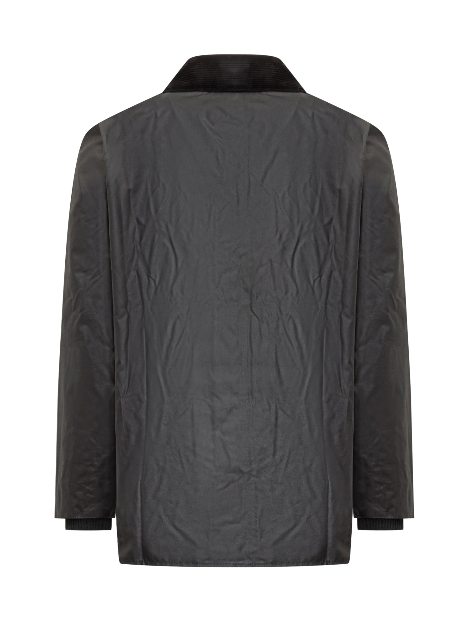 Giacca nero con rivestimento in cotone cerato. Colletto classico. Tasche sul lato. Tasche con patta e bottoni. Logo ricamato sul davanti. Chiusura con zip e bottoni.