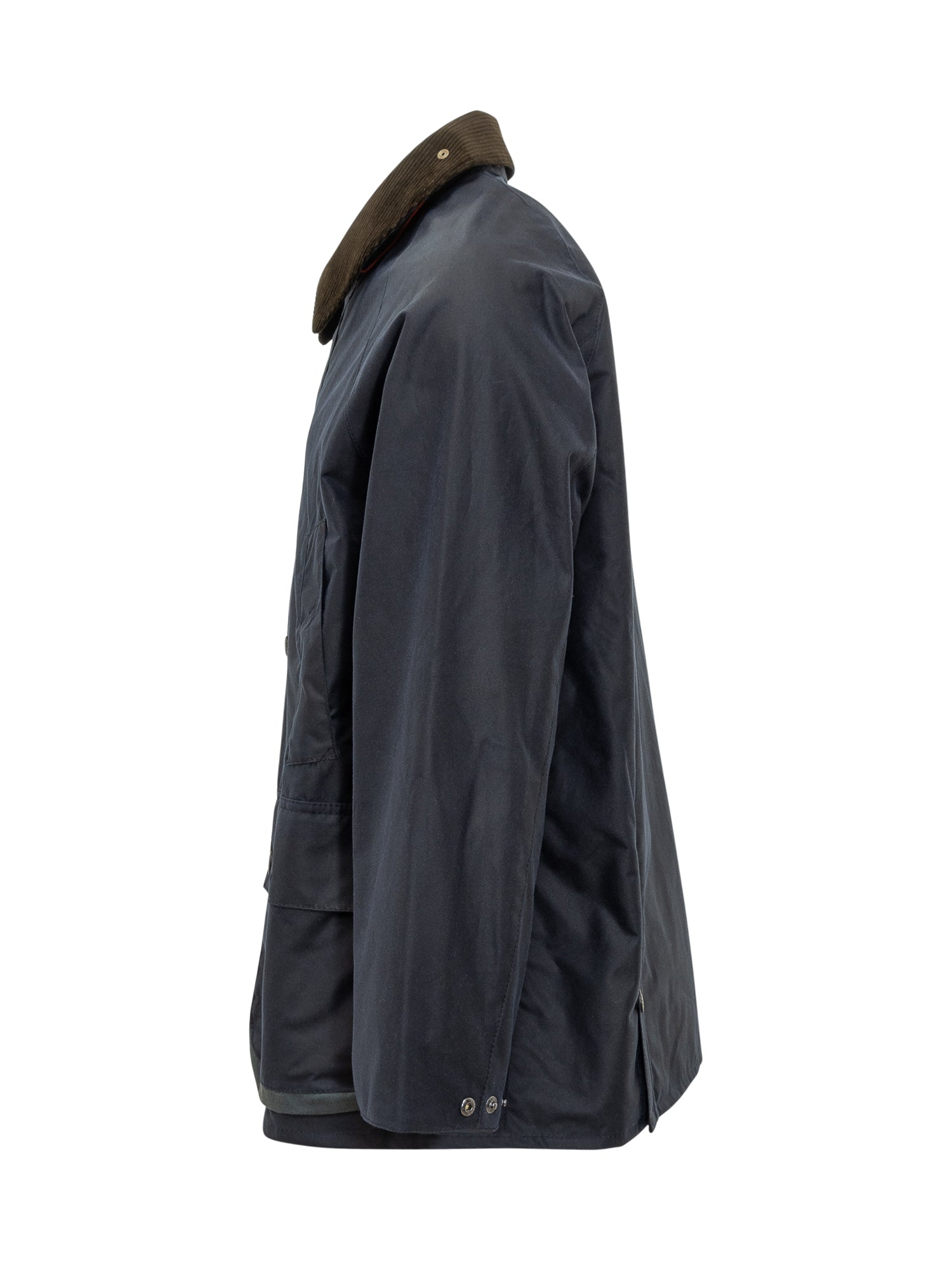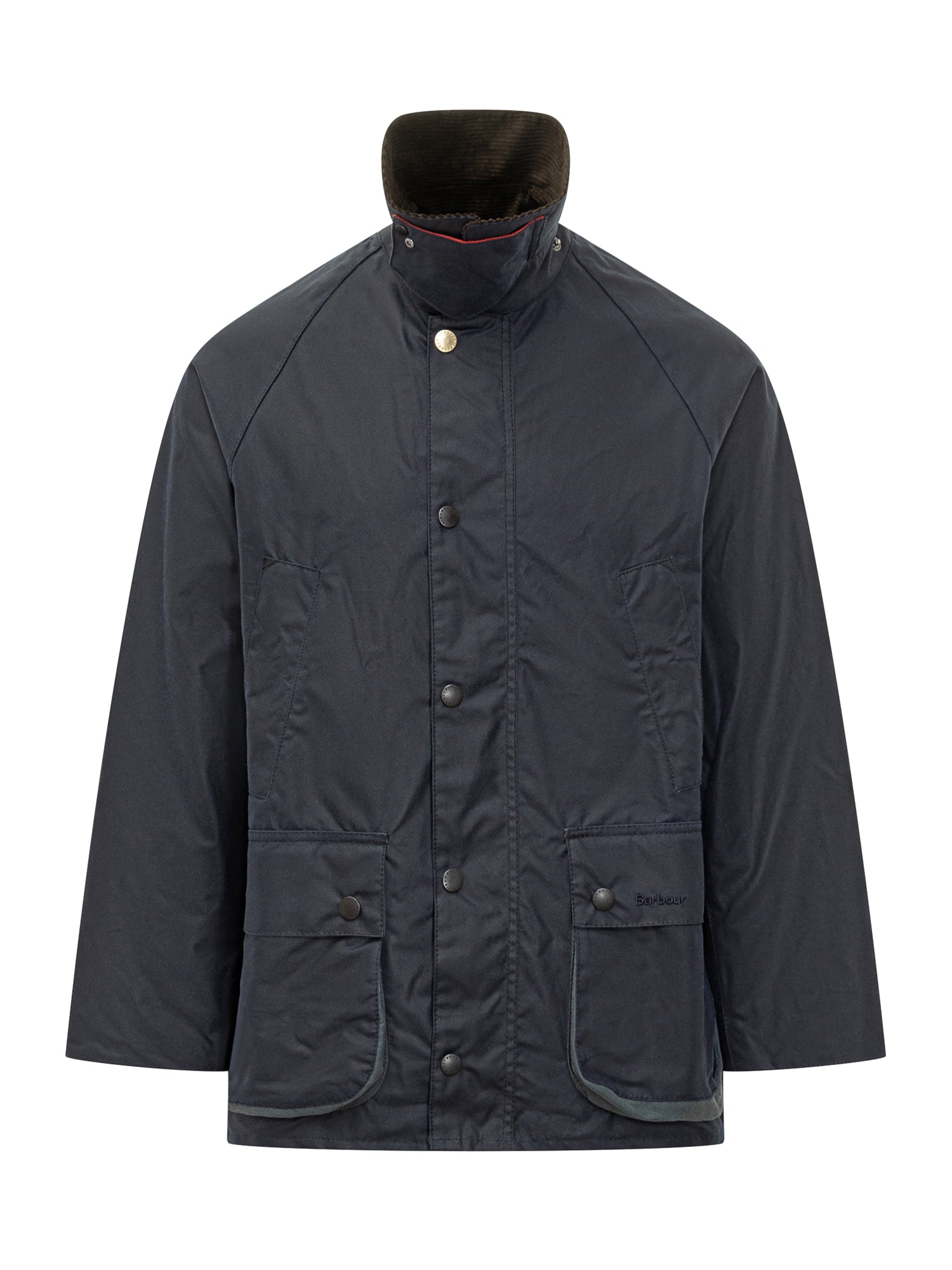 Giacca Barbour x Paul Smith in tessuto cerato blu, colletto in velluto a coste e fodera interna check con dettagli multicolore iconici di Paul Smith. Design funzionale e raffinato, perfetta per uno stile casual elegante con un tocco british contemporaneo.