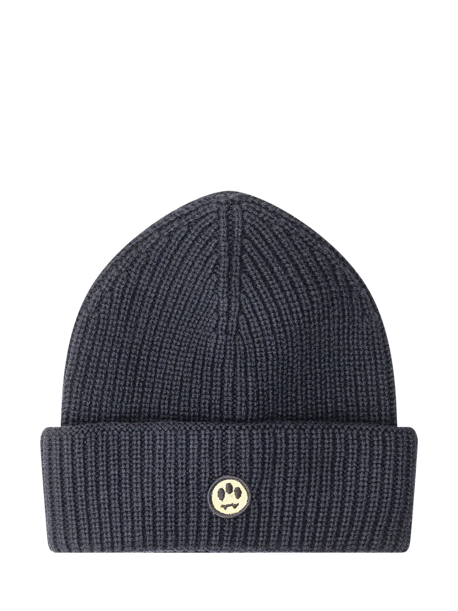 Beanie Barrow nero in maglia a coste con risvolto e patch frontale smile giallo.