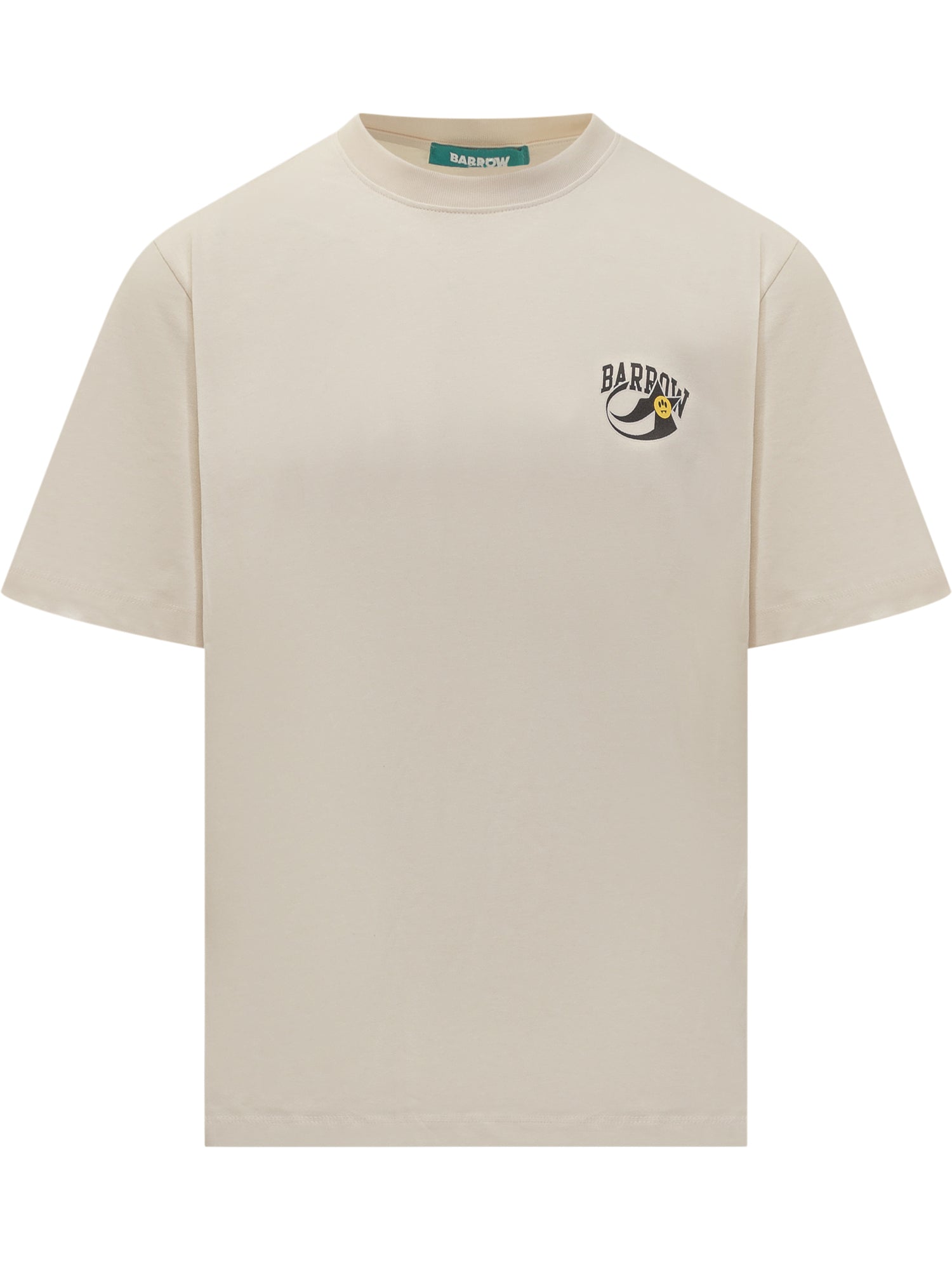 T-shirt Barrow in cotone beige a maniche corte, con logo curvo e piccola emoji gialla sul petto.