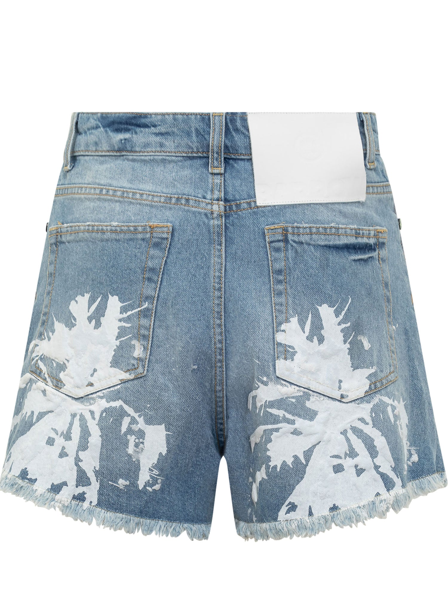 Shorts in jeans. Chiusura con zip e bottone logato. Passanti per cintura. Cinque tasche. Stampa materica tridimensionale effetto spray sul davanti e sul retro.