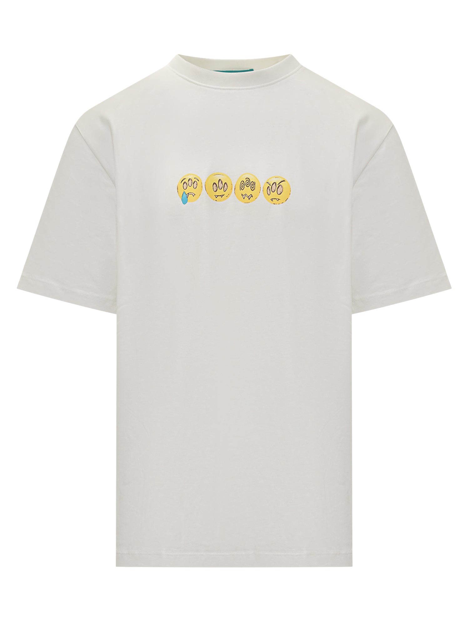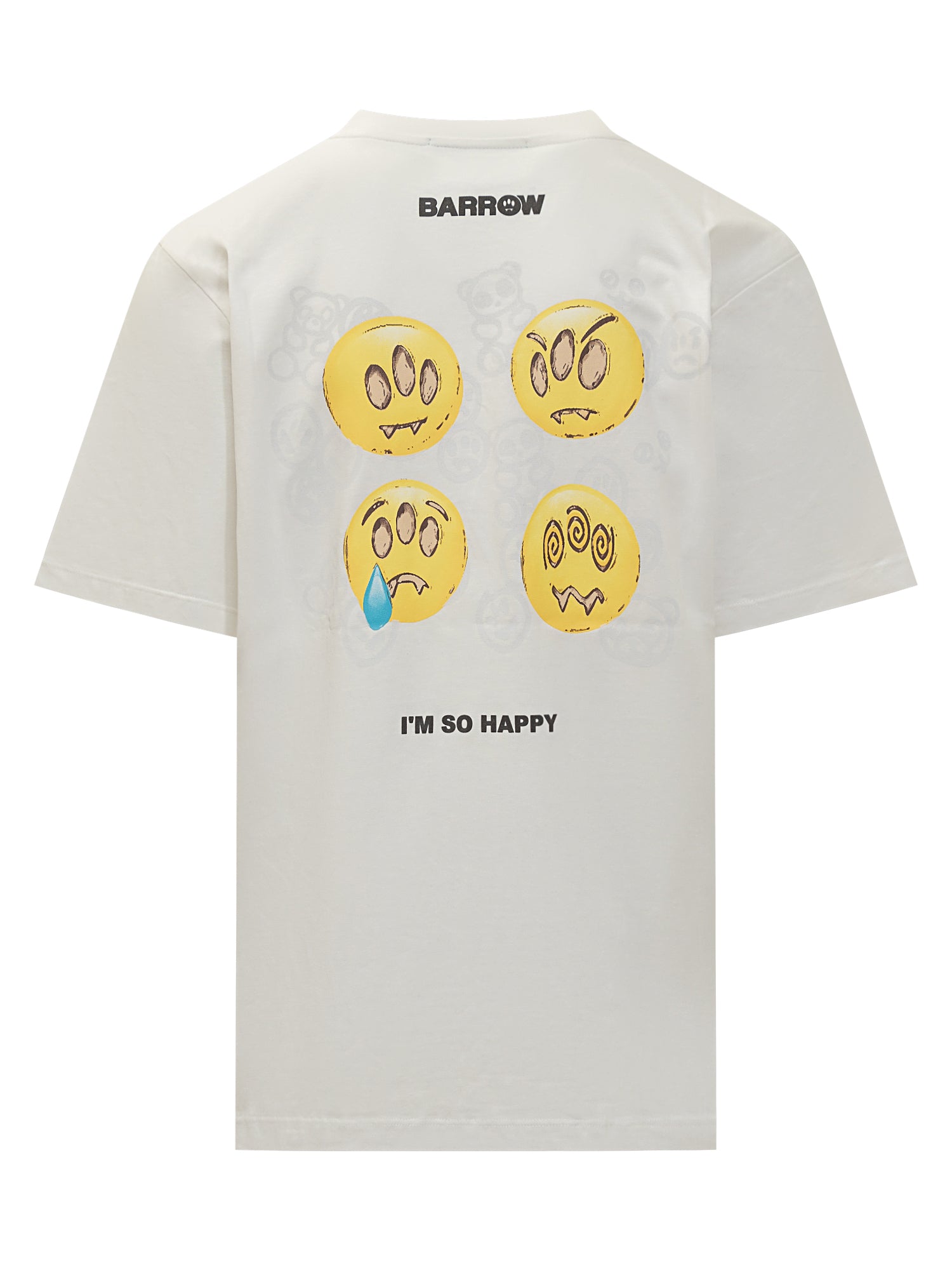 T-shirt in cotone bianco con stampa centrale di quattro smiley Barrow espressivi. Vestibilità oversize per un look giocoso e street.