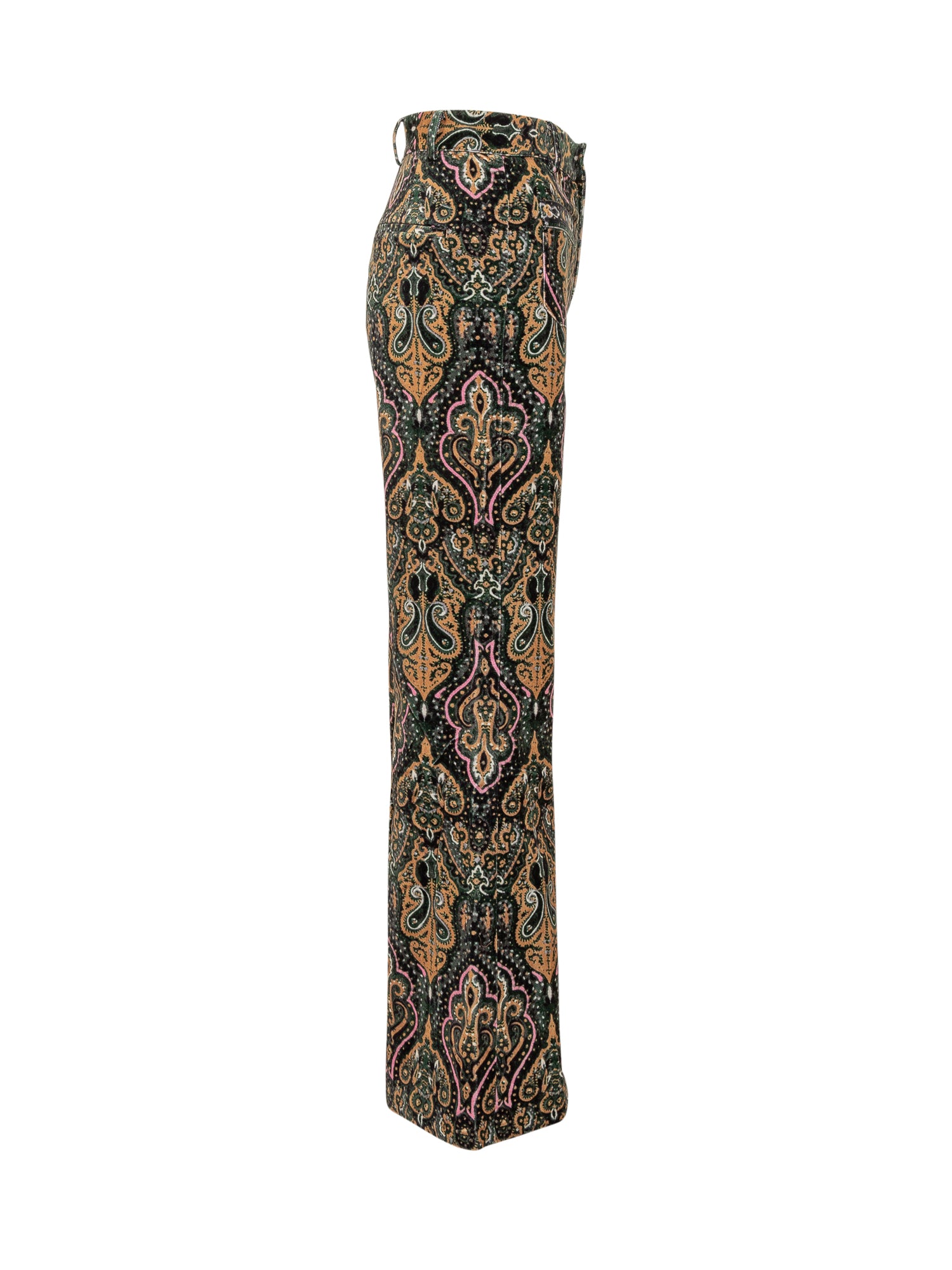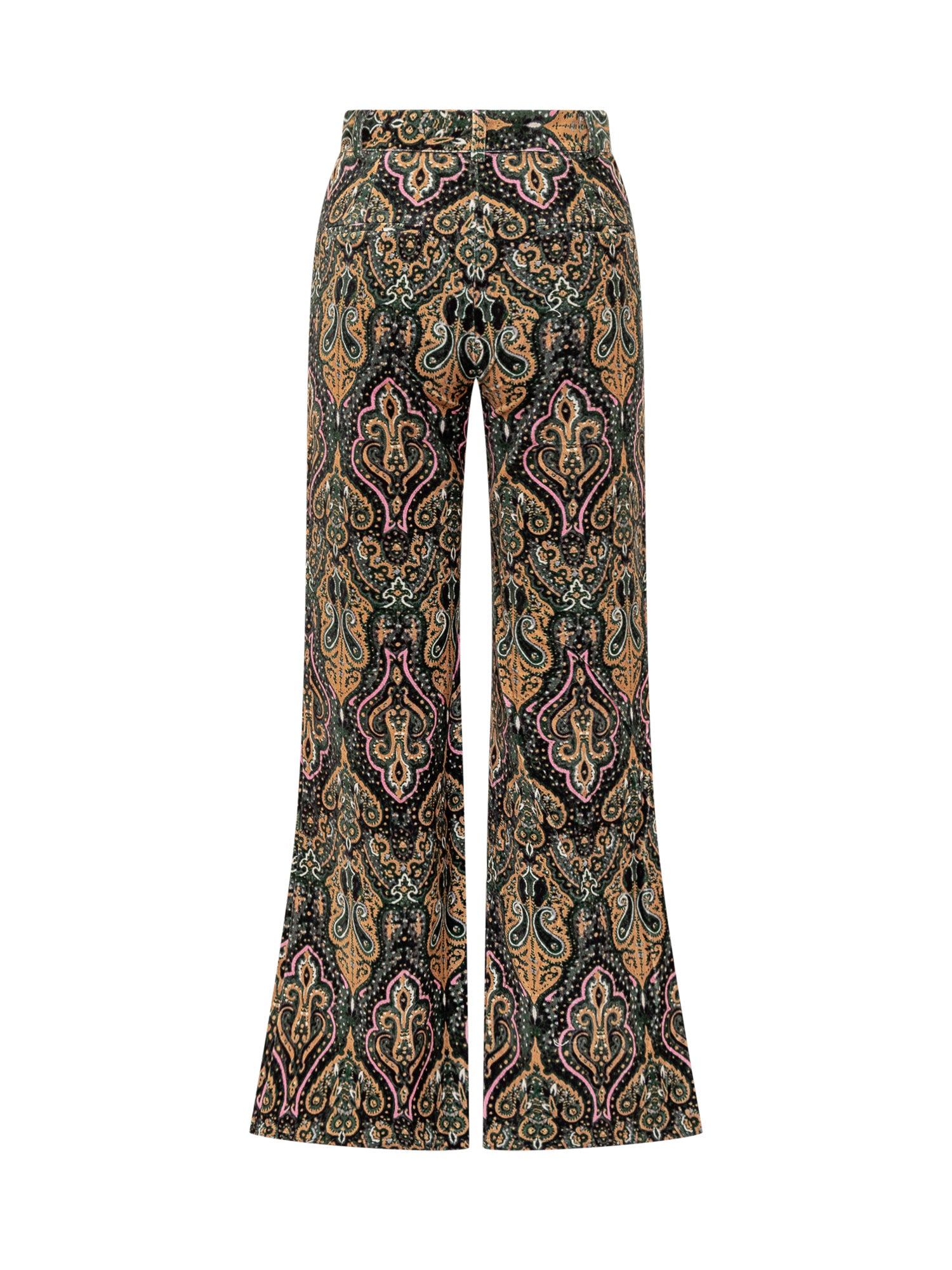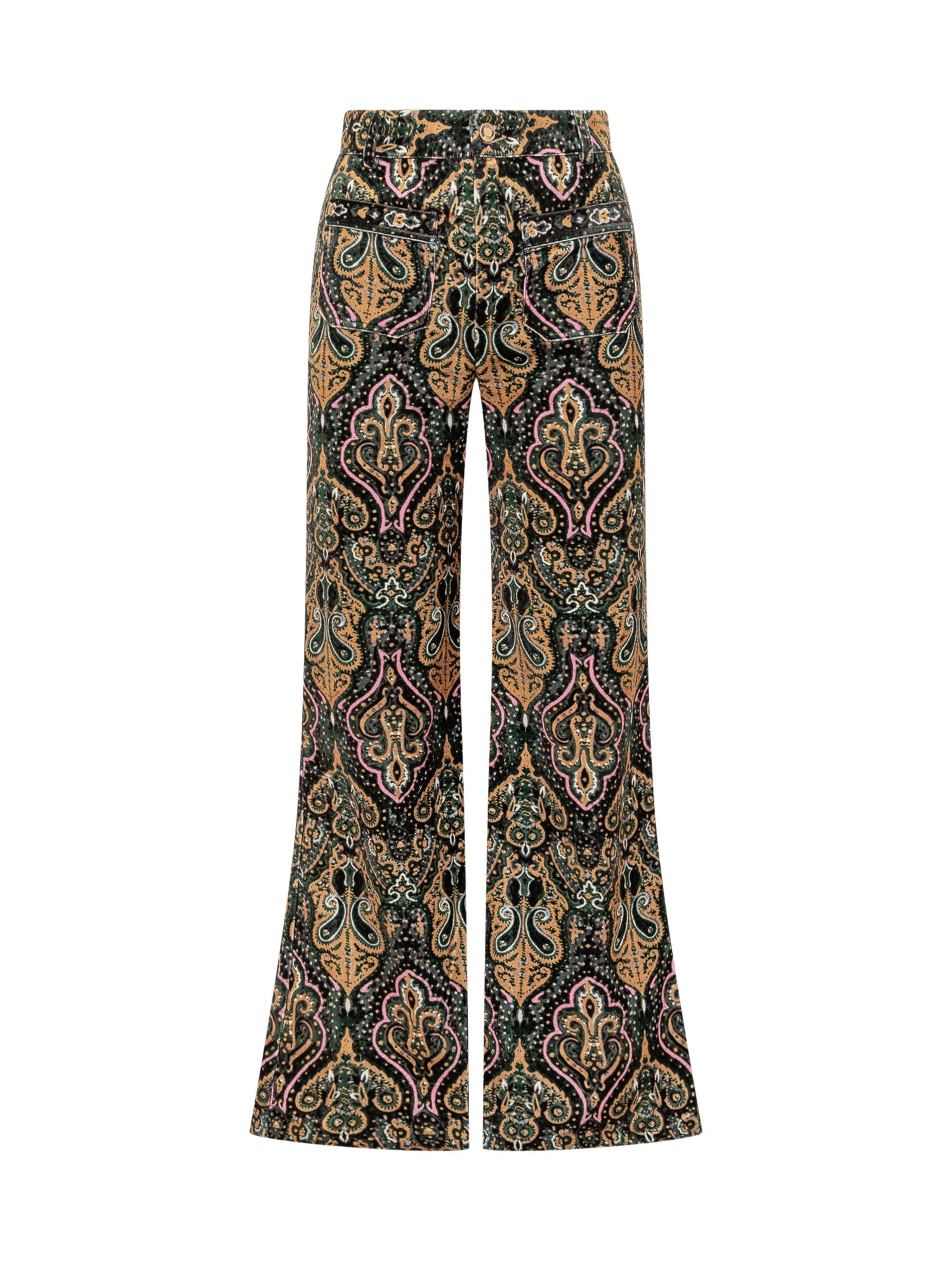 Pantaloni Ba&sh in velluto con stampa paisley multicolore, vita alta e gamba svasata. Chiusura con zip e bottone.