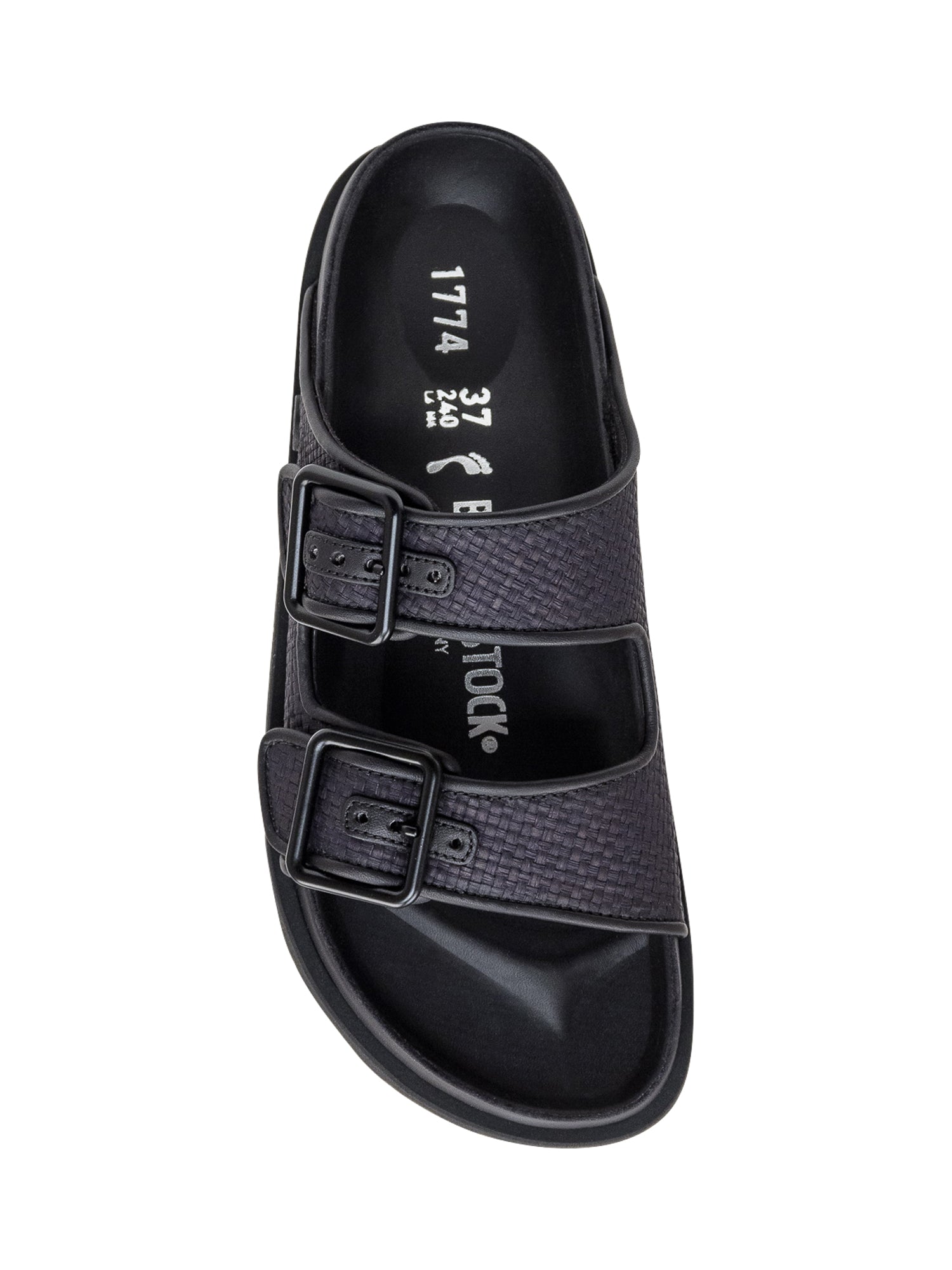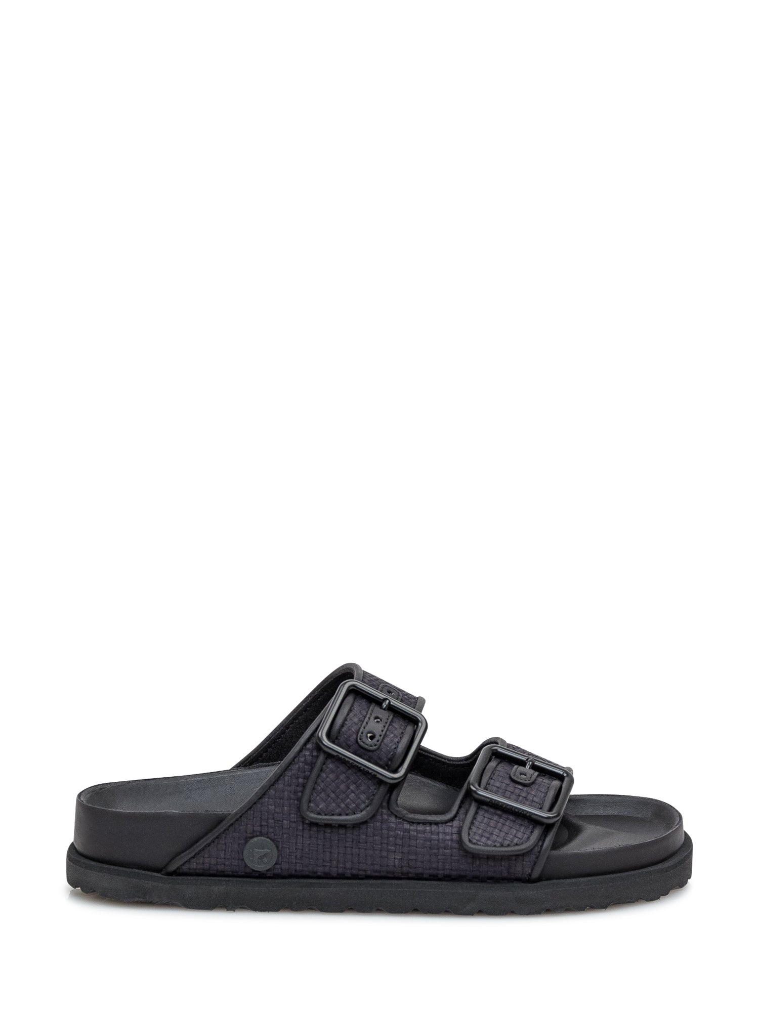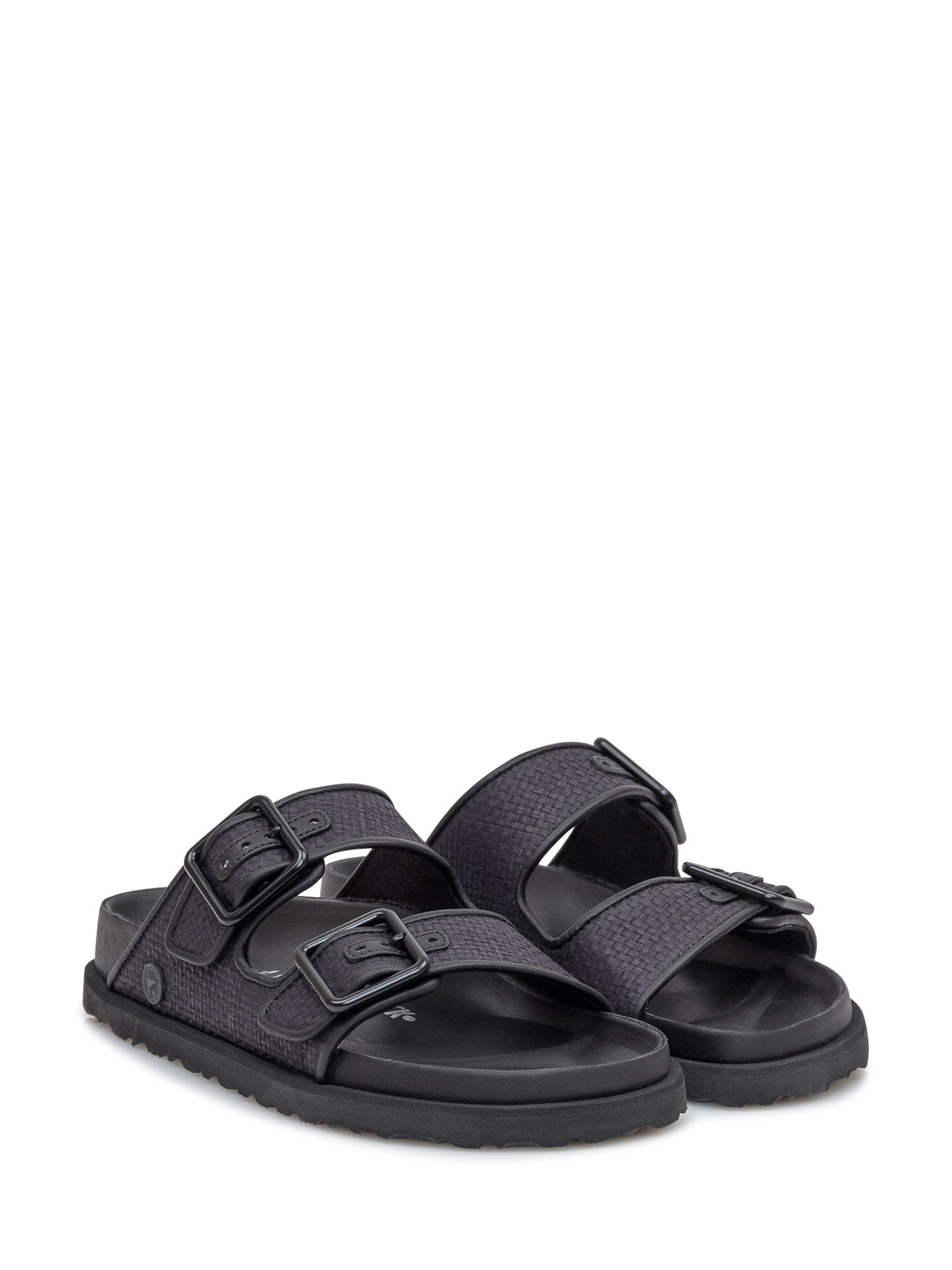 Sandalo in rafia nero. Cinturini regolabili. Profili in pelle. Calzata: acquista la tua misura solita.
