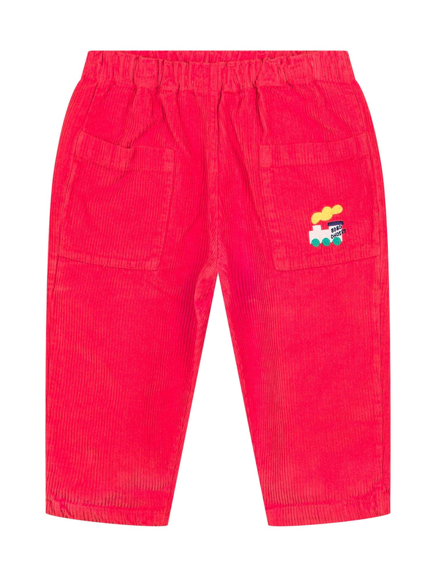 Pantaloni Bobo Choses in velluto rosso con tasche applicate e simpatica stampa treno.