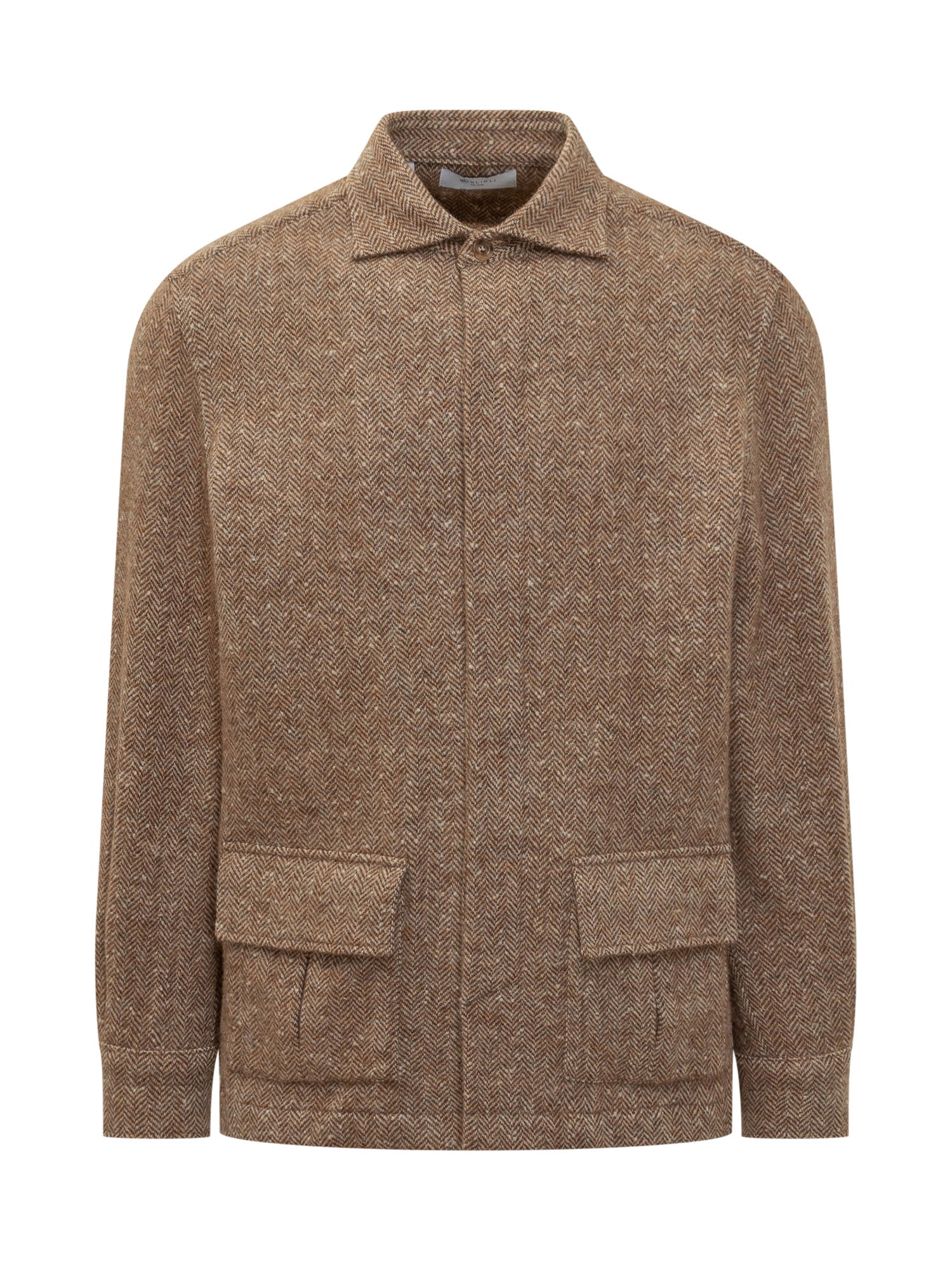 Giacca Boglioli in lana marrone con motivo spina di pesce. Modello con colletto classico, chiusura frontale nascosta e tasche con patta.