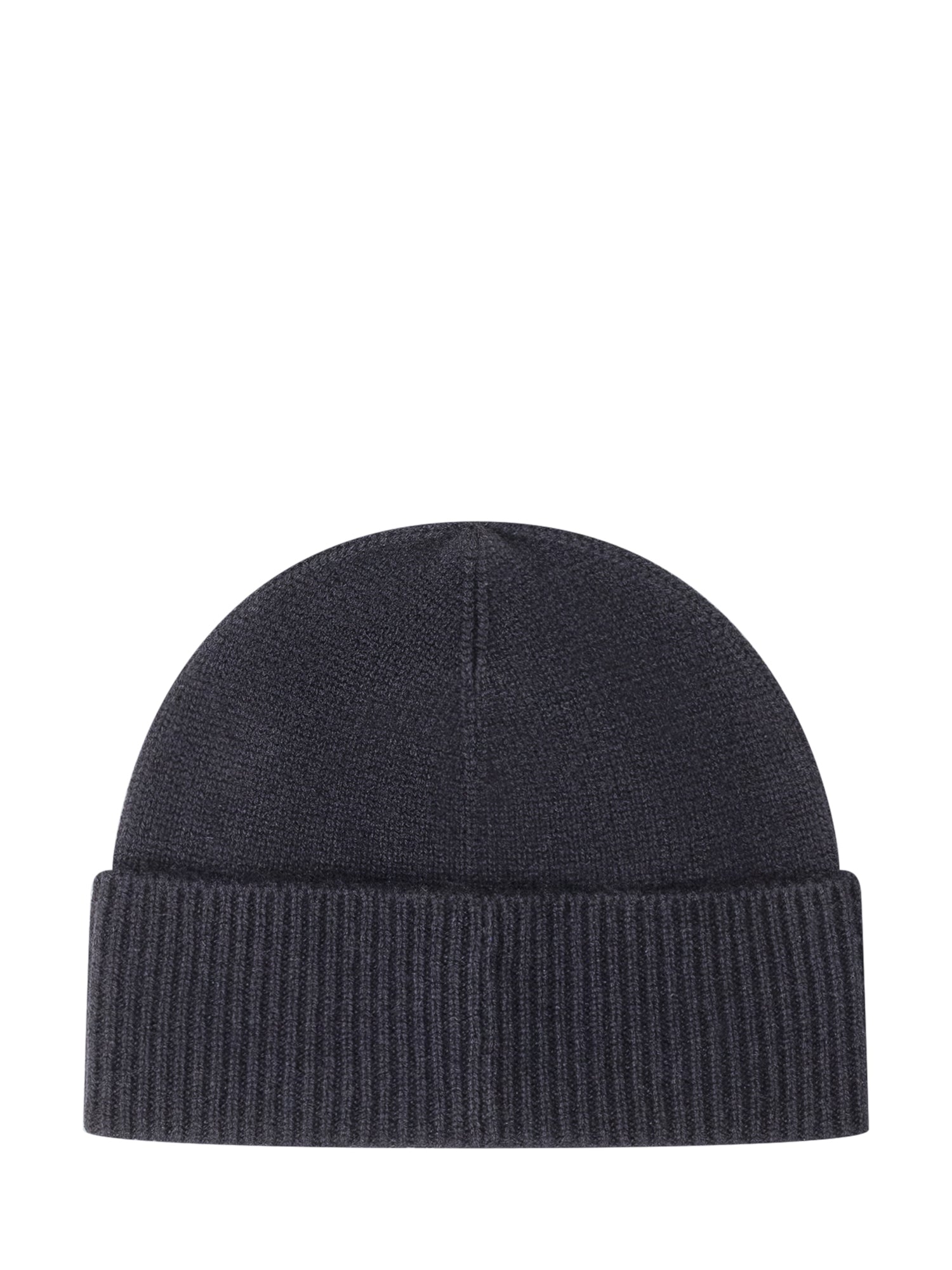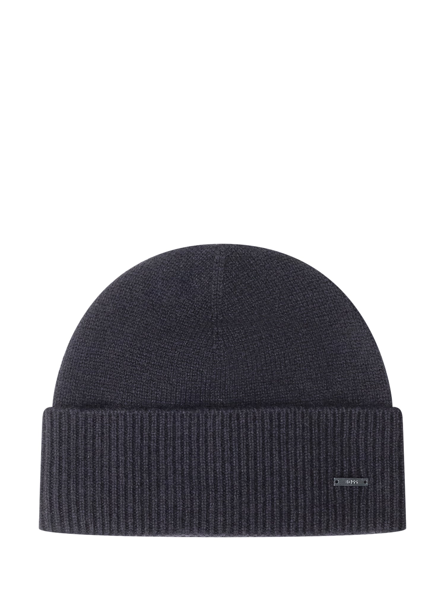 Cappello Boss in cashmere blu con risvolto e dettaglio logo metallico. Un accessorio essenziale per le giornate fredde.
