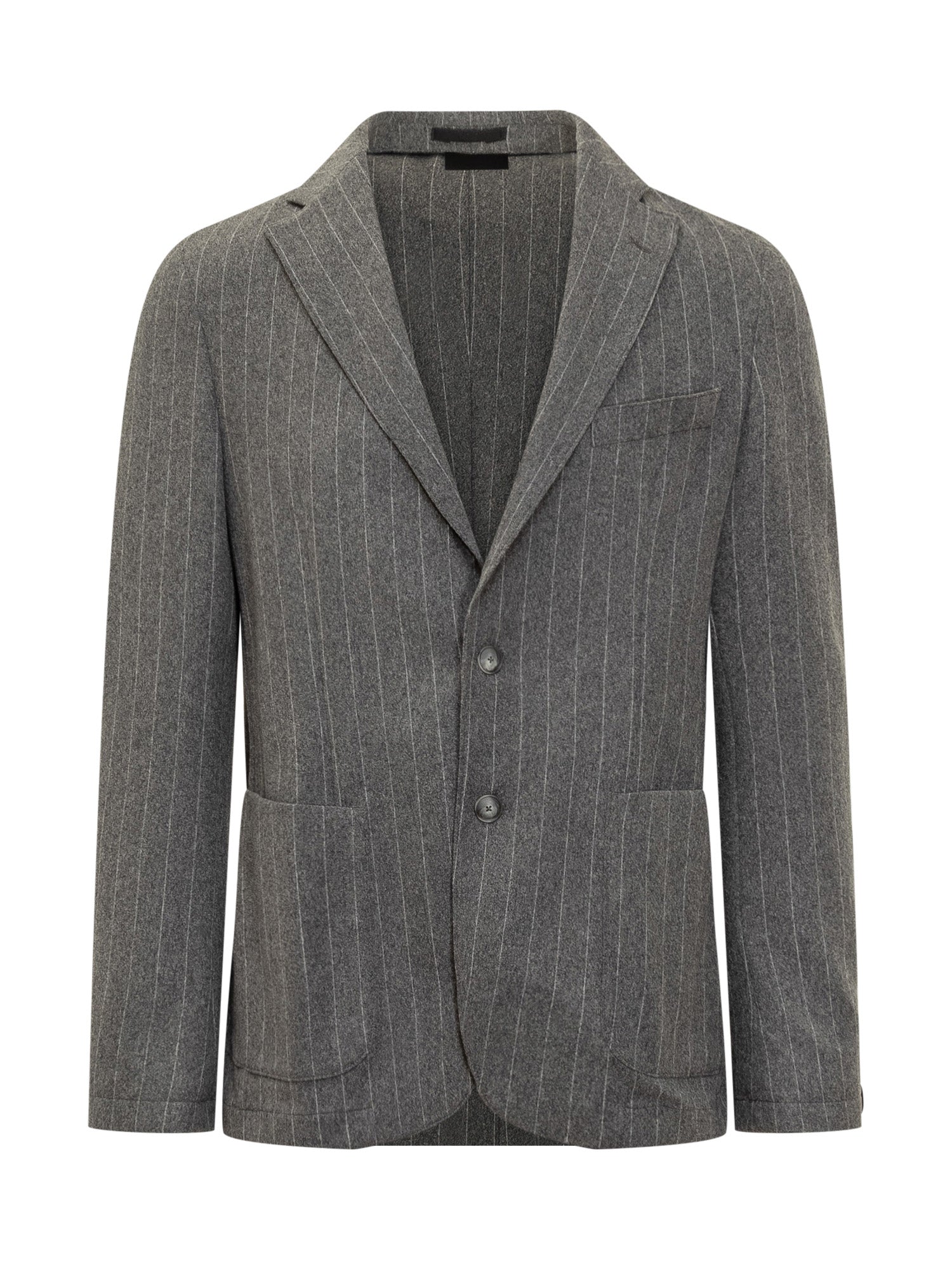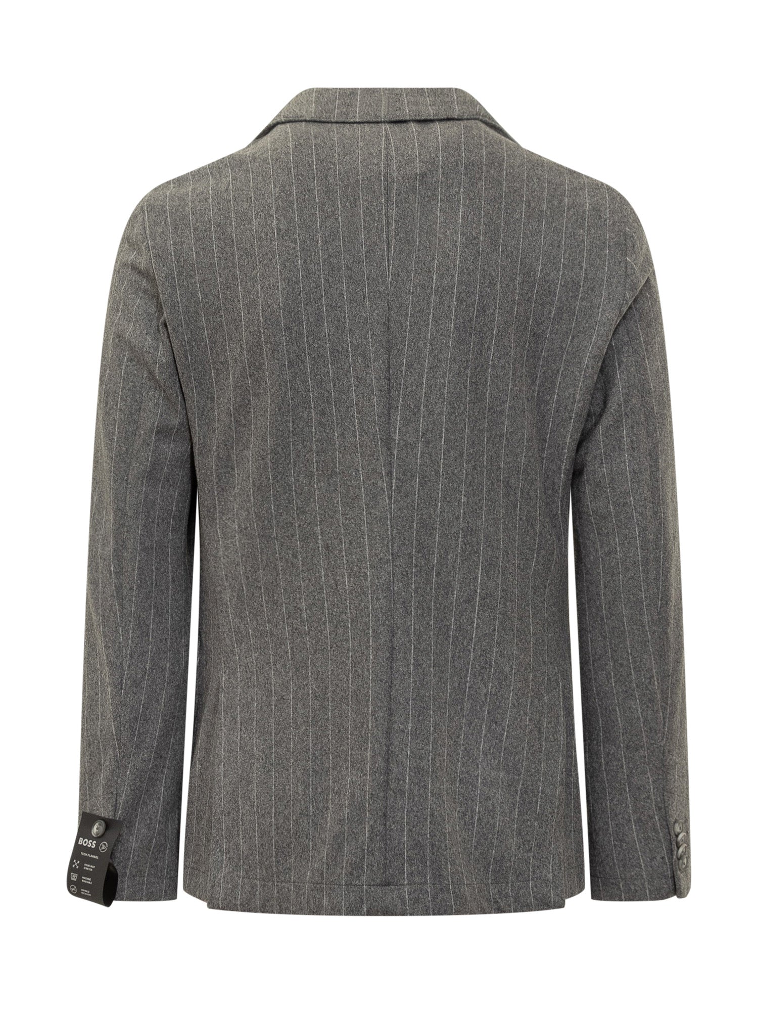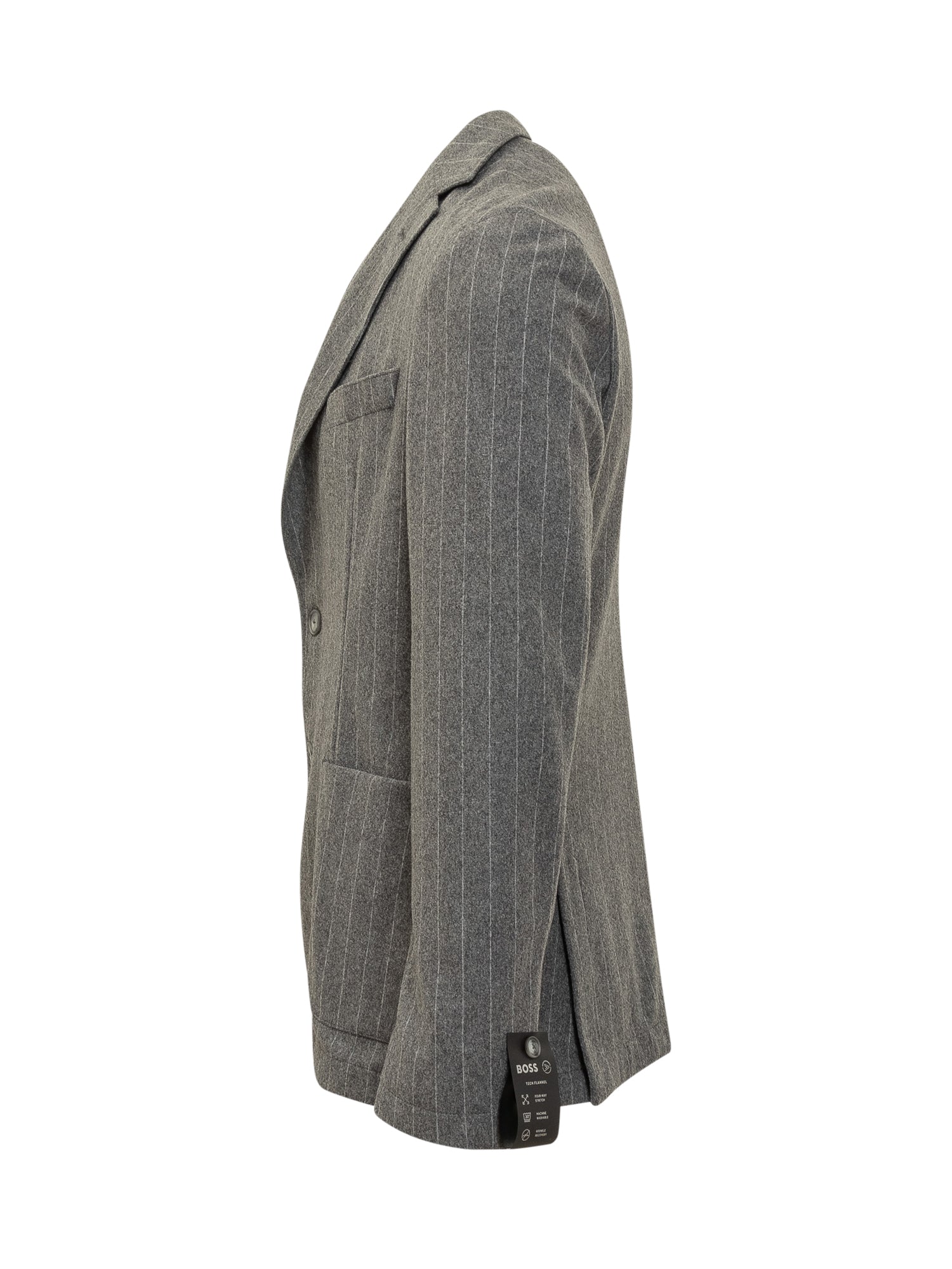 Giacca Boss in lana grigia con motivo a righe verticali, chiusura a due bottoni e tasche applicate.