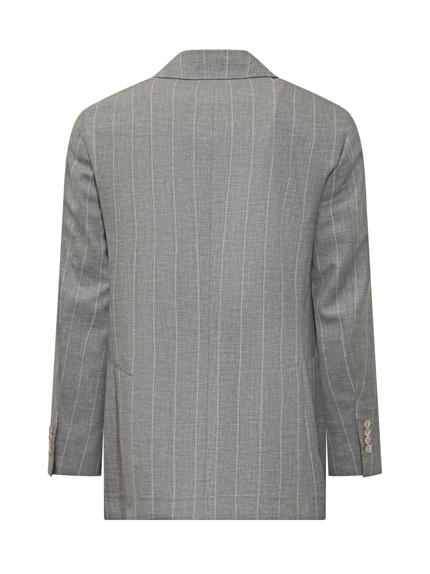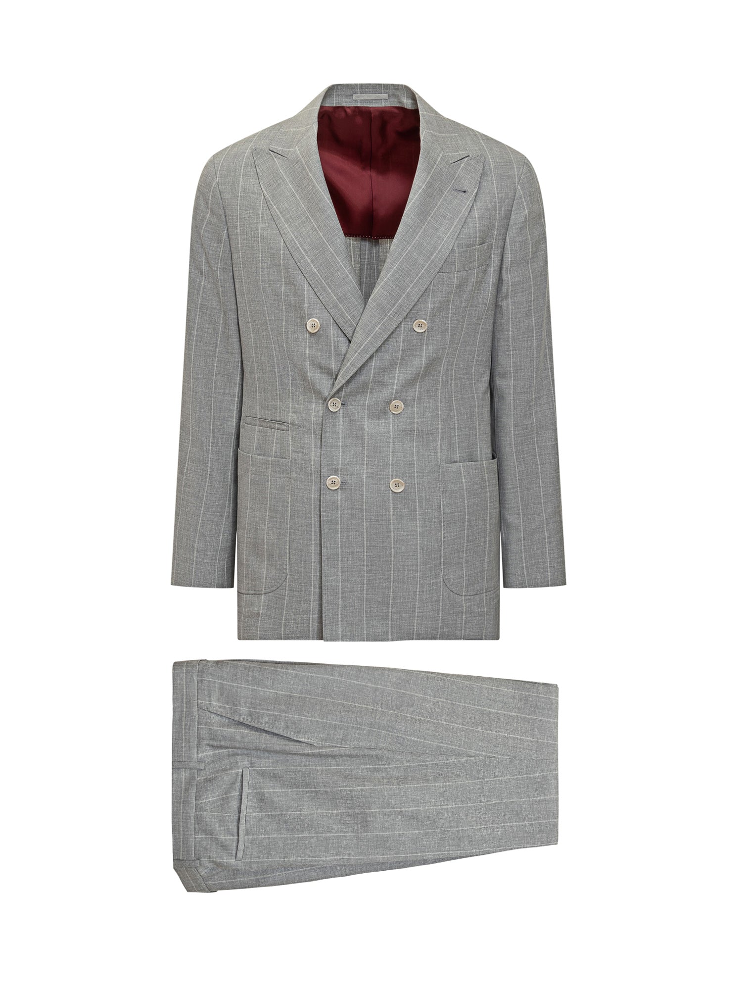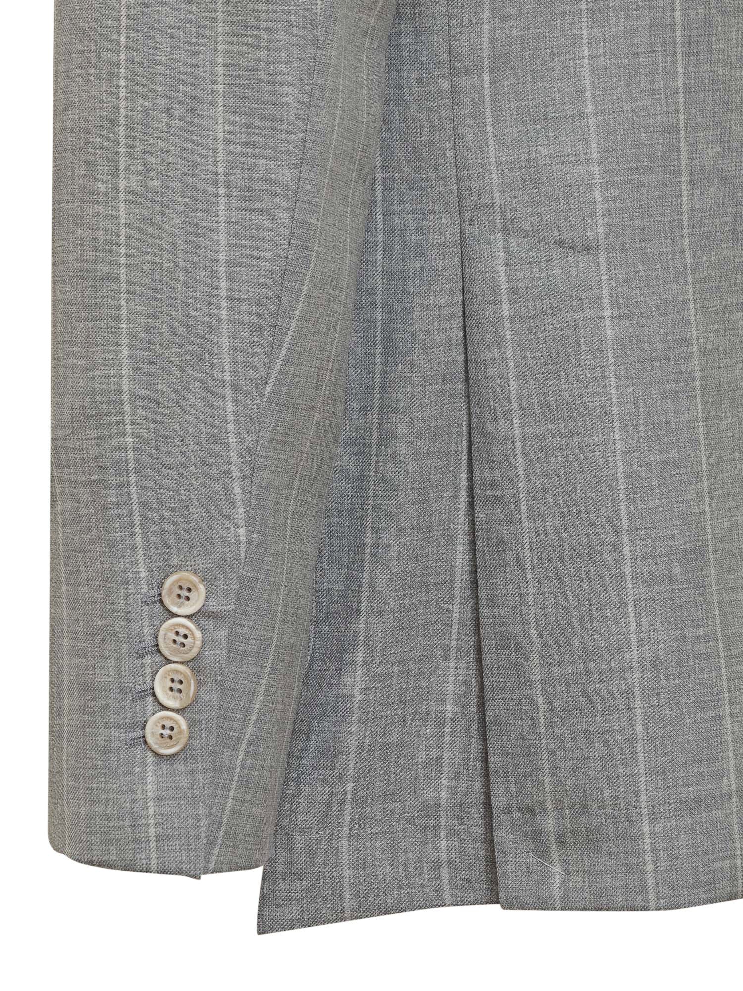 Abito grigio in lana. Giacca con collo revers. Tasche frontali. Chiusura con bottoni. Pantaloni con passanti per cintura. Tasche laterali e posteriori. Chiusura con zip e gancio.