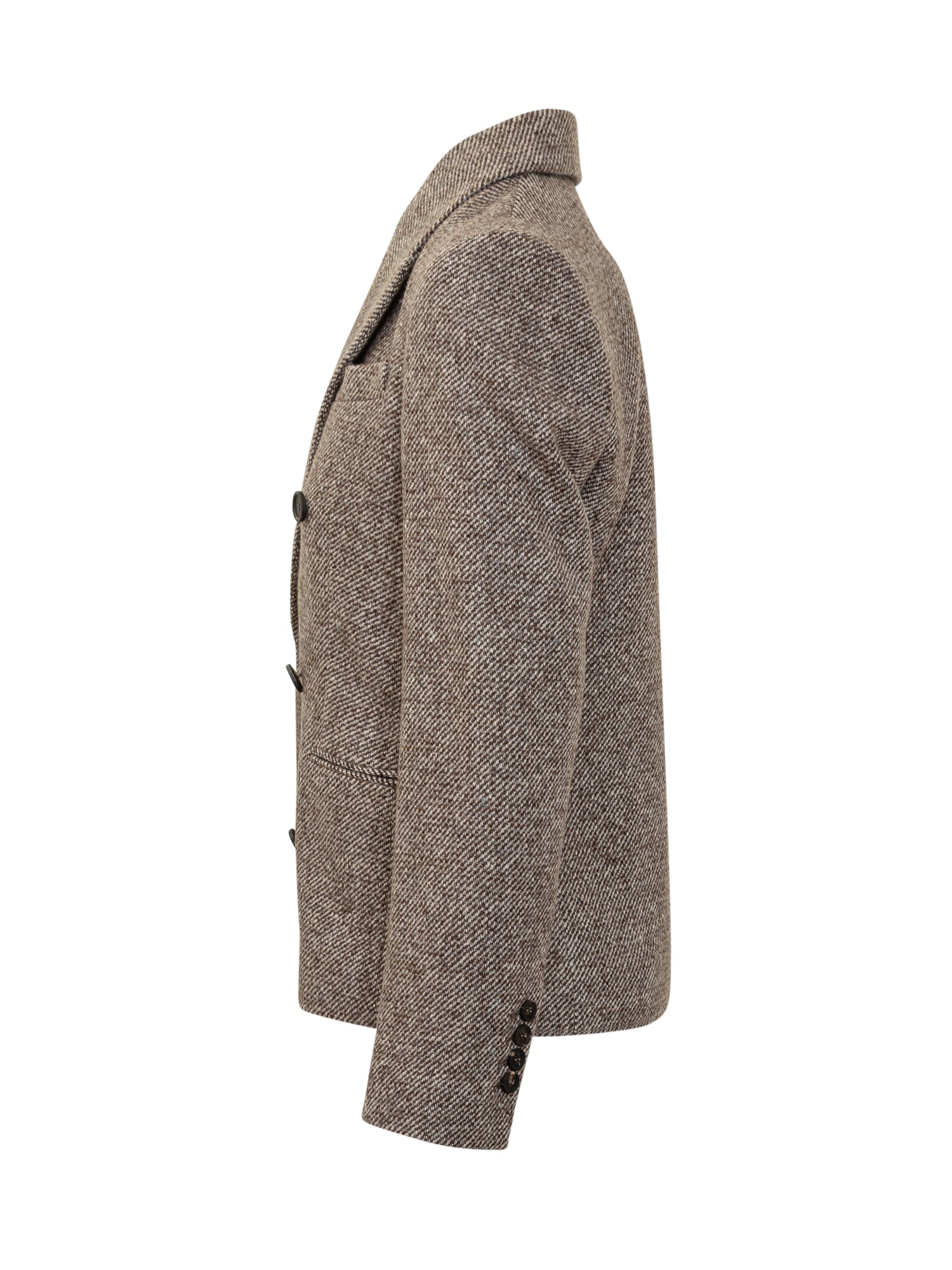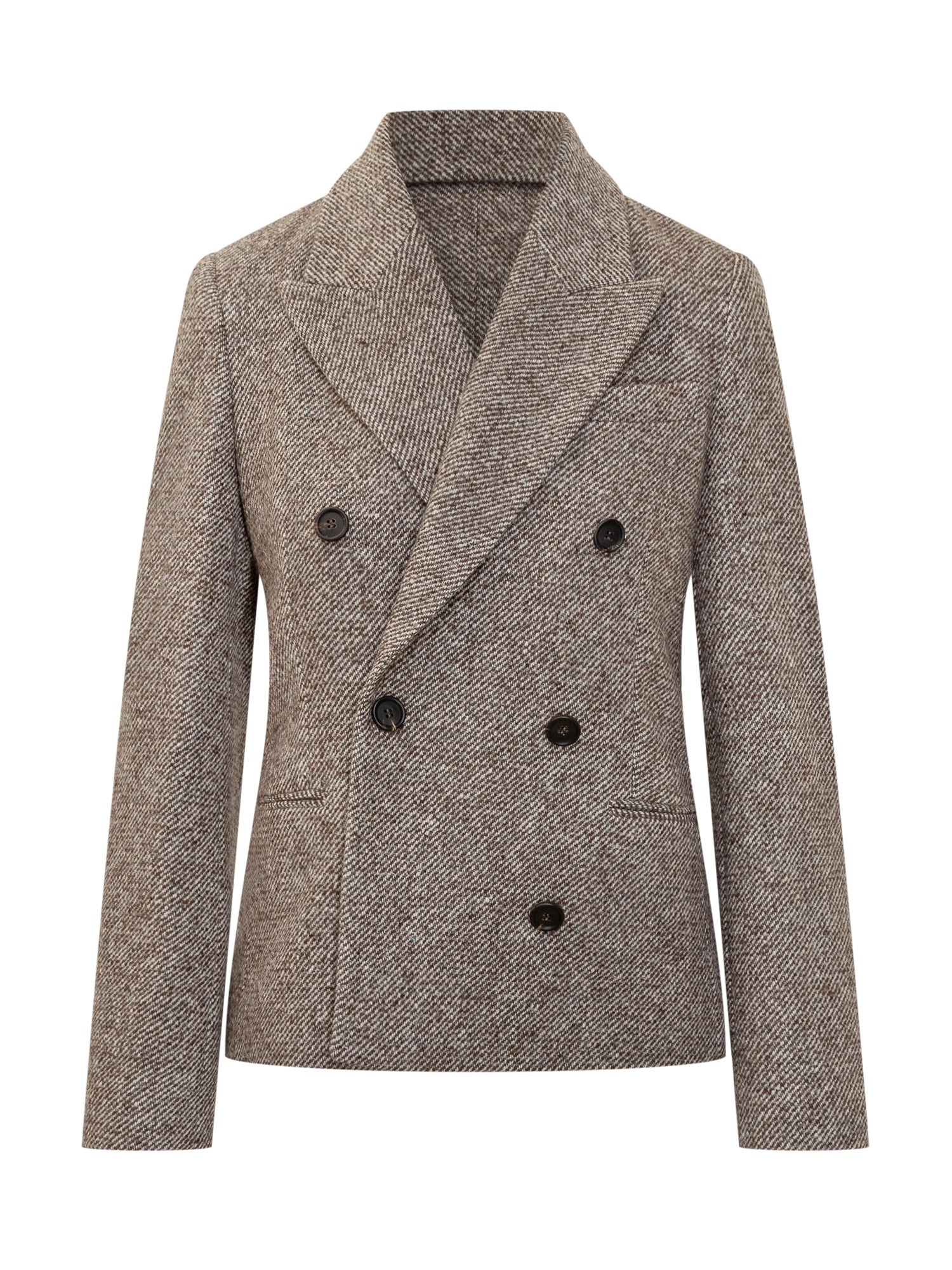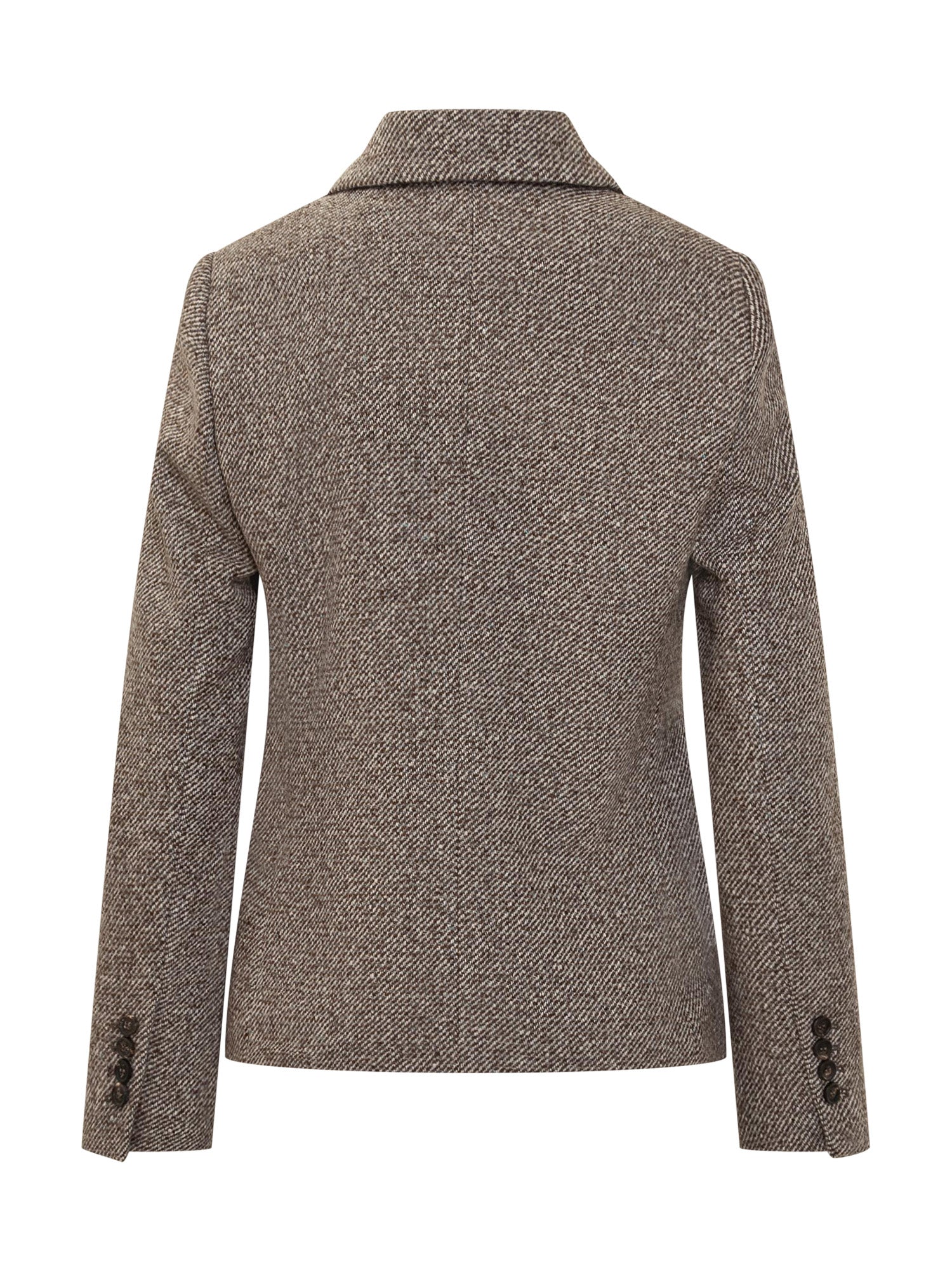Eleganza sartoriale e stile senza tempo si fondono in questo blazer doppiopetto firmato Brunello Cucinelli. Realizzato in pregiato tweed di lana marrone con lavorazione a spina di pesce, presenta rever classici, tasche frontali a filetto e chiusura a sei bottoni.