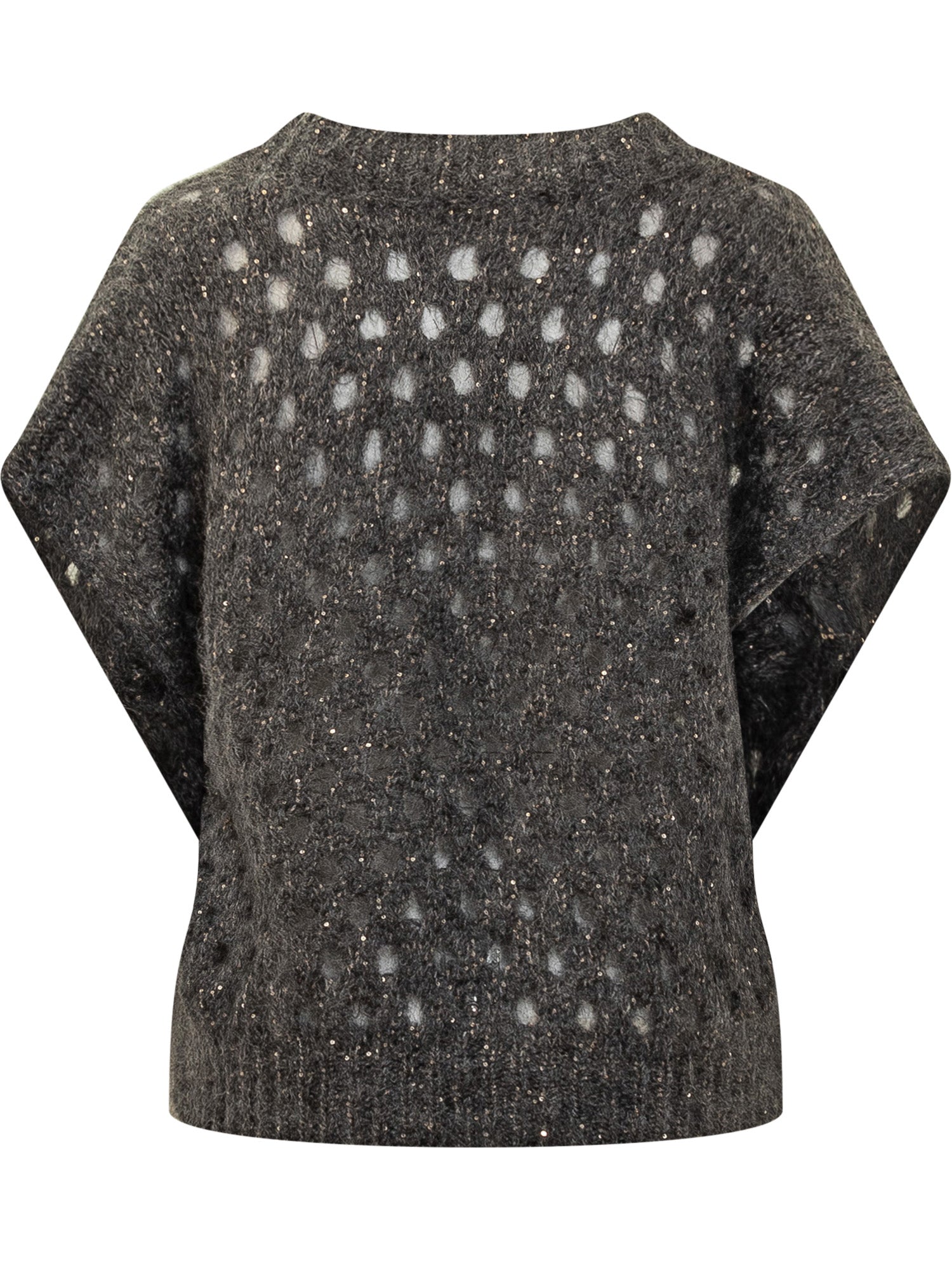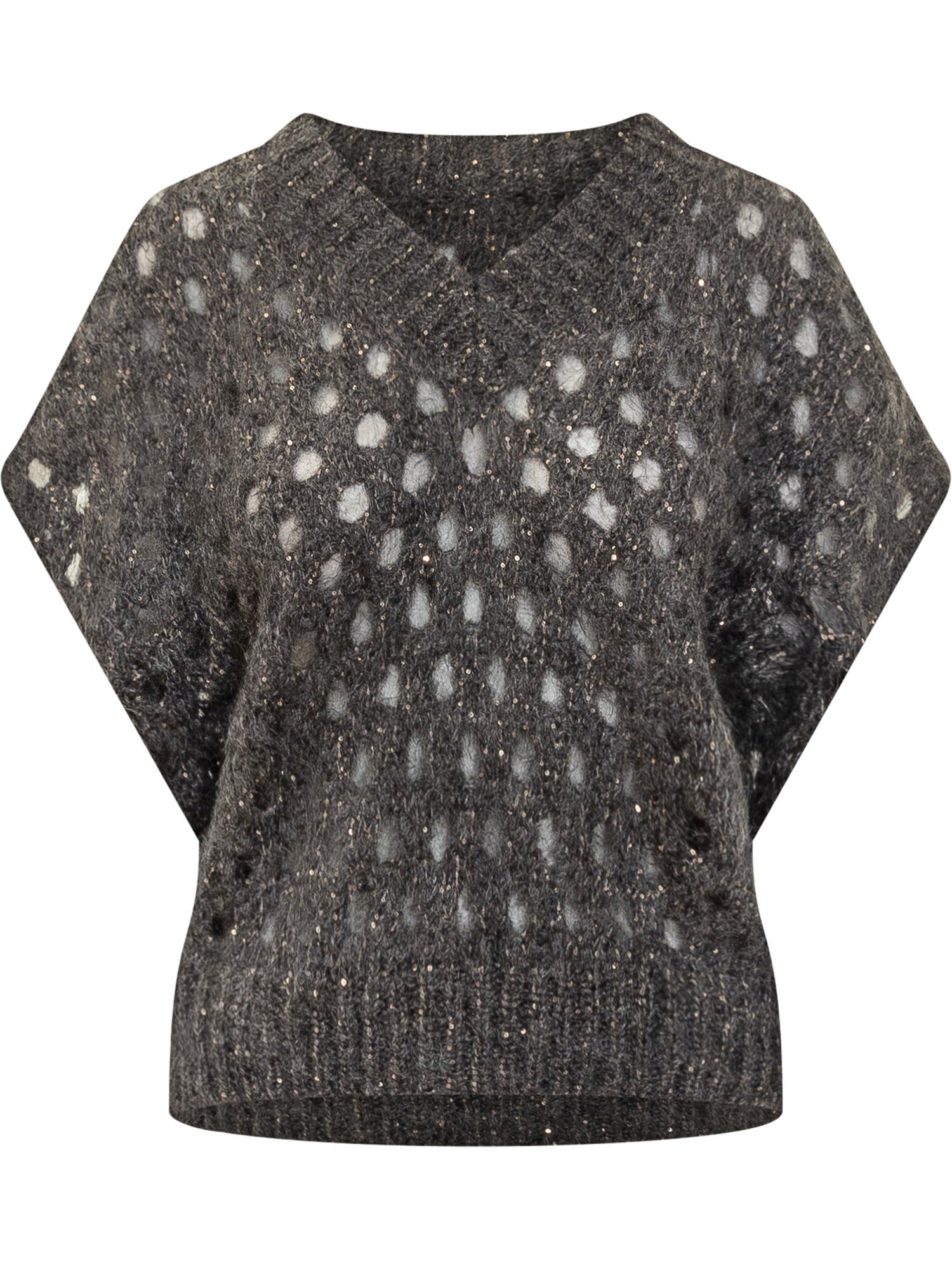 Questo gilet, firmato Brunello Cucinelli, realizzato in prezioso mohair misto lana, presenta una lavorazione traforata che dona leggerezza e movimento. Le micro paillettes tono su tono aggiungono un tocco luminoso e sofisticato. Il design con scollo a V e maniche ad aletta lo rende perfetto da sovrapporre a camicie o bluse per look raffinati e femminili.
