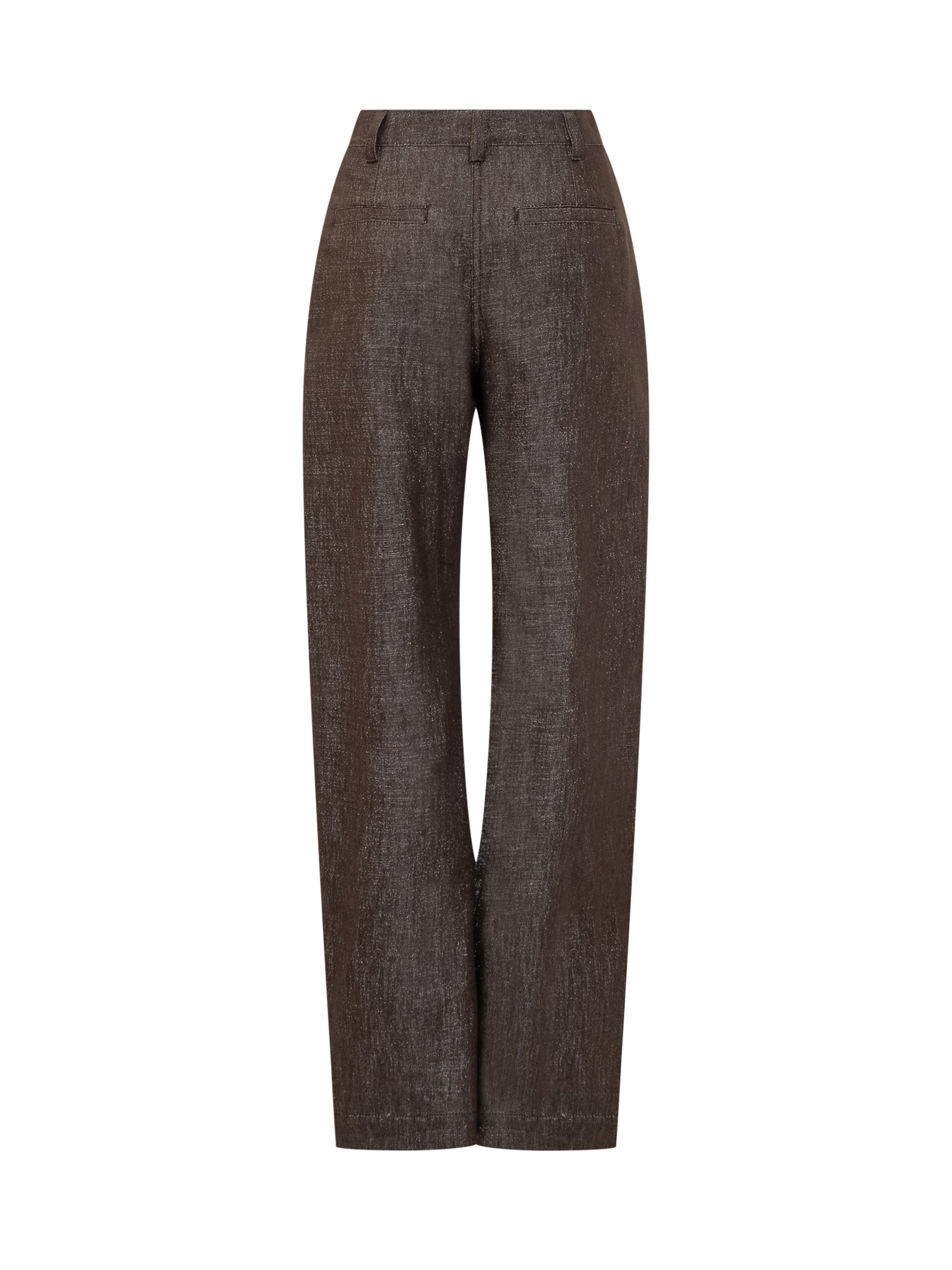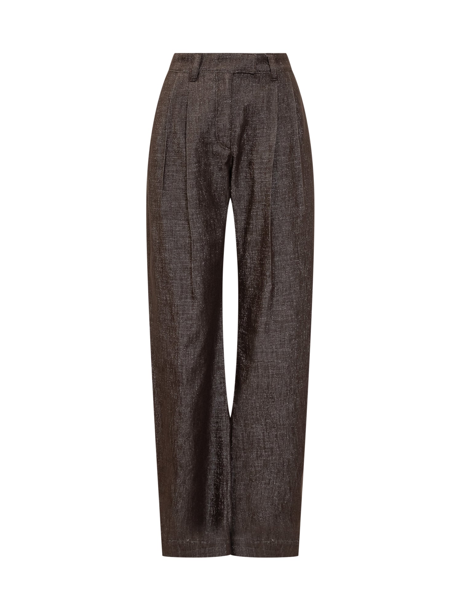 Pantalone ampio dalla linea maschile, firmato Brunello Cucinelli. Realizzato in pregiato lino metallizzato, regala luce e raffinatezza al look. Le pinces frontali valorizzano la silhouette. Chiusura automatica con zip, bottone e gancio per una vestibilità impeccabile e sicura.