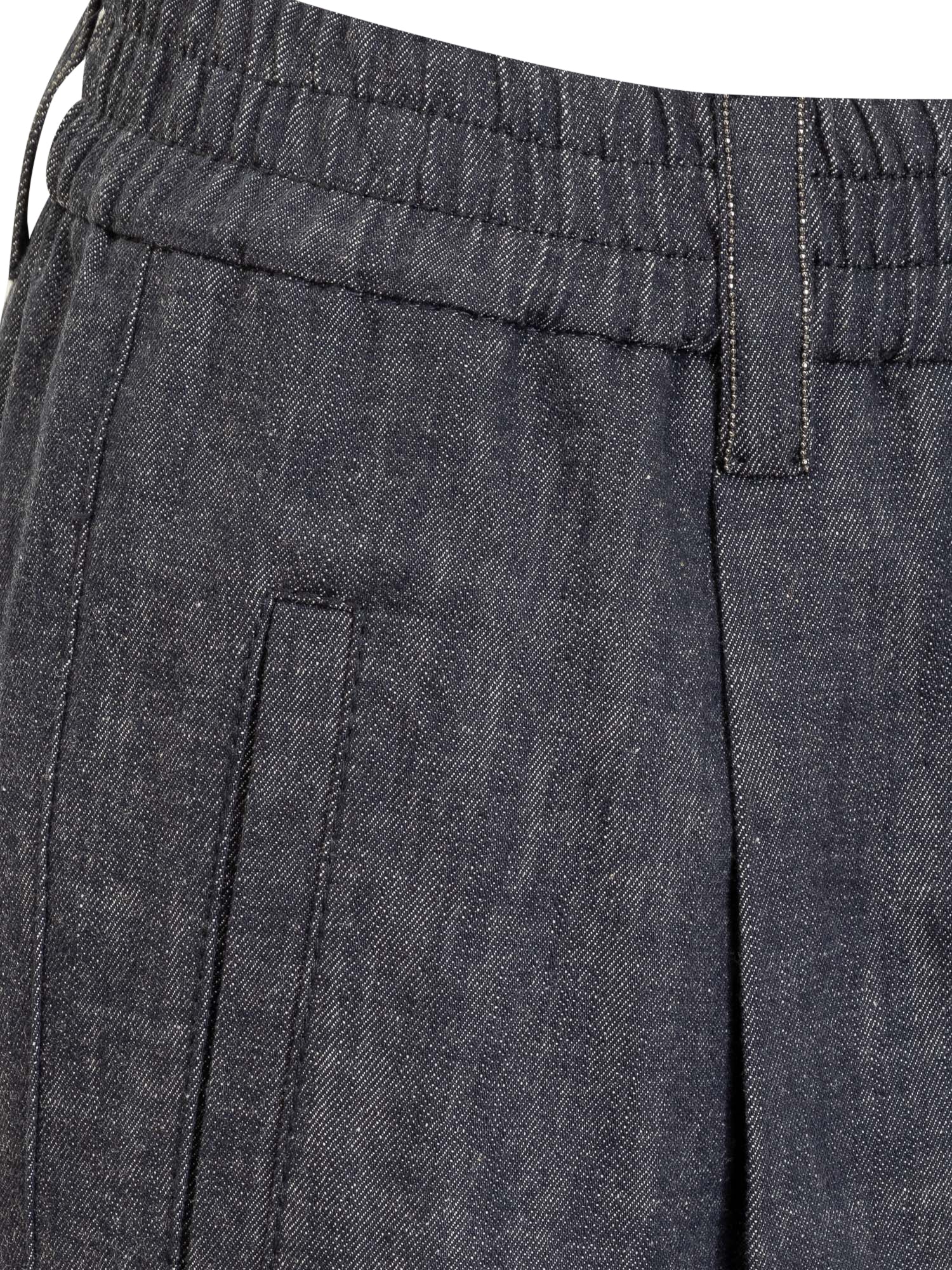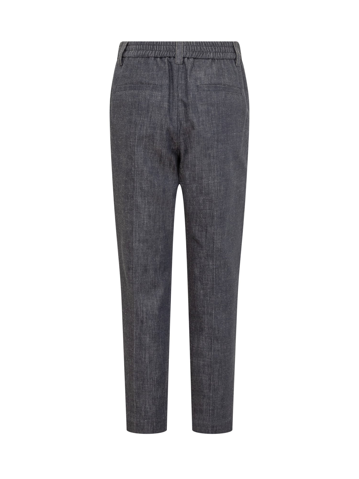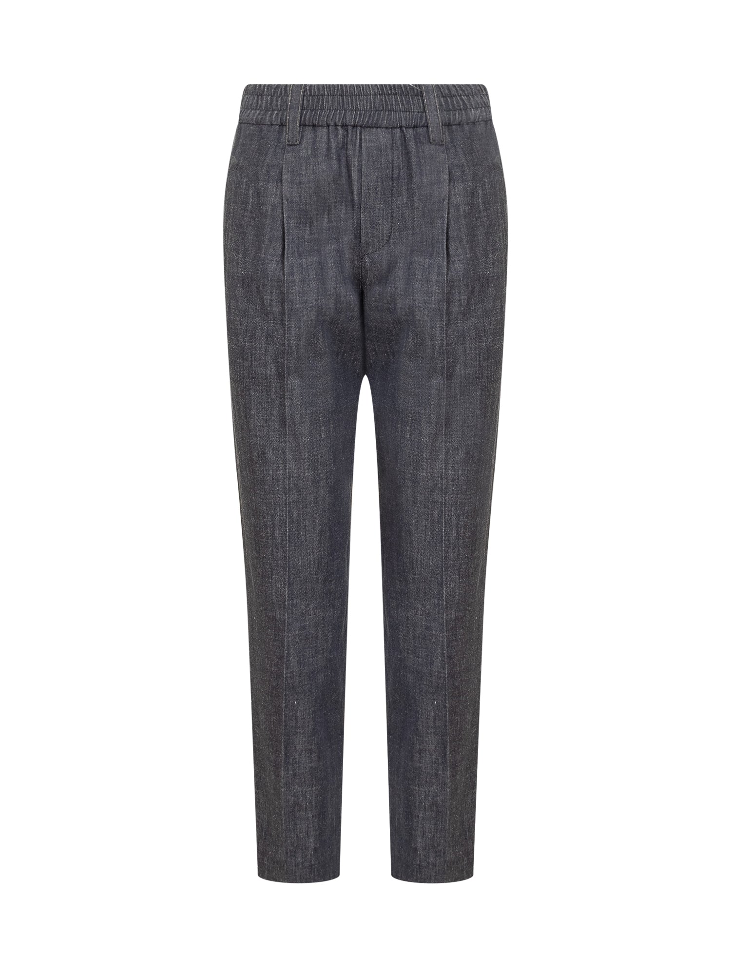 Pantalone lungo. Elastico in vita. Passanti per cintura. Quattro tasche. Pieghe sul davanti.