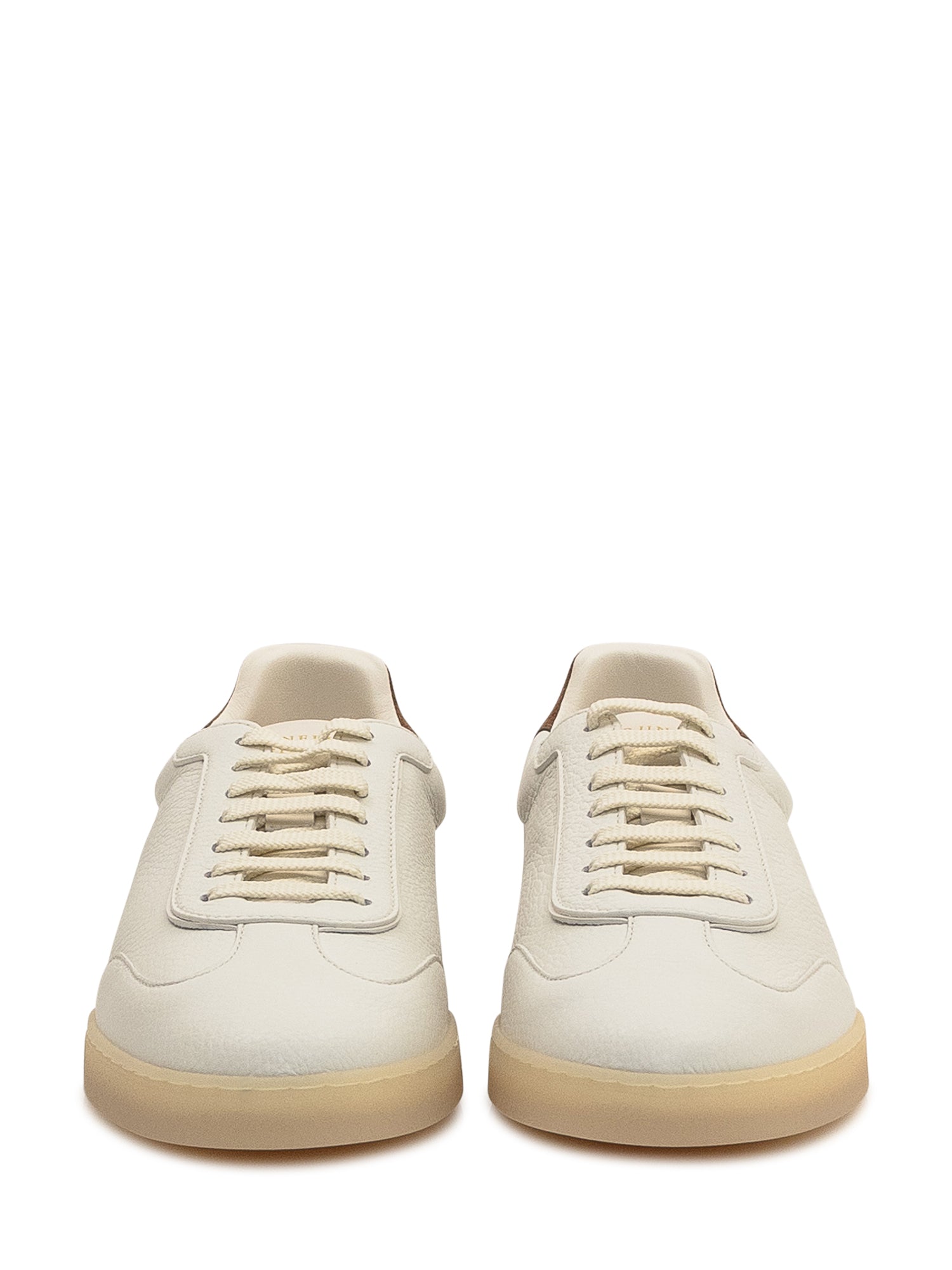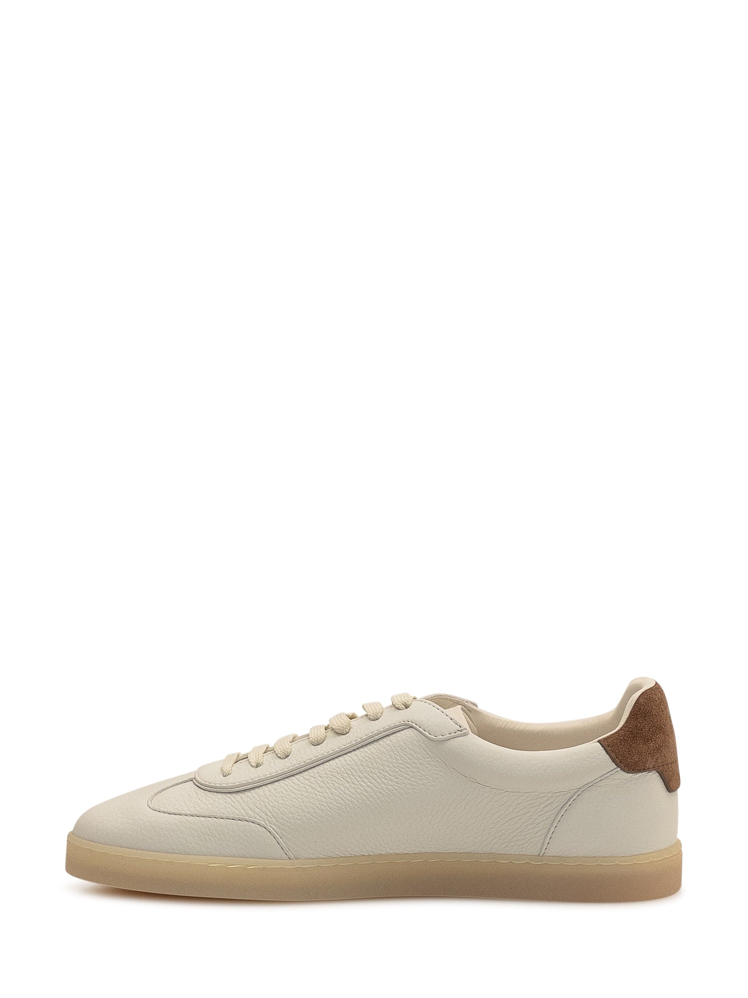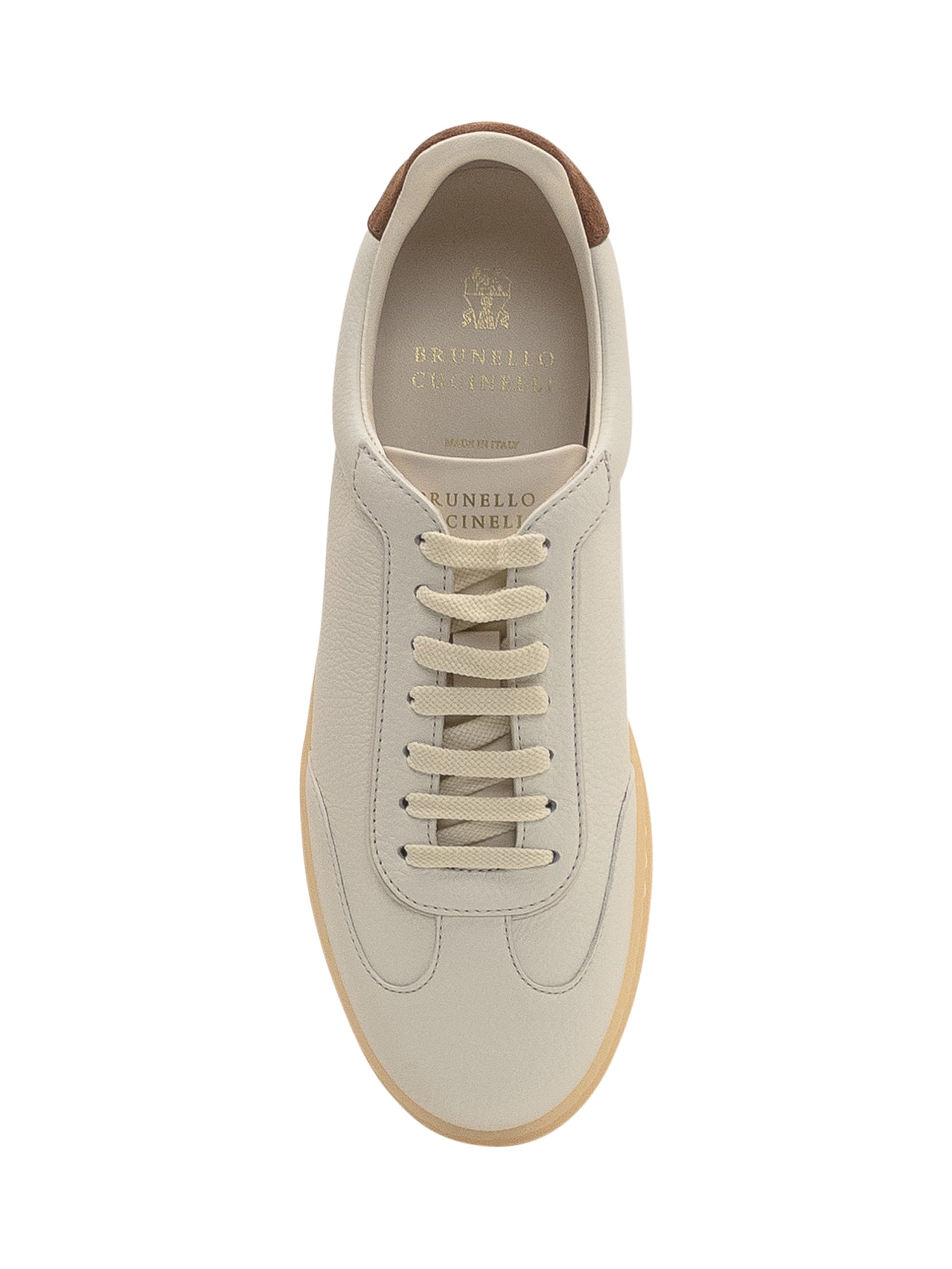 Sneakers Brunello Cucinelli in pelle martellata bianca con dettaglio in suede marrone sul tallone. Suola in gomma effetto naturale.
