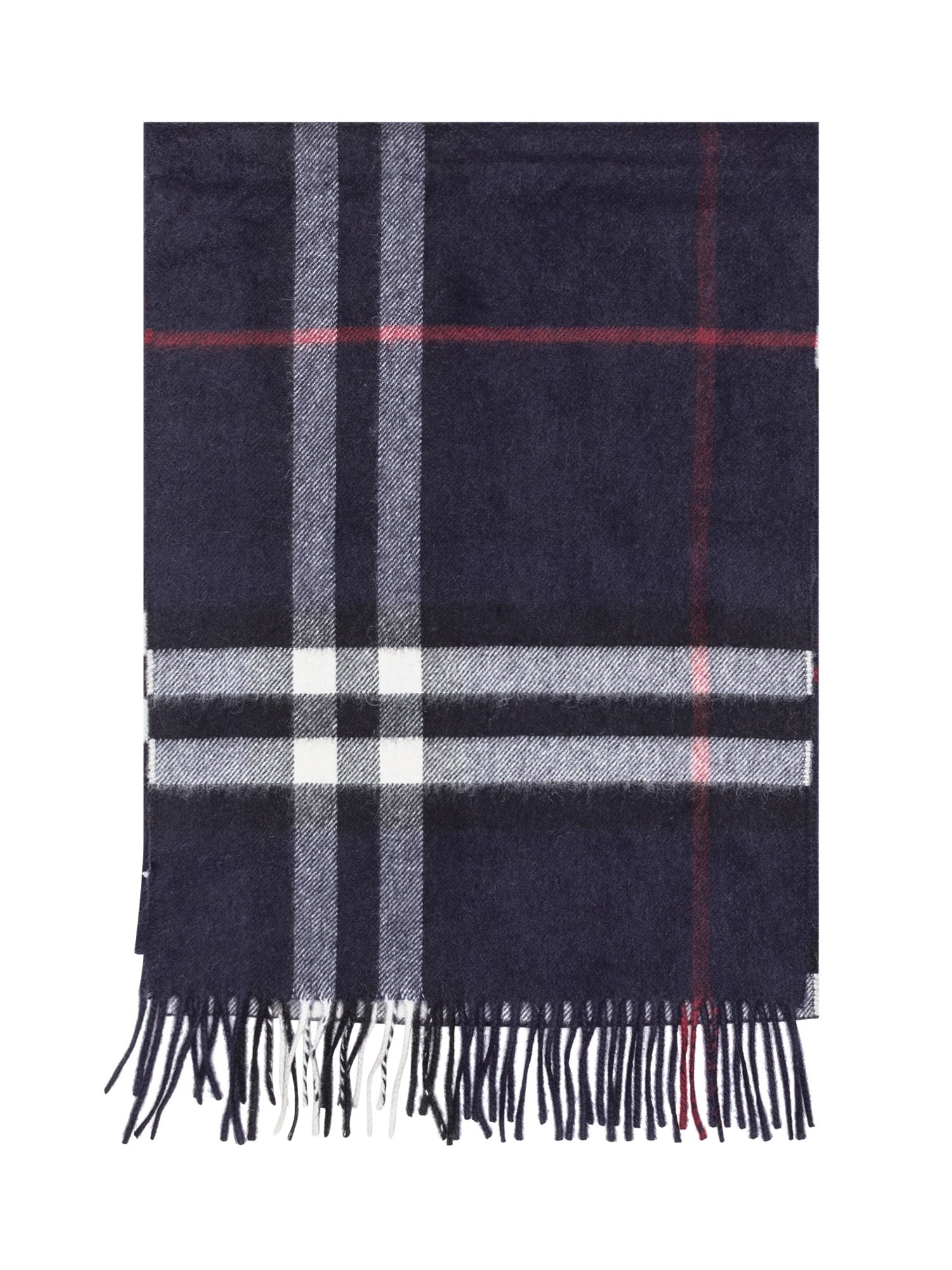 Sciarpa Burberry in soffice lana, con l iconico motivo check nei toni del blu, bianco e rosso.