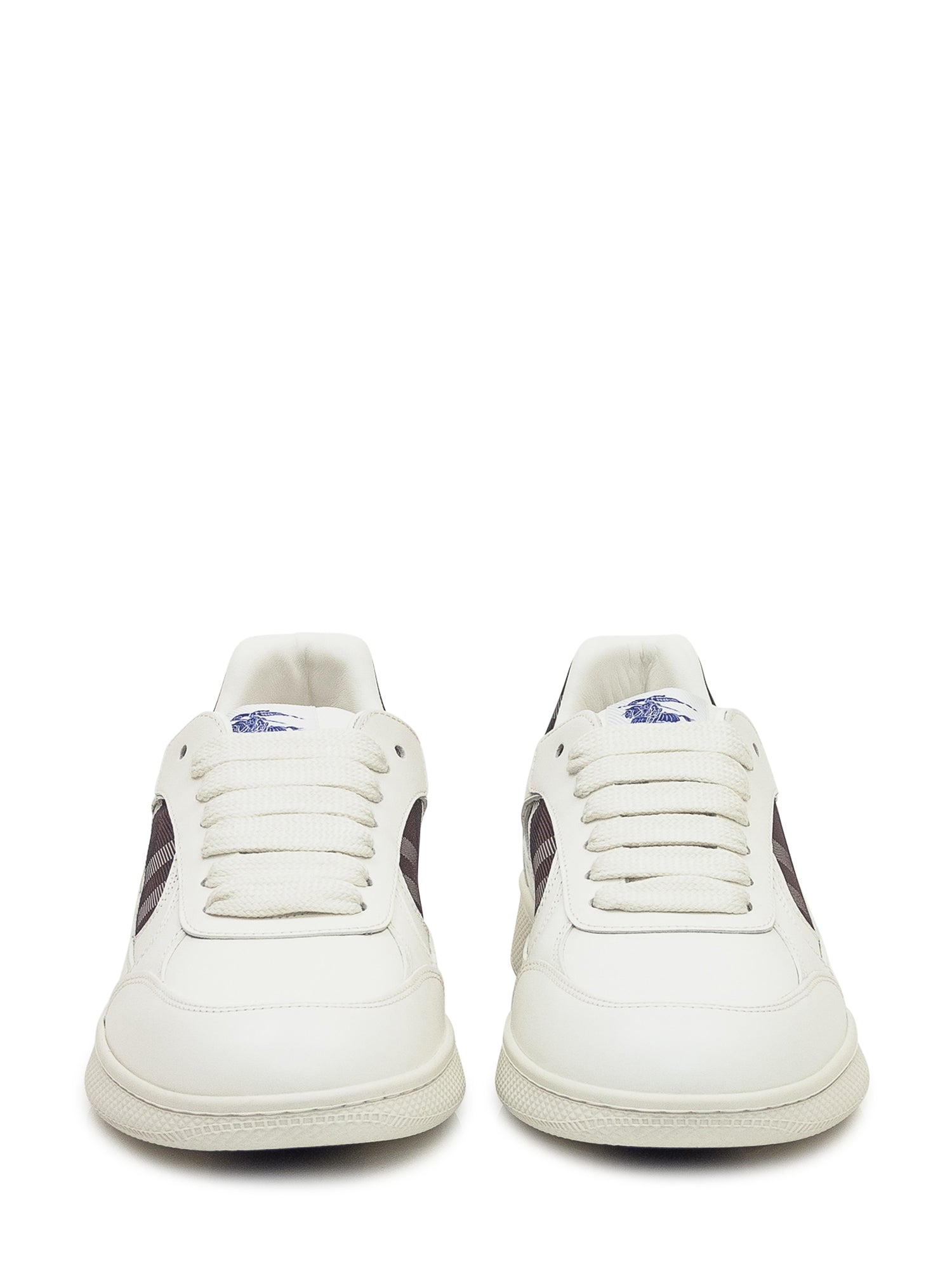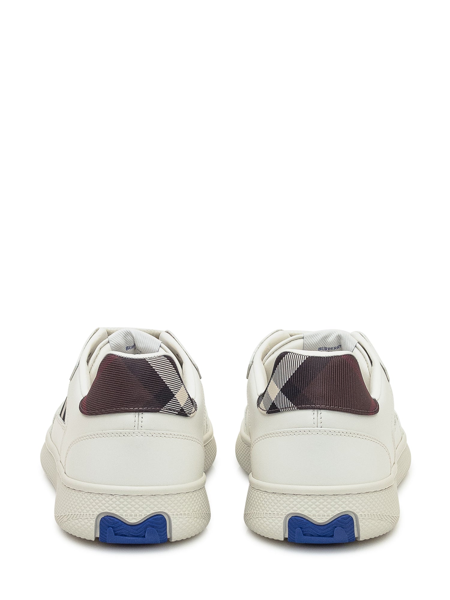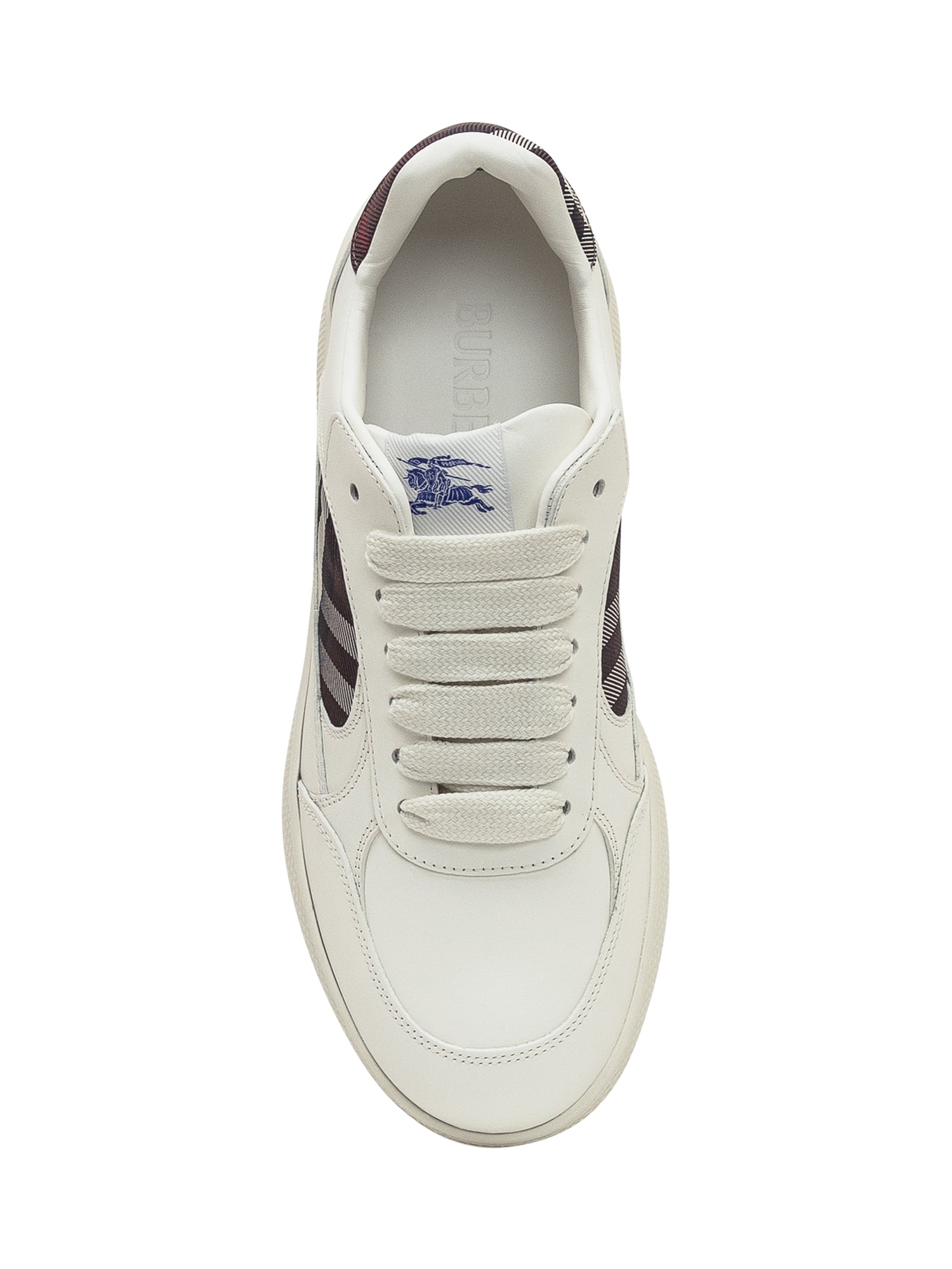 Sneakers Burberry in pelle bianca con inserti in tessuto check sui lati e sul tallone. Suola in gomma tono su tono.