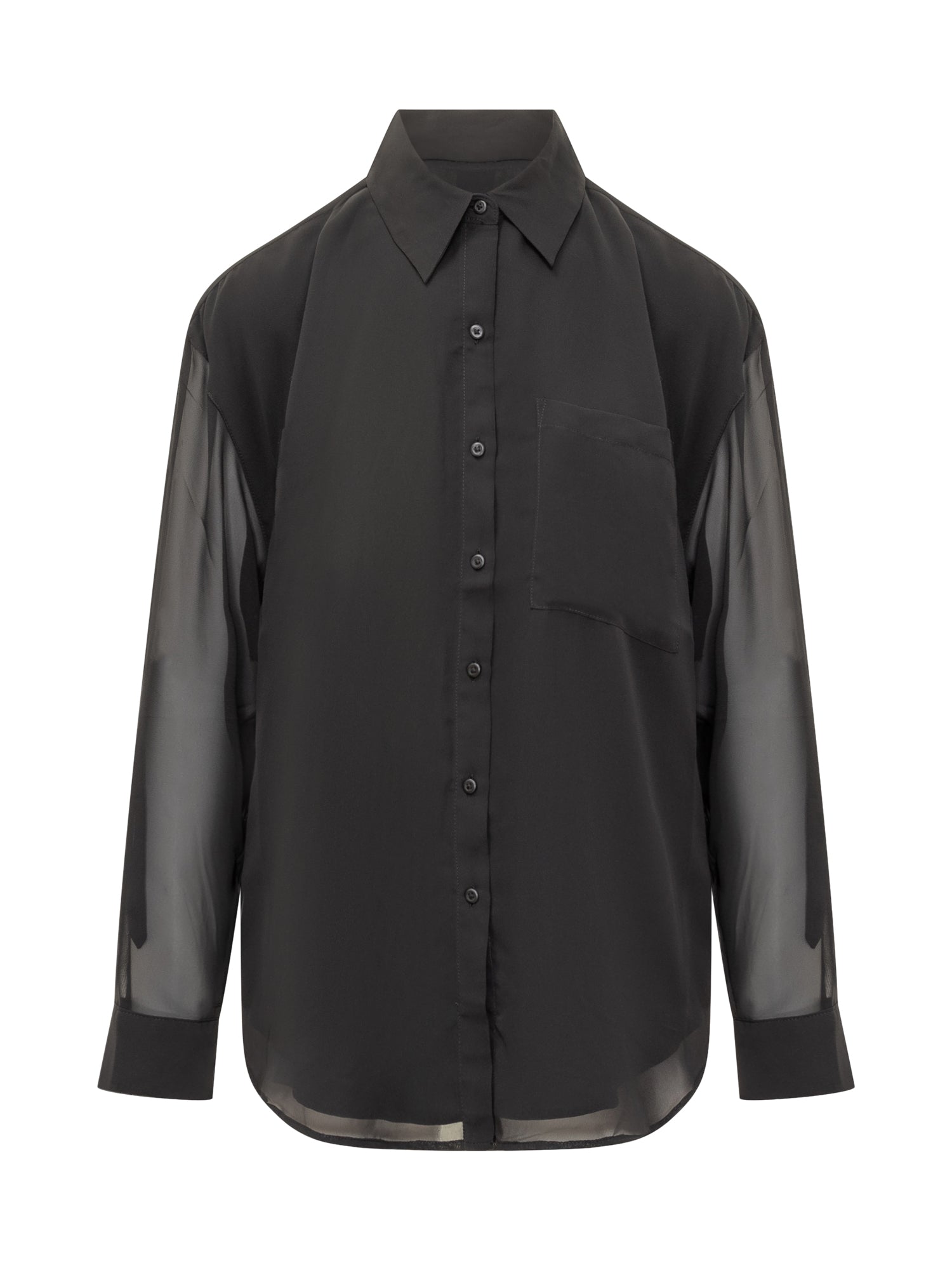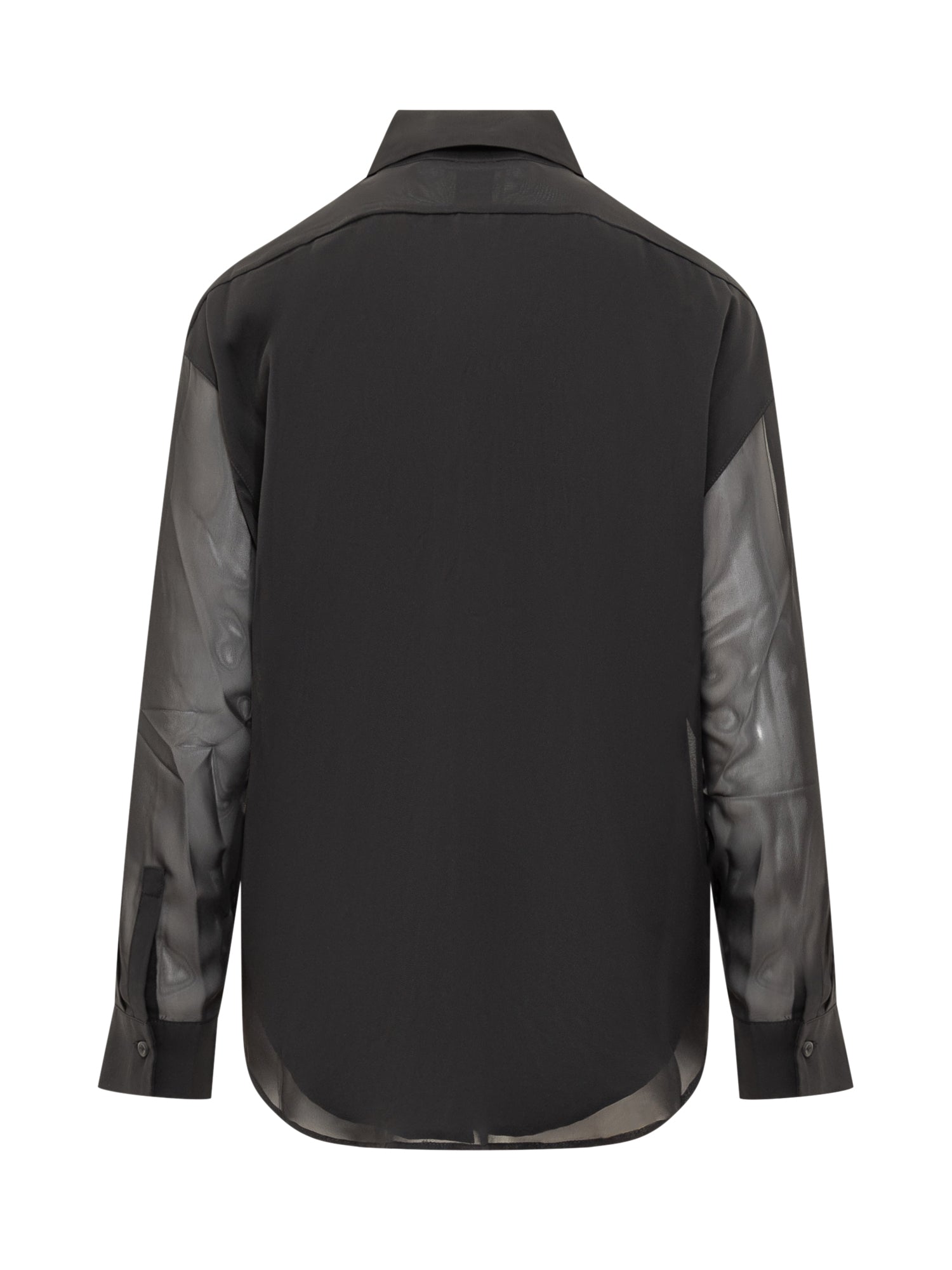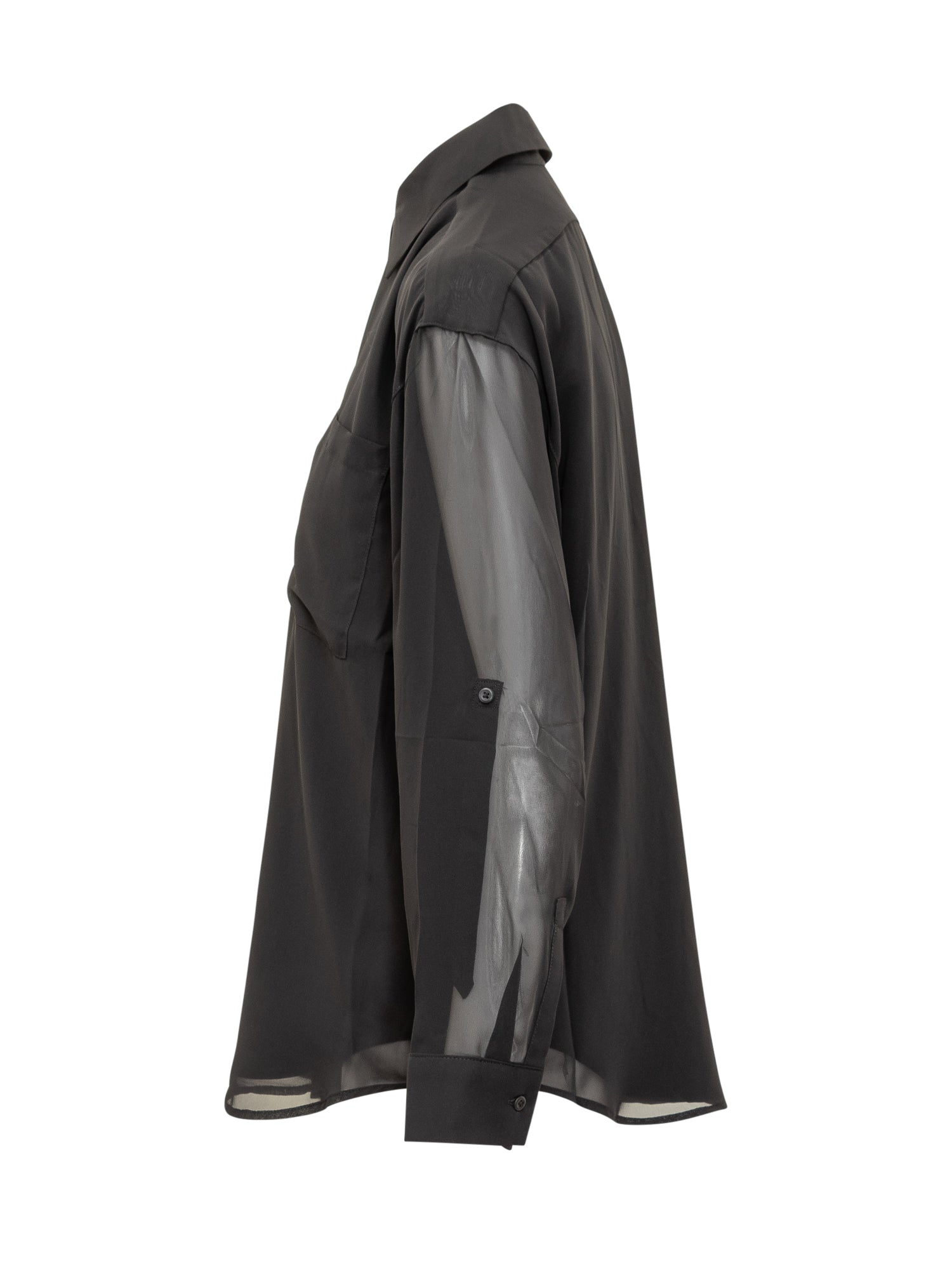 Camicia Calvin Klein in organza nera con maniche trasparenti e taschino frontale. Linea oversize e moderna.