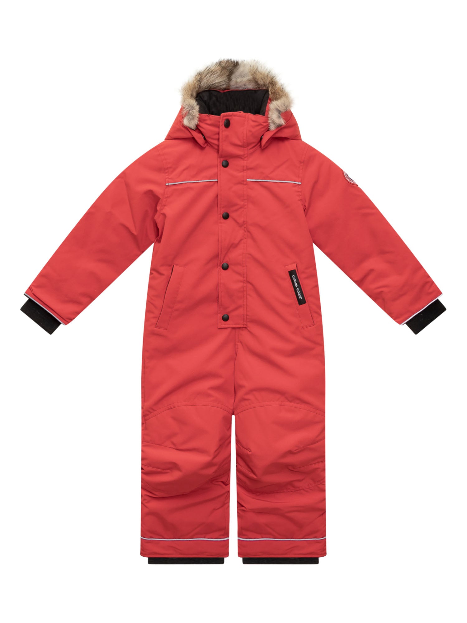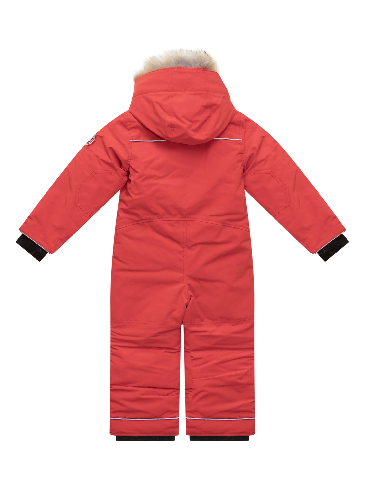 Tuta da neve rossa.Collo alto. Cappuccio in pelliccia rimovibile. Tasche laterali. Chiusura con bottoni. Logo sulla manica.