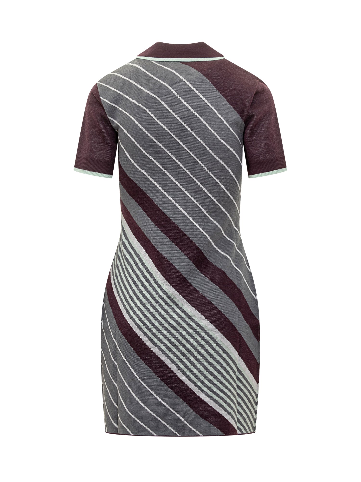 Abito corto Casablanca in maglia con design a polo, zip frontale e motivo geometrico a righe nei toni del bordeaux e grigio.