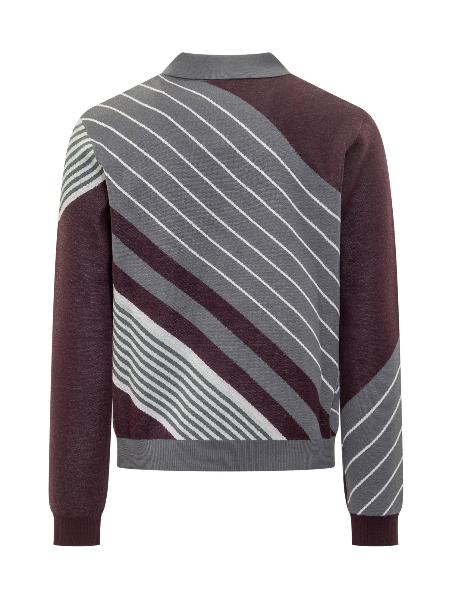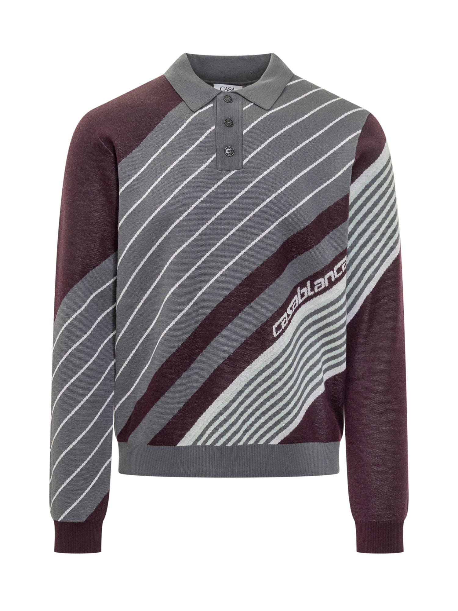 Maglia polo Casablanca in lana leggera con motivo a righe diagonali nei toni grigio e bordeaux. Colletto a tre bottoni e logo jacquard donano un tocco sportivo e sofisticato.