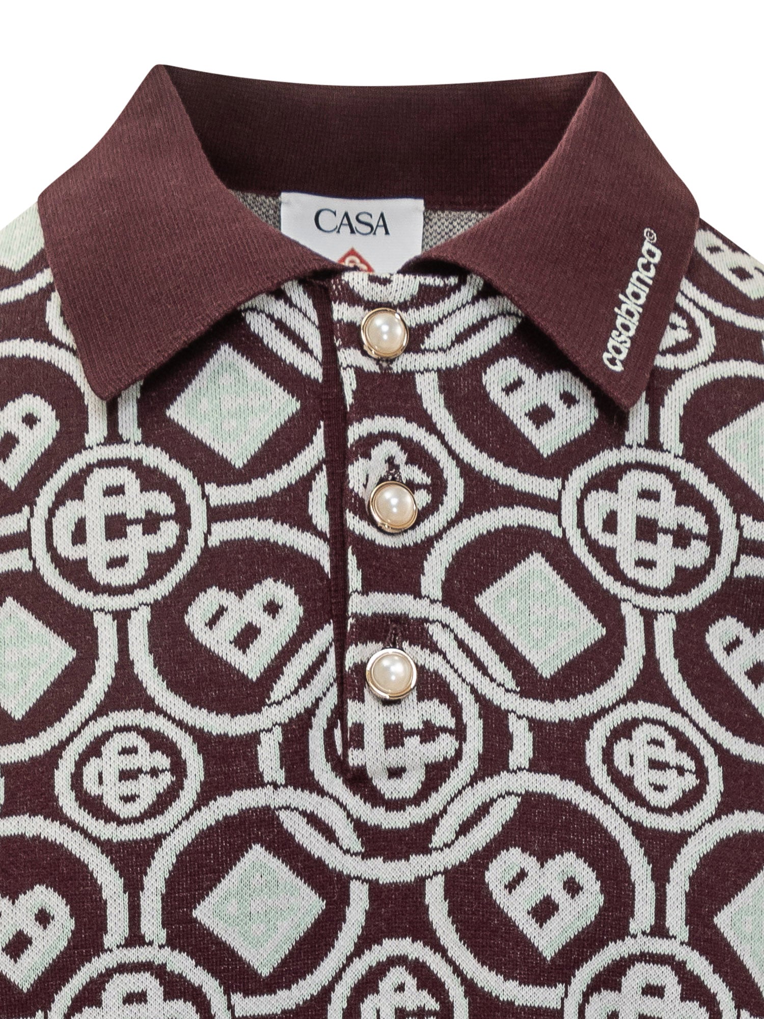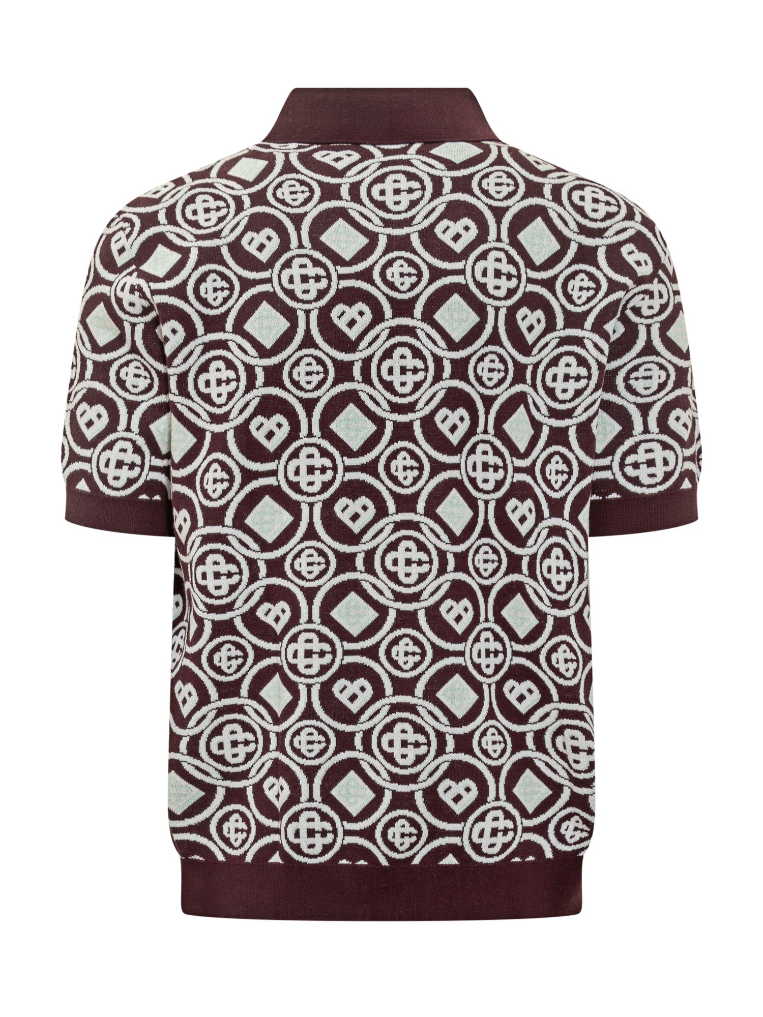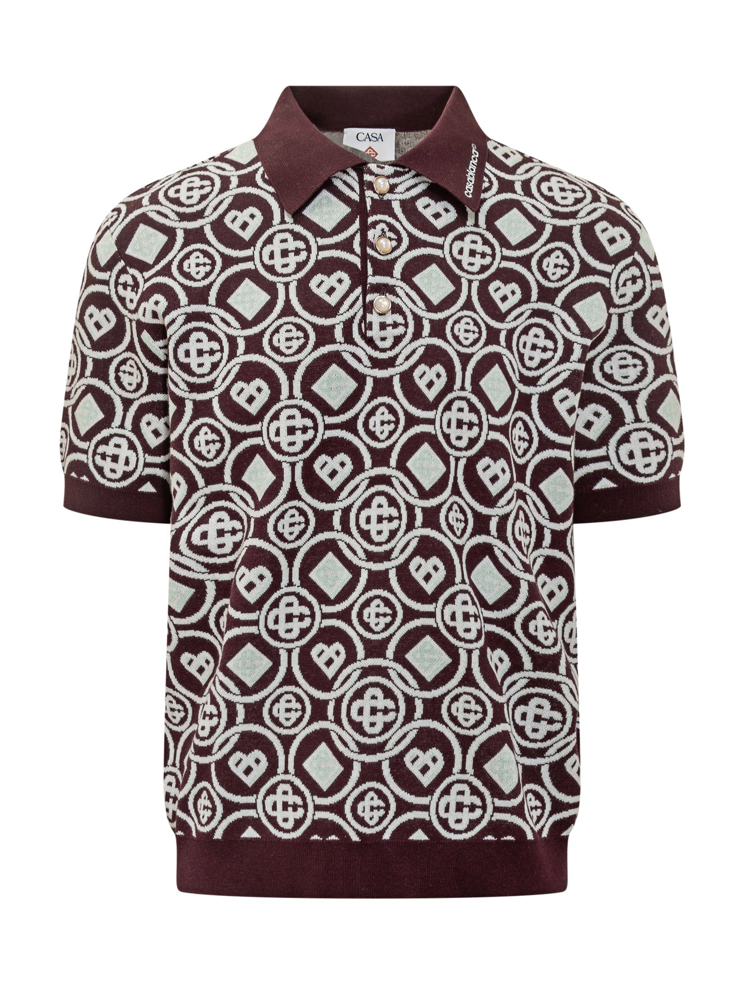 olo Casablanca a maniche corte in maglia bordeaux con motivo logo all over a contrasto e colletto con bottoni.