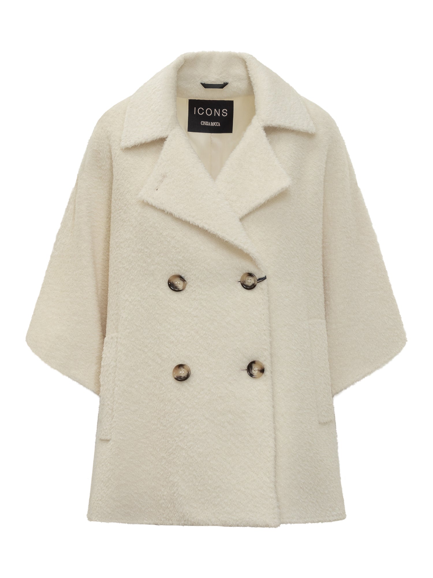 Cappotto corto Cinzia Rocca doppiopetto in lana bouclé con maniche ampie e bottoni a contrasto.