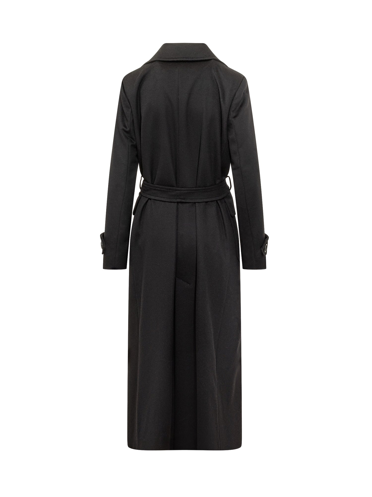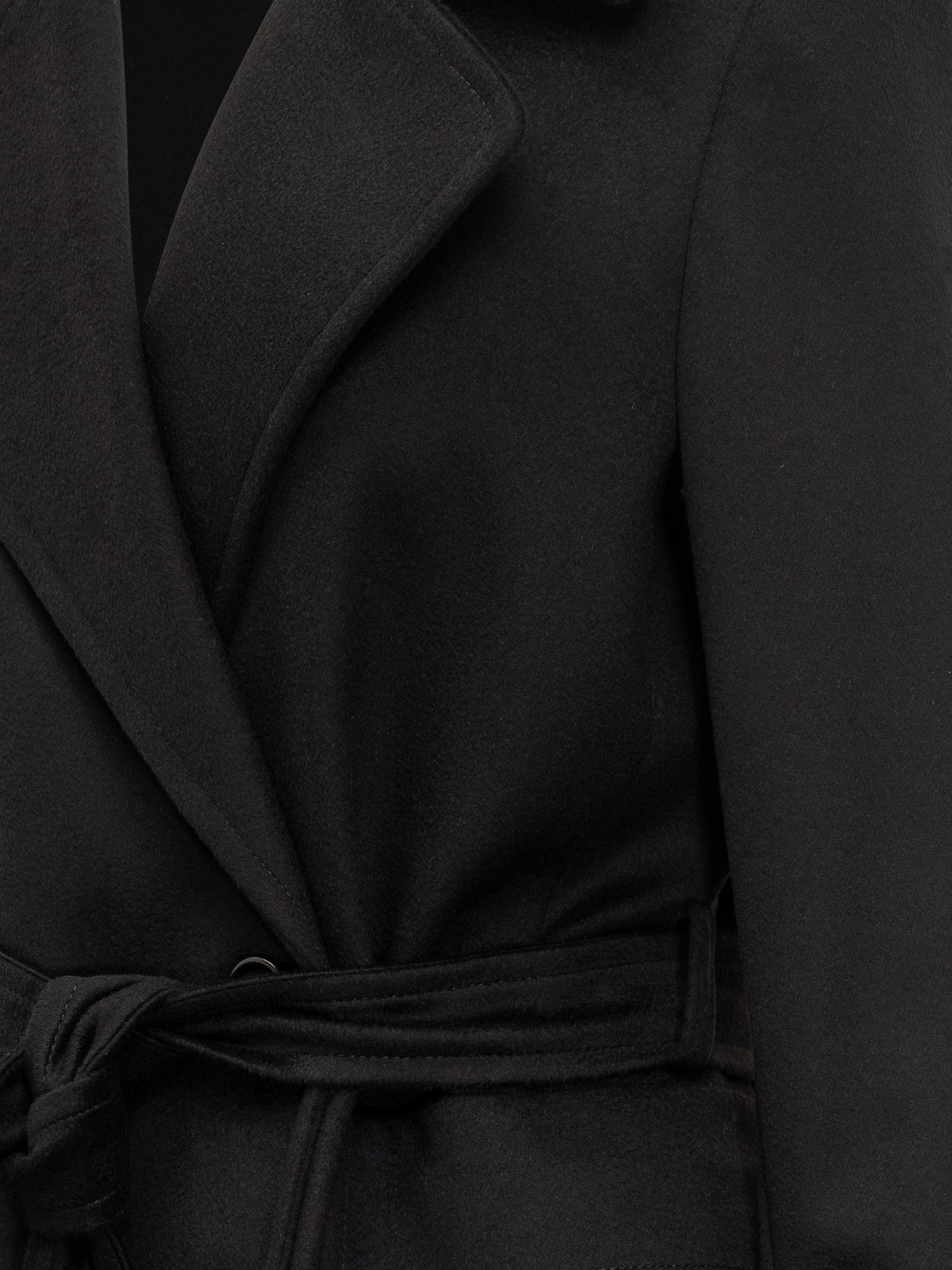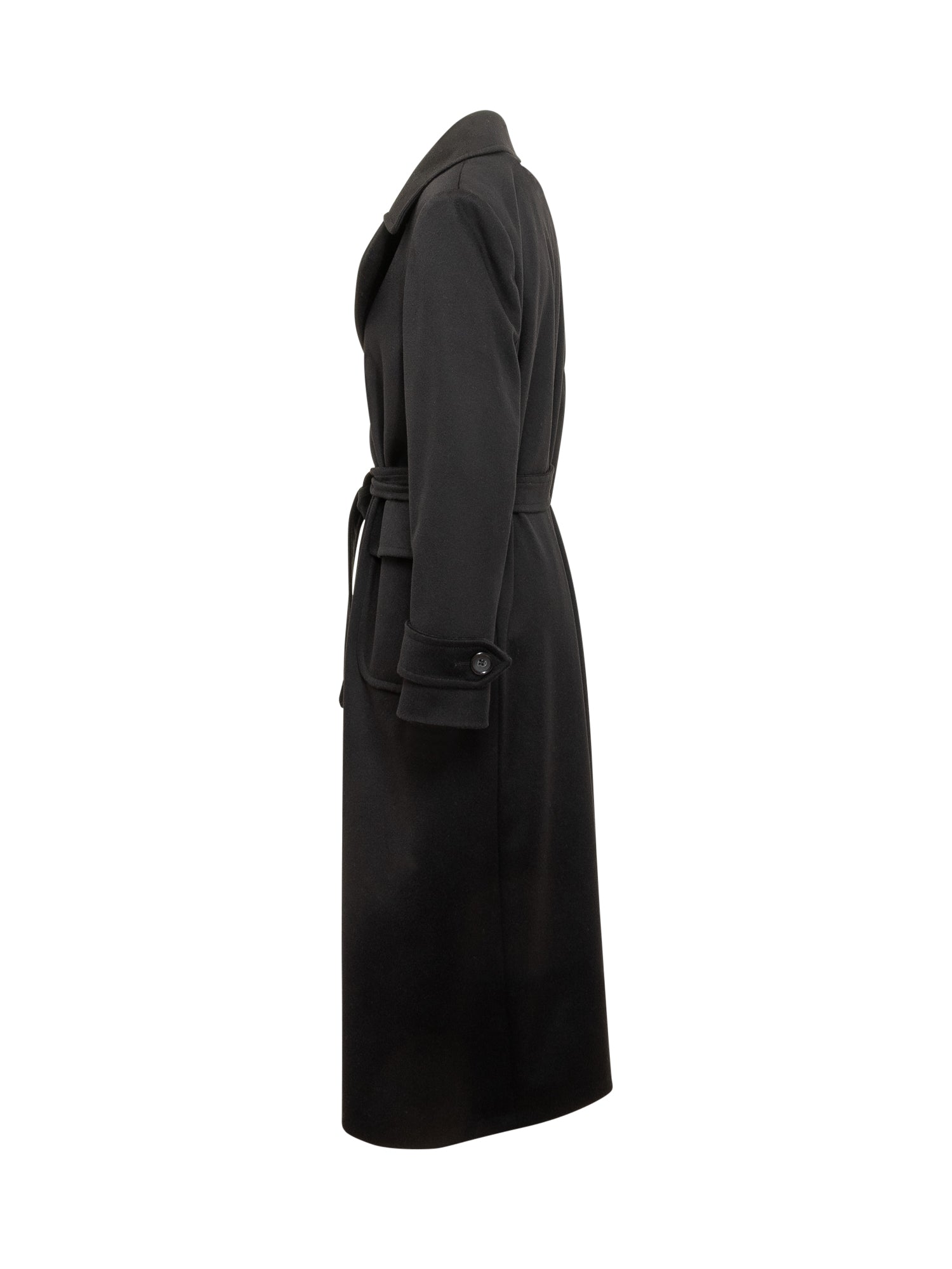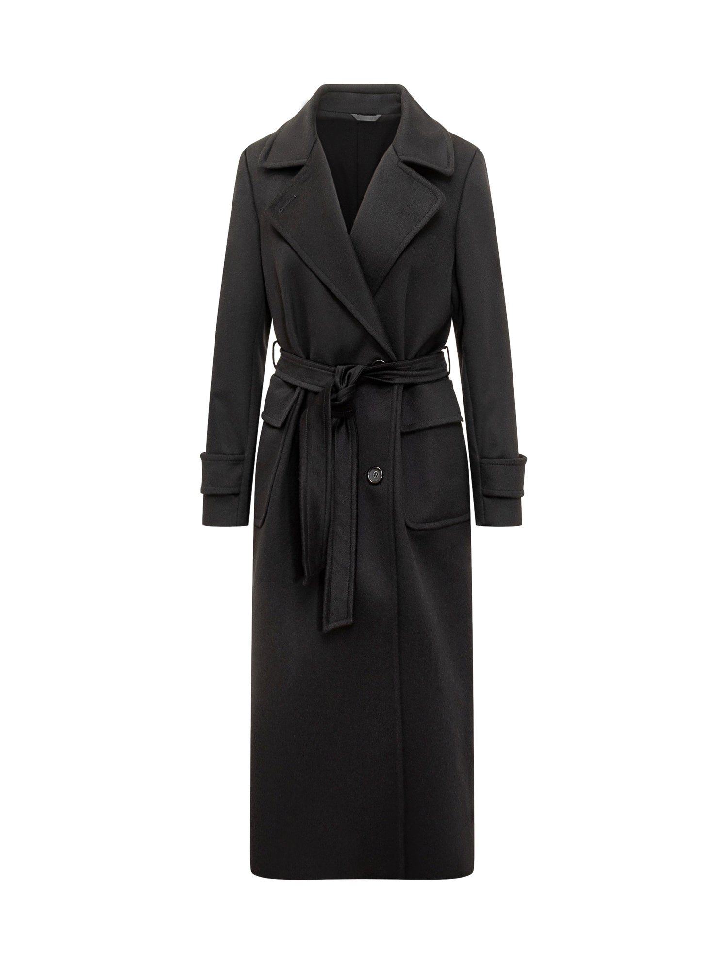 Cappotto lungo Cinzia Rocca in pregiato cashmere nero con cintura in vita. Modello elegante con revers classico, tasche applicate e chiusura a bottoni.