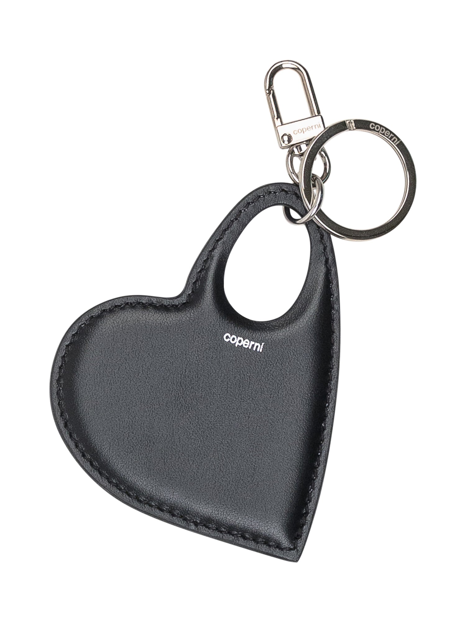 Portachiavi Coperni a forma di cuore in pelle nera con logo stampato. Dotato di anello metallico e moschettone con incisione.