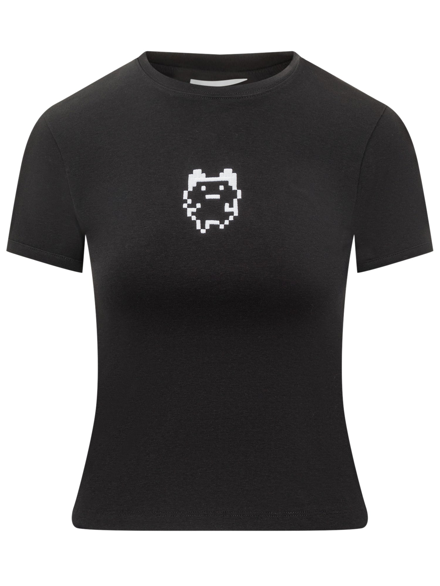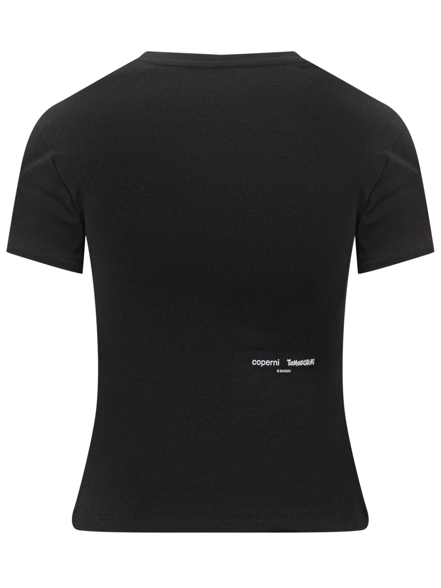 T-shirt nera Coperni x Tamagotchi in cotone con grafica pixelata sul petto.